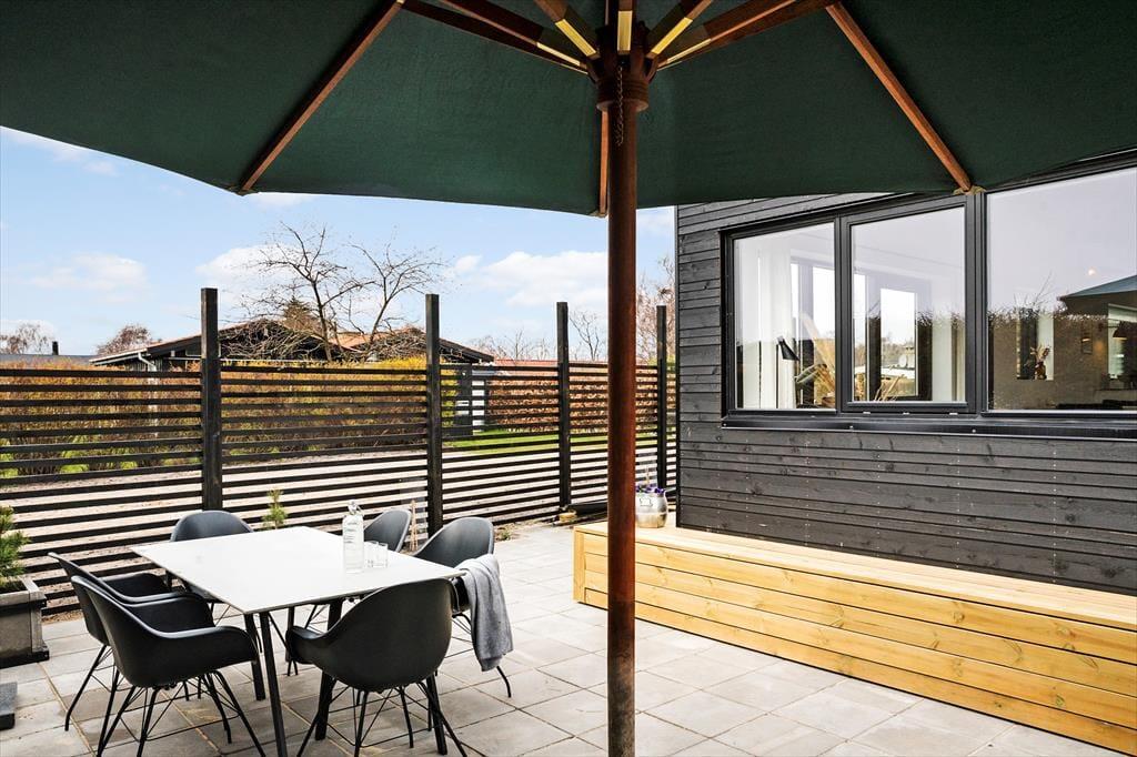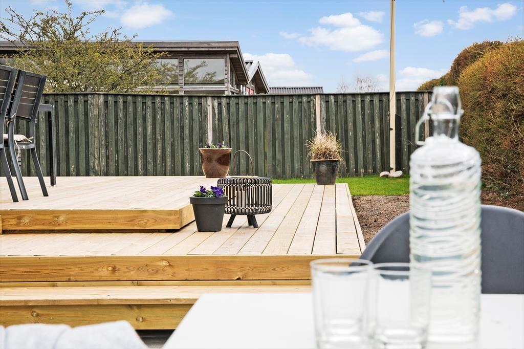 Sommerhuset har flere forskellige terrasseniveauer, hvor solen kan nydes hele dagen, til langt ude på aftenen. Her kan der rigtig slappes af, uanset om I ønsker at slappe af i liggestolene eller med et godt brætspil med sammen familien. Om aftenen kan I tænde op i grillen og nyde et lækkert måltid i den danske sommer. På terrassen er der udendørs bruser, der er særligt god efter en hel dag ved stranden.