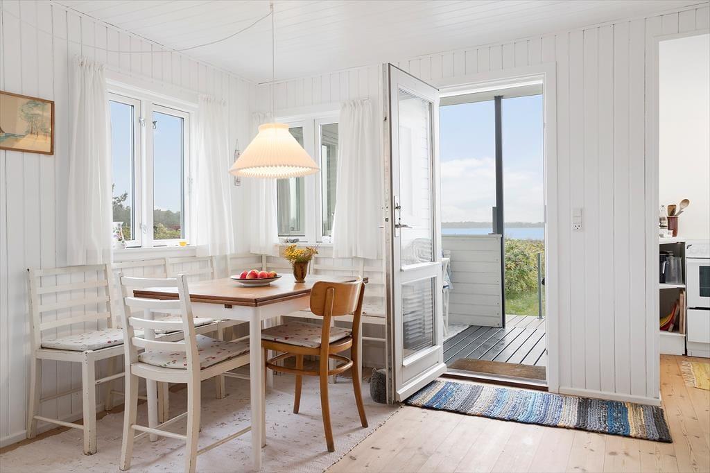 En unik bolig i særklasse hvor I bor med fødderne i vandkanten og har en fantastiske udsigt over bugten i Juelsminde bugt. Lige uden for døren er der badestrand som man kan hoppe i. Sommerhuset fremstår lyst og venligt. Fra køkkenet, hvor udsigten kan nydes under madlavningen, er der adgang til stuen med sofagruppe samt spisebordet som selvfølgelig har havudsigt.