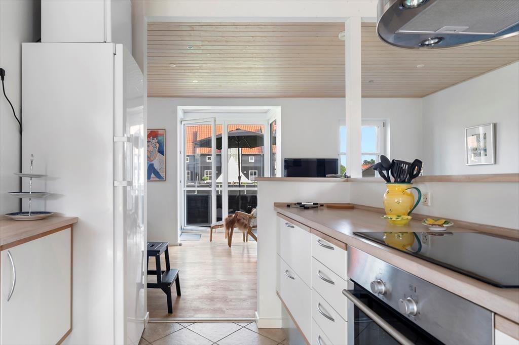 I stueetagen finder du en hyggelig stue med direkte adgang til en åben terrasse, hvor du kan nyde udsigten eller fordybe dig i en god bog. Det åbne køkken er fuldt udstyret og klar til at imødekomme dine kulinariske eventyr. Køkkenets åbne design skaber en behagelig forbindelse mellem madlavning og samvær, så du kan deltage i samtaler med familien eller venner, mens du tilbereder lækker mad.