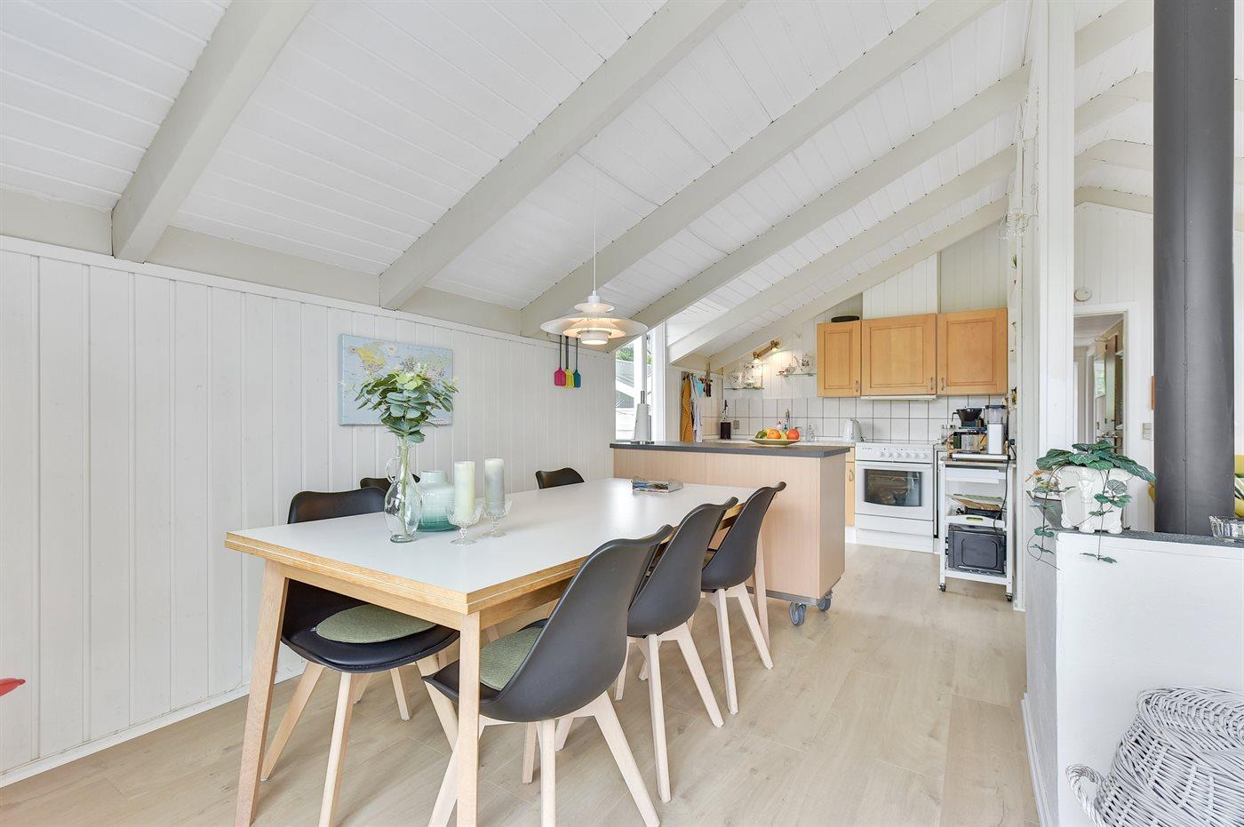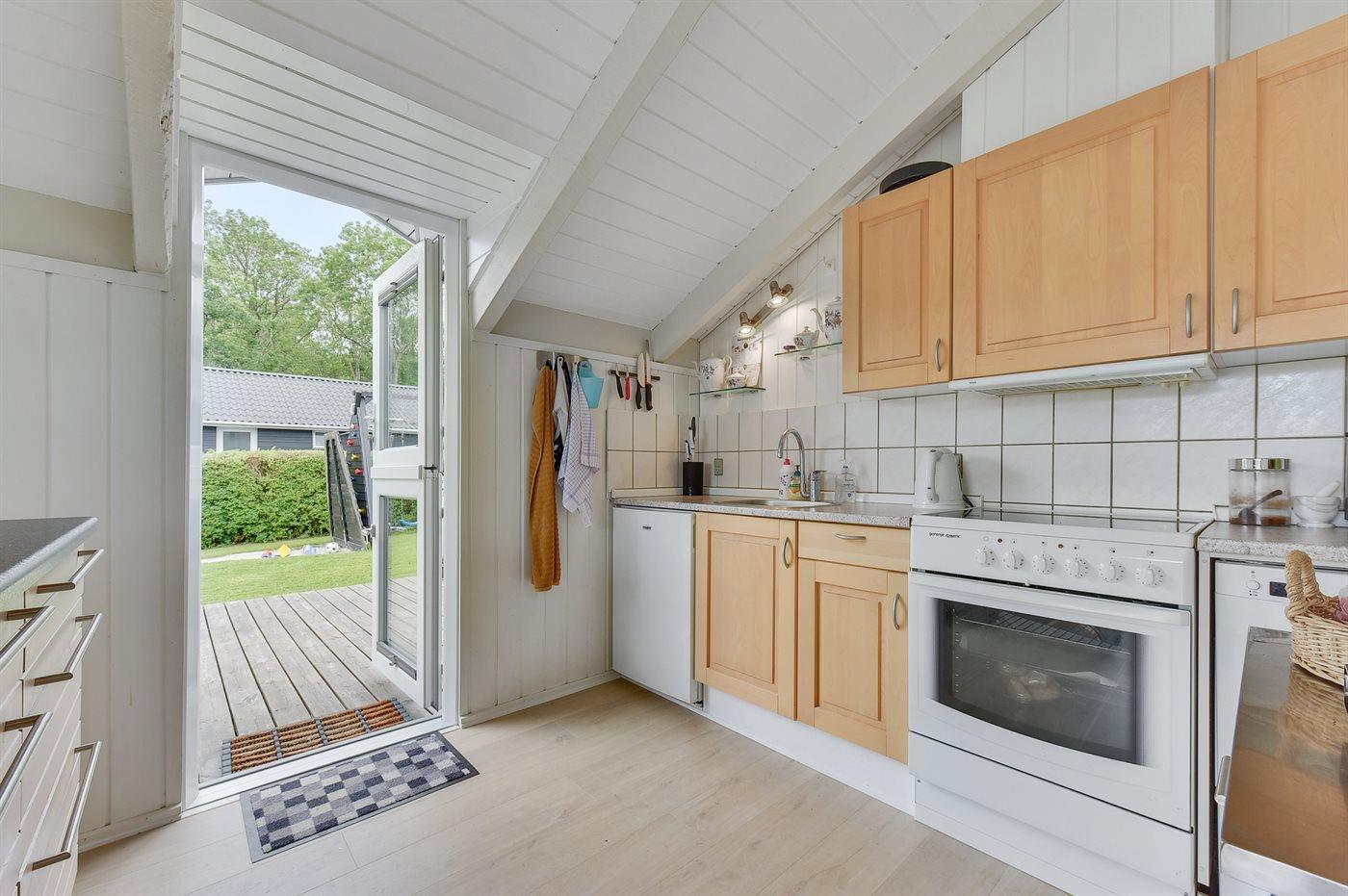 Køkkenet er udstyret med 1 køleskab. Der er 4 keramiske kogeplader, varmluftovn, mikrobølgeovn samt opvaskemaskine.