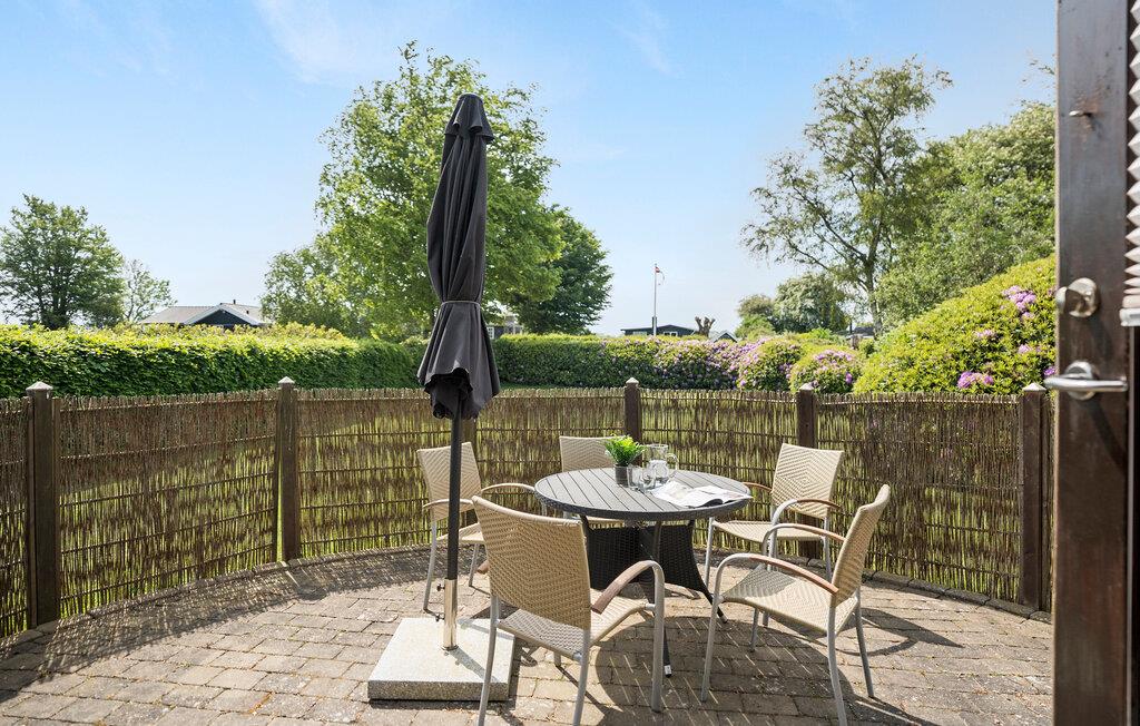 Til huset hører en skøn terrasse, der er delvist overdækket, så I kan finde sol og skygge efter behov på de varme dage. Start stille og roligt ud med en god kop kaffe og lad børnene løbe rundt og lege i haven, inden I tager på tur.