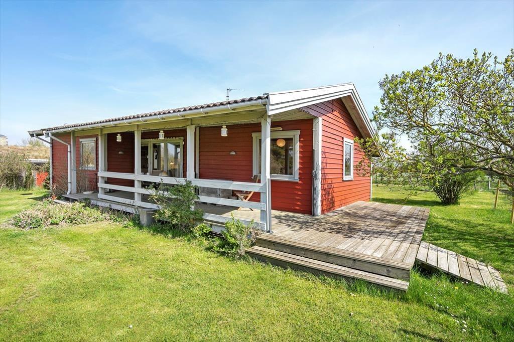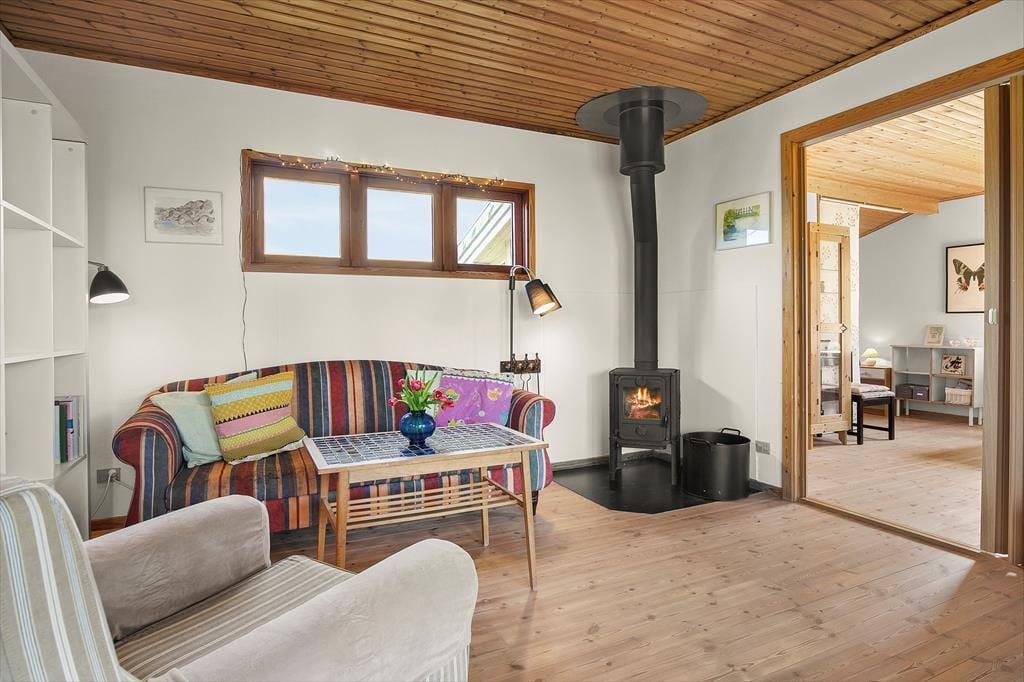 Hyggeligt sommerhus ved Kelstrup Strand med brændeovn, internet og stor grund med legehus.