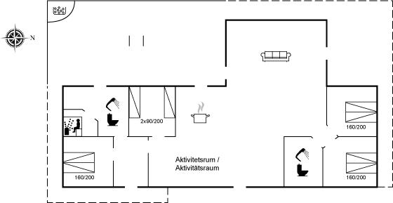 Der er i alt 4 soveværelser. Sovepladserne fordeler sig på: 6 sovepladser i dobbeltsenge. 2 sovepladser i enkeltsenge. 2 sovepladser på madrasser. 2 af disse sovepladser befinder sig på husets hems. Derudover er der 1 stk. barneseng.