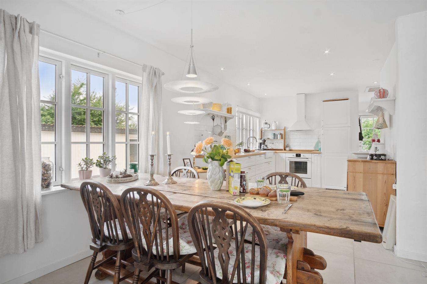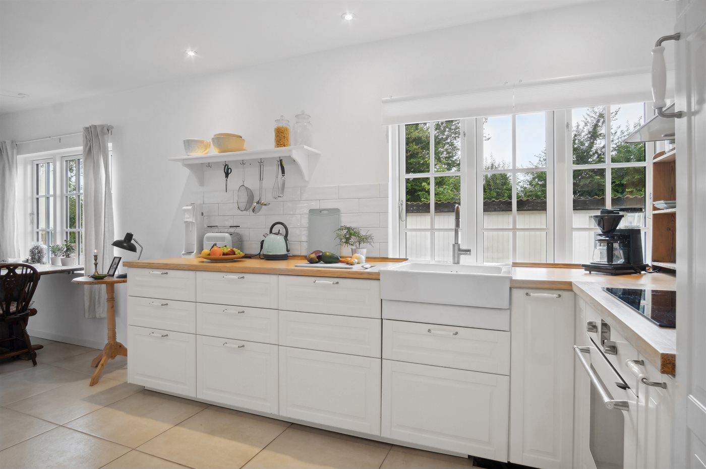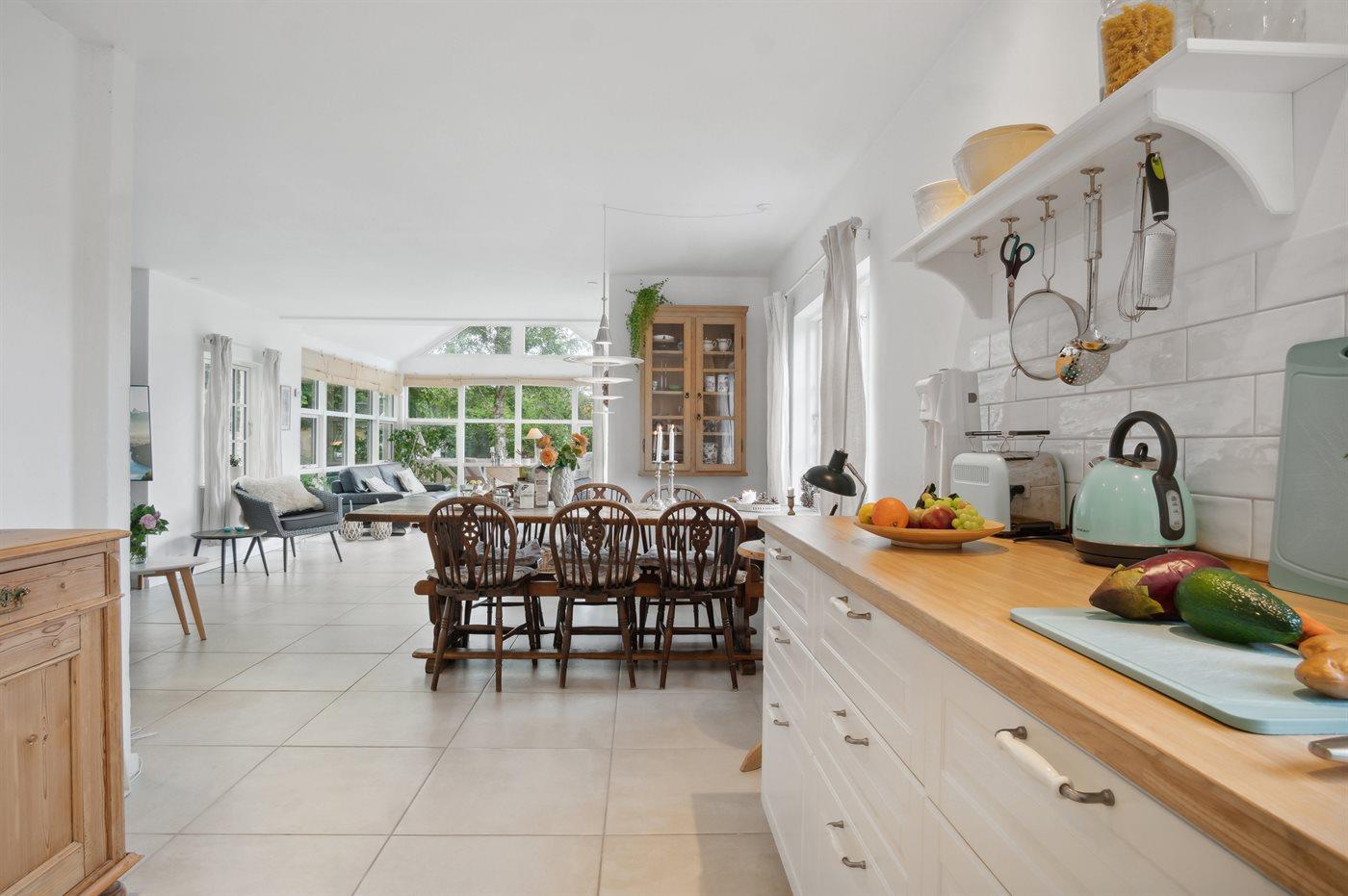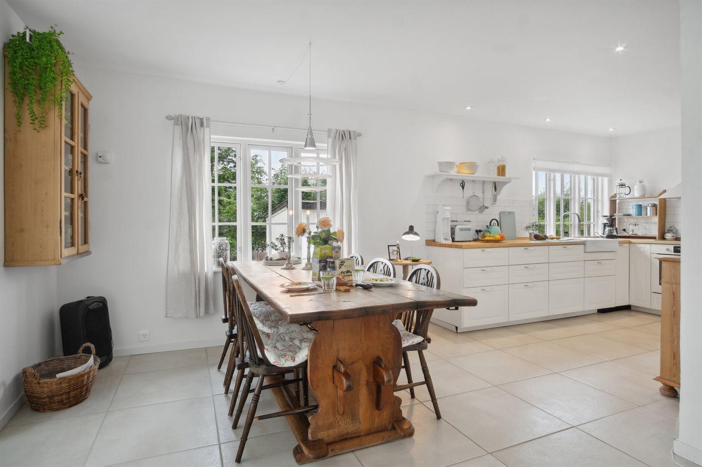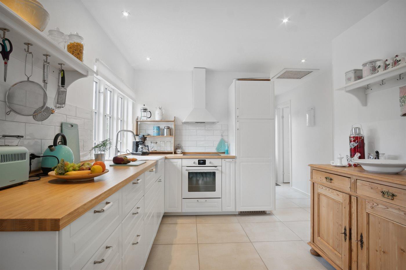 Køkkenet er udstyret med 1 køleskab. Der er 4 induktionskogeplader, varmluftovn, mikrobølgeovn samt opvaskemaskine.