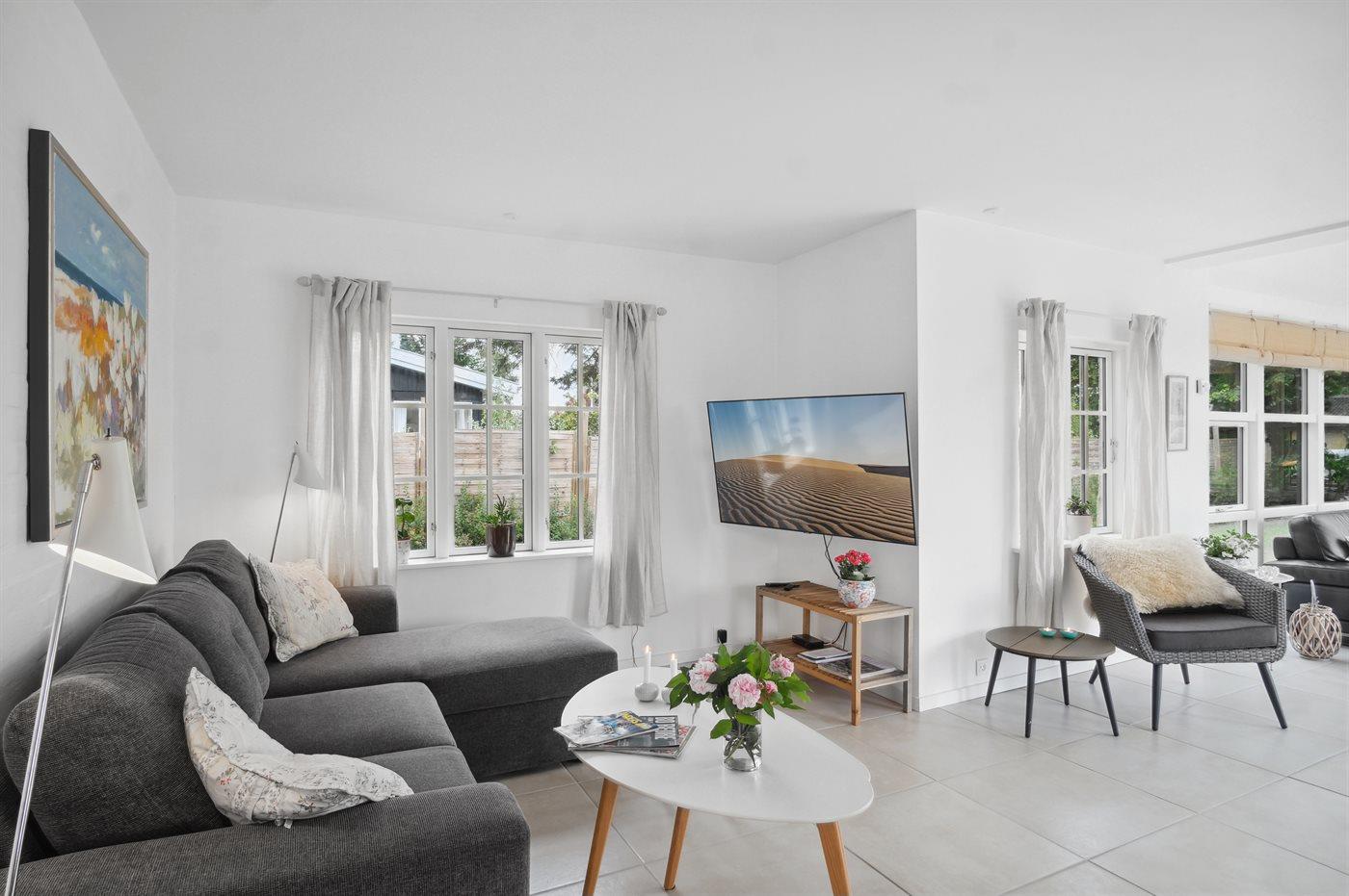 Dette lyse og indvendigt gennemrenoverede sommerhus er beliggende i et roligt sommerhusområde og med kun 200 meter til stranden. Huset er energivenligt med luft til vand varmepumpe og med gulvvarme i alle rum. Huset er lyst og stilfuldt indrettet med et flot, stort køkkenalrum, hvor der er god plads til hele familien. I den lyse tilbygning med stue er der masser af lysindfald fra de store vinduespartier. Der er 2 soveværelser med hver 2 sovepladser, og så er der en dobbelt sovesofa i stuen med yderligere 2 sovepladser. Badeværelset har bruseniche, og der er vaskemaskine og tørretumbler. Fra stuen er der udgang til en stor syd- og vestvendt træterrasse.