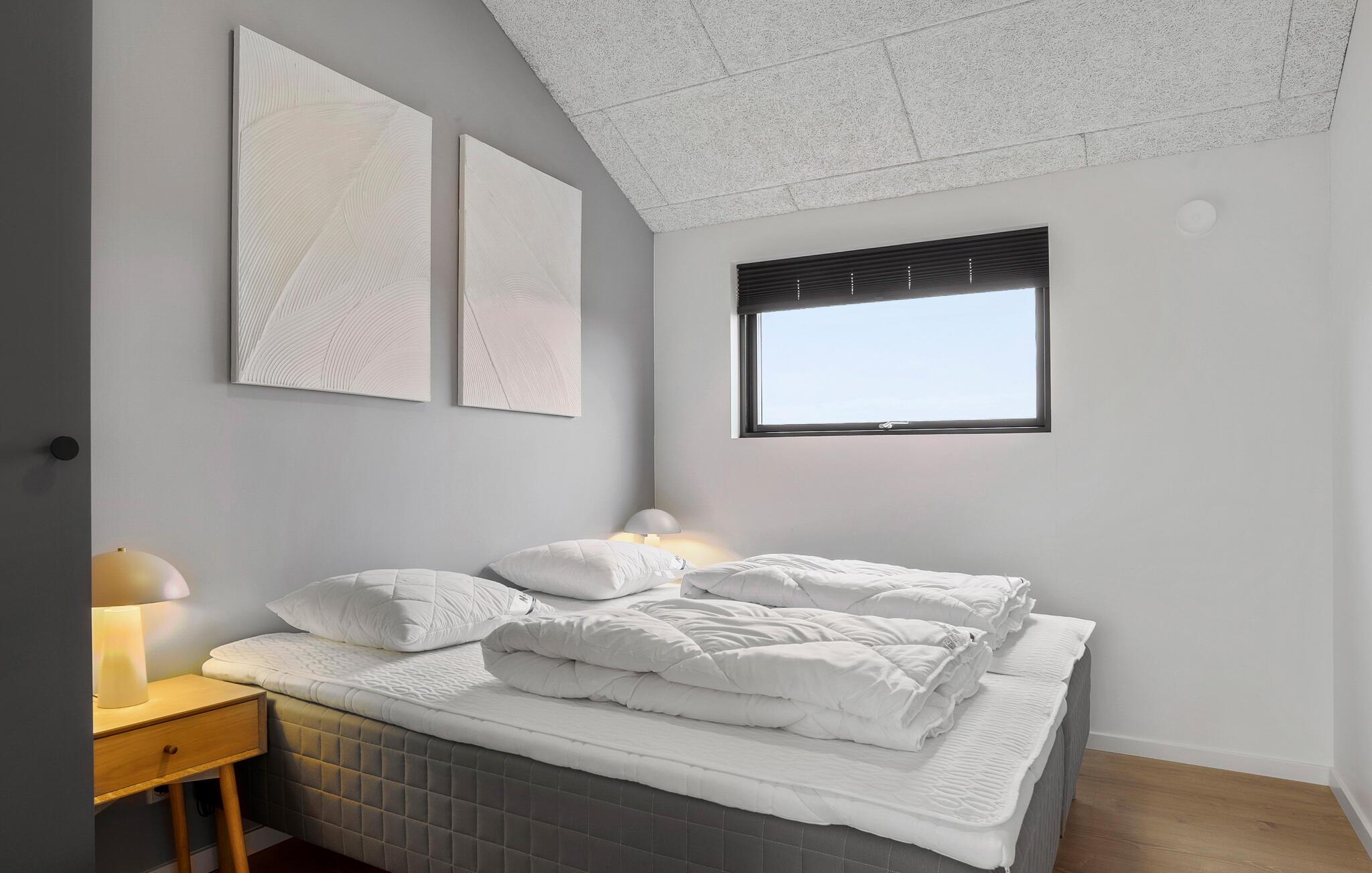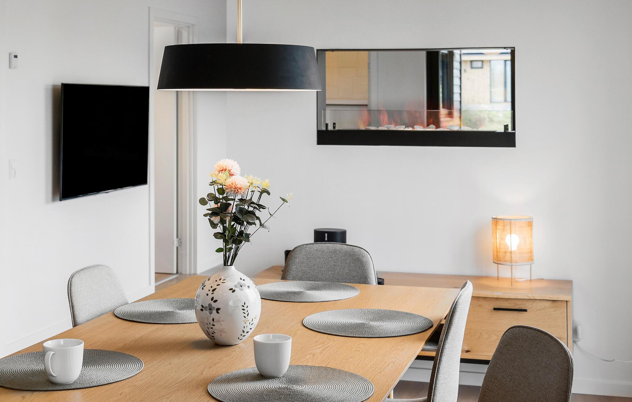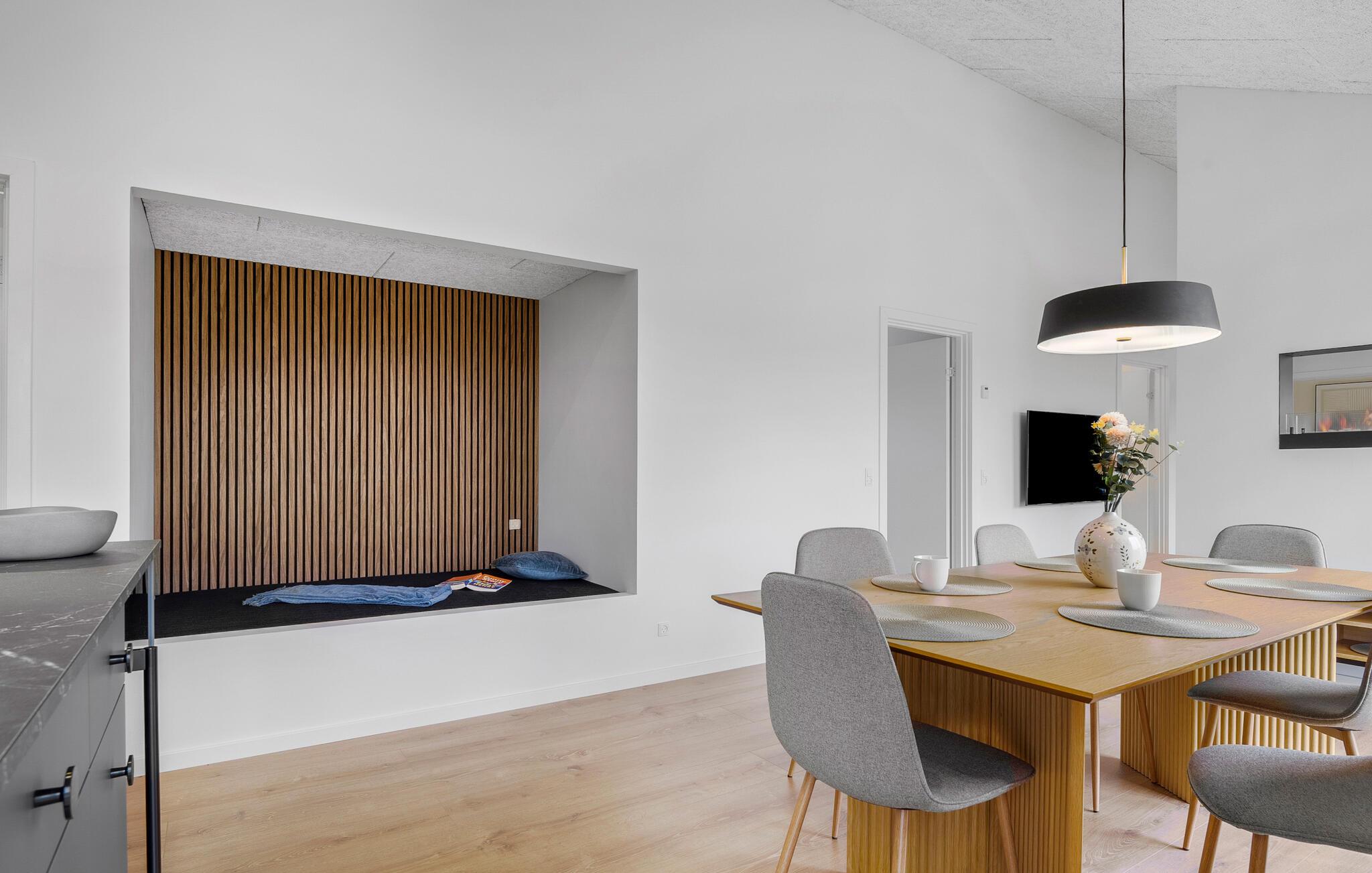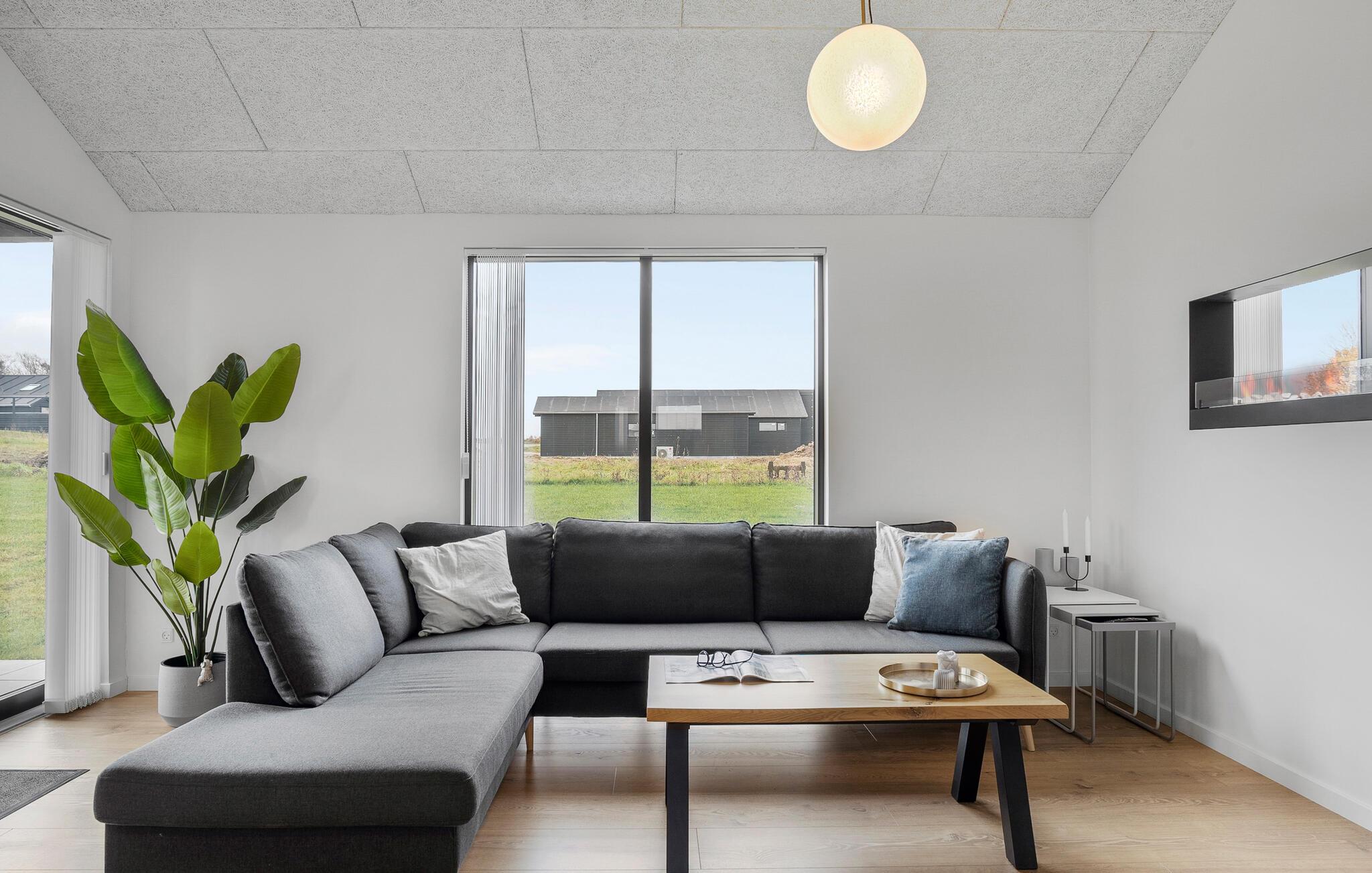 Velkommen til dette moderne og lyse feriehus, der med store vinduer og en åben planløsning skaber en helt særlig atmosfære. Her forenes madlavning, spisning og afslapning i en samlet oplevelse af velvære. Start feriedagen med morgenmad på den delvist overdækkede terrasse og nyd freden. De komfortable soveværelser sikrer afslappende nætter, mens børnene kan lege på den rummelige grund. Imens kan I nyde roen i spabadet og lade sjælen finde ro.