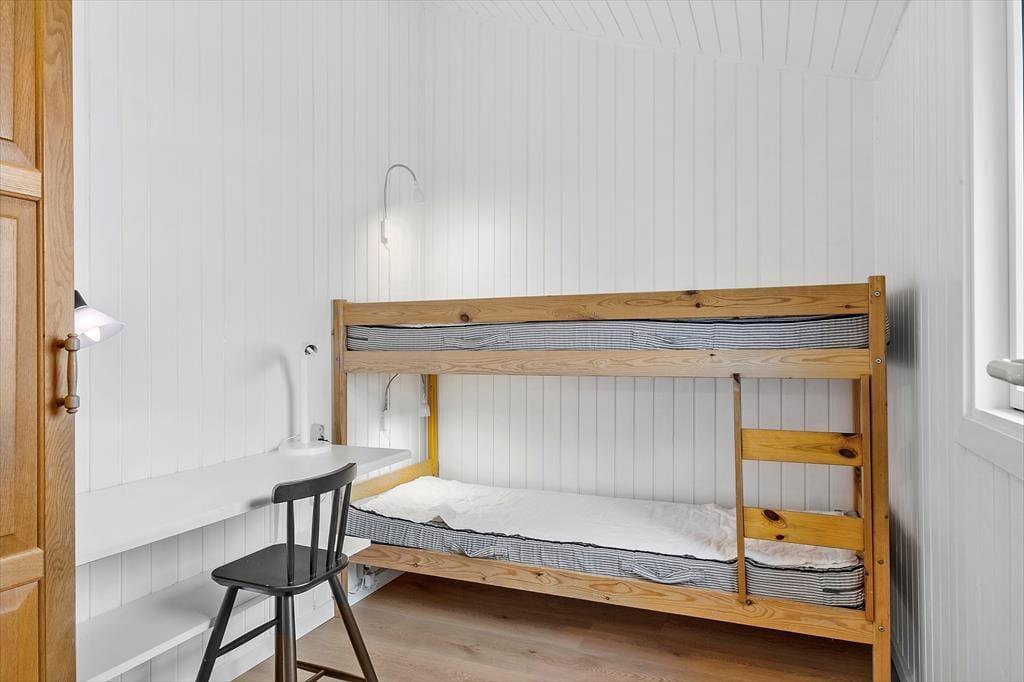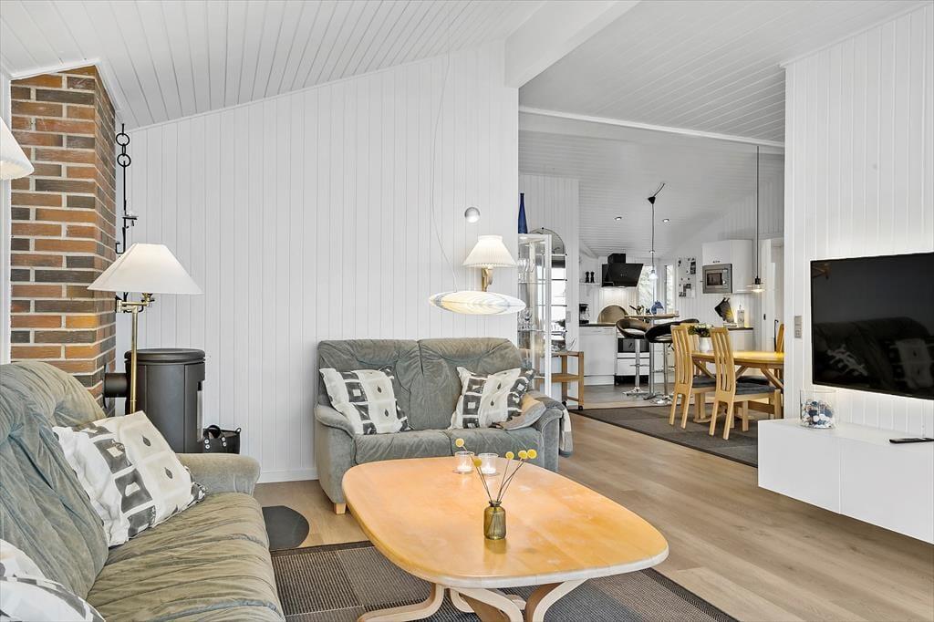 Det føles eksklusivt at bo med sådan et panoramavue, og I behøver ikke nødvendigvis have så mange planer, når I kan sidde her og tage det smukke landskab ind. Havudsigten imponerer især fra stuen, hvor store panoramavinduer sørger for frit udsyn og et skønt lysindfald. I kan også nyde det smukke syn fra flere af husets fire soveværelser såvel som fra køkken-alrummet, der ligger i åben forbindelse med stuen. Er det vejr til indendørs hygge og varm kakao, kan I tænde op i sommerhusets brændeovn, og efter en gåtur i blæsevejr er der intet så skønt som at læne sig tilbage i saunaen. Sidstnævnte ligger i forlængelse af det ene af to badeværelser, der er med til at fuldende planløsningen. Læg dertil et anneks med ekstra sovepladser, og alt i alt får I en skøn feriebolig for to børnefamilier, flere vennepar eller den store familietur, hvor også bedsteforældrene er inviteret.