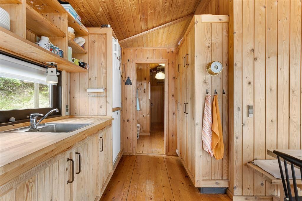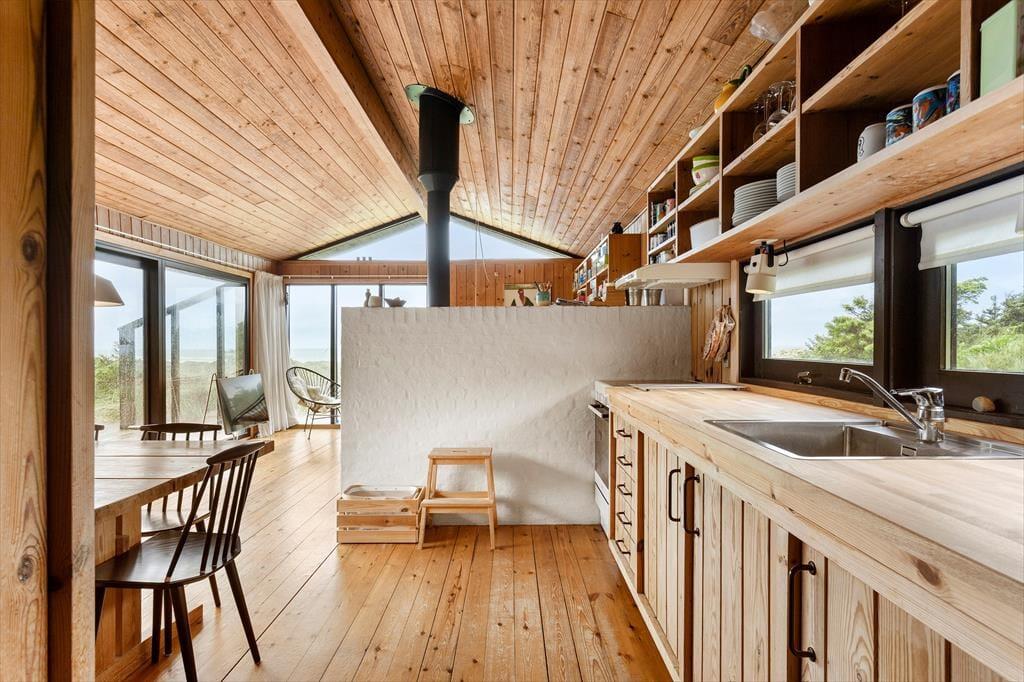 Sommerhuset emmer af charme og autenticitet, og allerede når du træder indenfor, mærker du den særlige stemning, der hører med til et klassisk, dansk sommerhus. Her er lyst og hyggeligt med smukke lysindfald, der skifter karakter i løbet af dagen. Stuen er hjertet i huset – indrettet med komfortable møbler og en brændeovn, der knitrer hyggeligt, når aftenkulden melder sig. Køkkenet ligger i delvis åben forbindelse med stuen, så der er plads til både samtaler og fællesskab, mens maden tilberedes. Huset byder på tre gode værelser med mulighed for ro og privatliv, og badeværelset er enkelt og funktionelt – præcis som det skal være, når du vil koble helt fra og nyde det enkle sommerhusliv. De store vinduer i opholdsrummet åbner op for en imponerende udsigt til landskab og hav, som du aldrig bliver træt af at kigge på.
