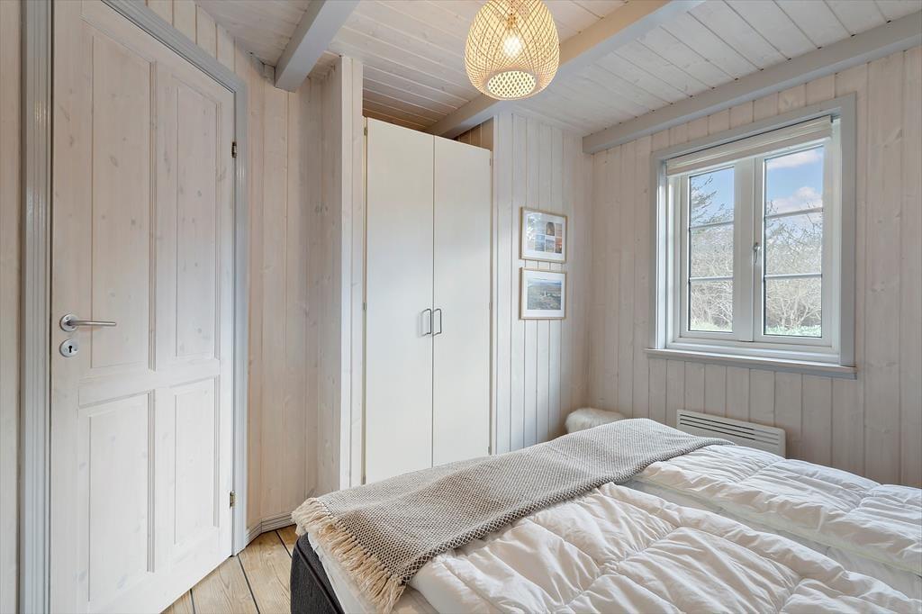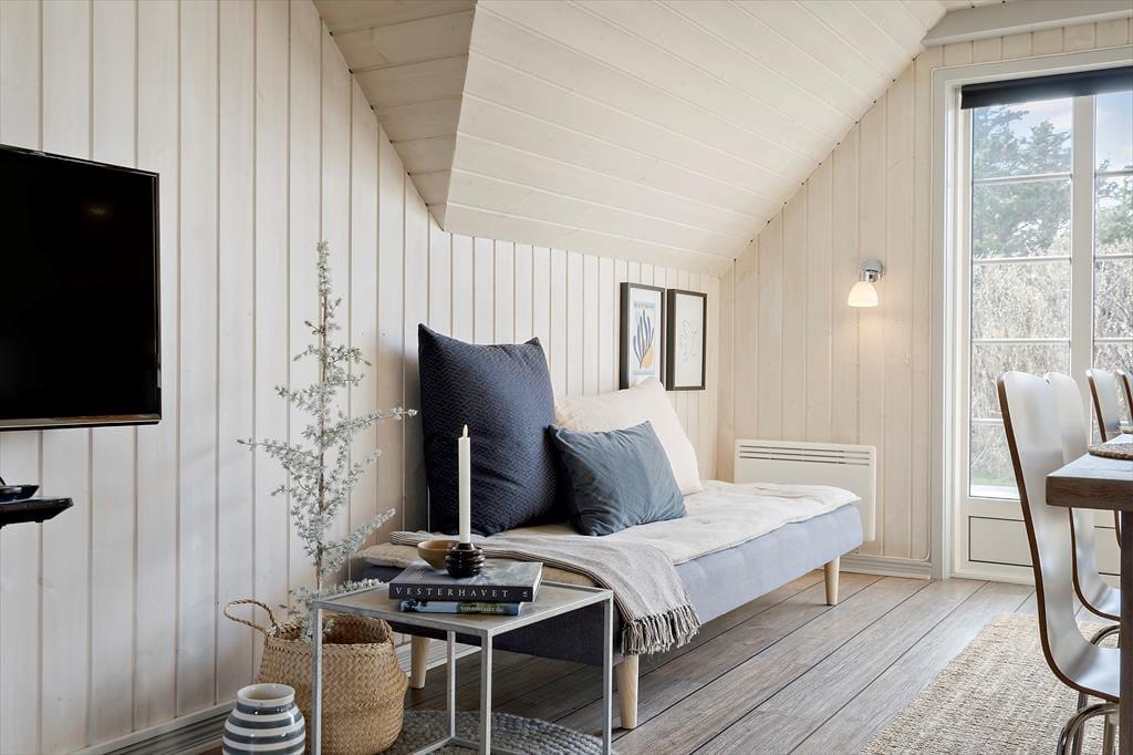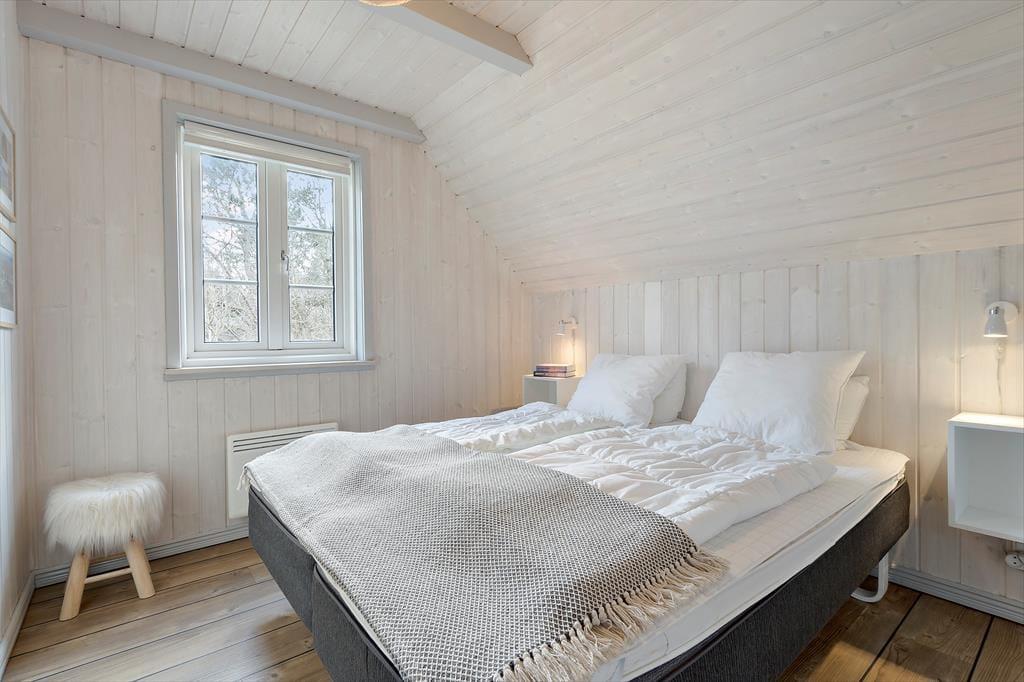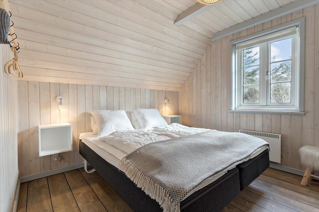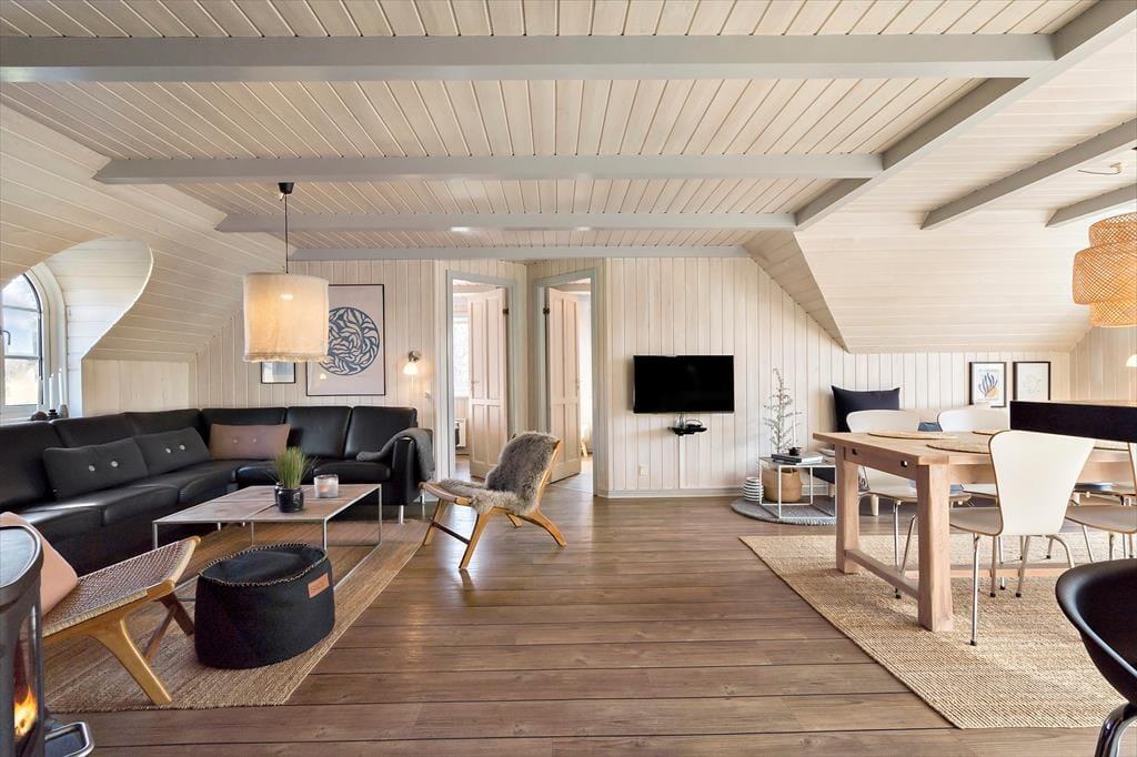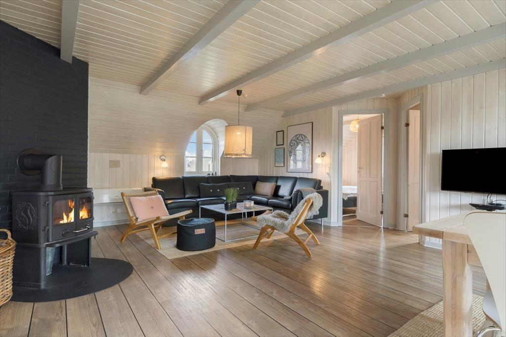 Fire soveværelser er ligeligt fordelt i to afdelinger i hver sin ende af huset, så er I to familier på ferie sammen, har I hver jeres soveafsnit. Alle kan samles i den store, åbne opholdsafdeling, hvor køkkenet og stuen glider i ét, og hvor varmepumpen og brændeovnen sørger for en behagelig temperatur. Vær sammen om at lave mad i det moderne køkken, og lad opvaskemaskinen lette køkkenarbejdet, mens I hygger omkring spisebordet eller I de bløde møbler. Wi-fi og fladskærms-tv sikrer underholdningen, og i depotrummet finder I bob, minibordfodbold og andre sjove spil. Foruden entréen byder feriehuset også på et separat toilet samt et wellnessbadeværelse, der har bruseniche, og hvor I kan nyde boblerne i spabadet eller den varme damp i saunaen.