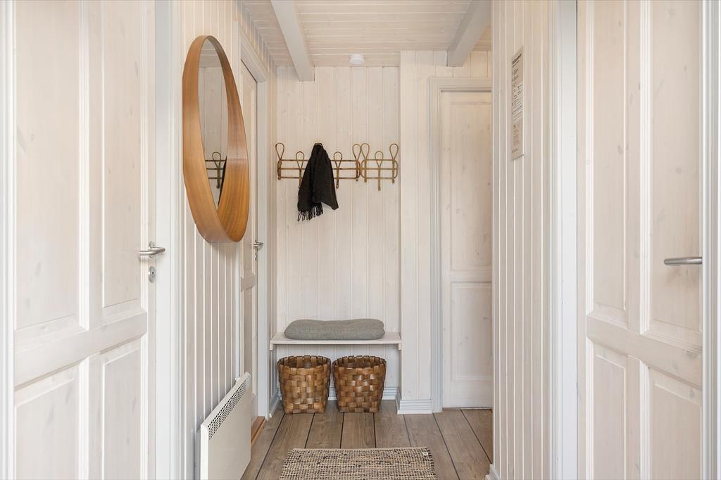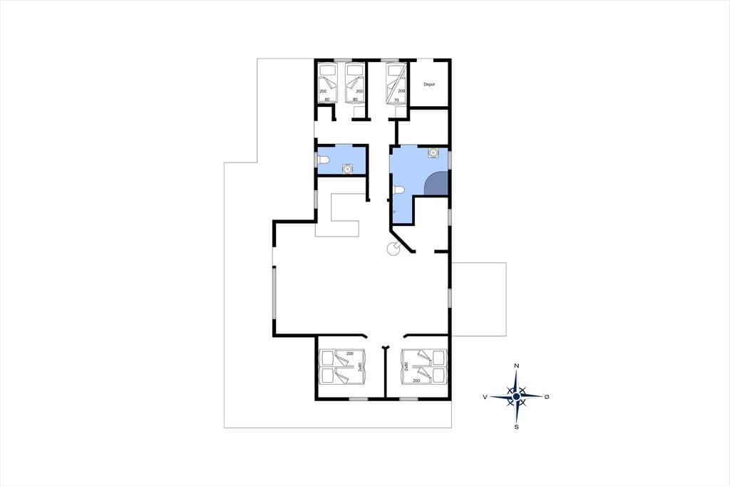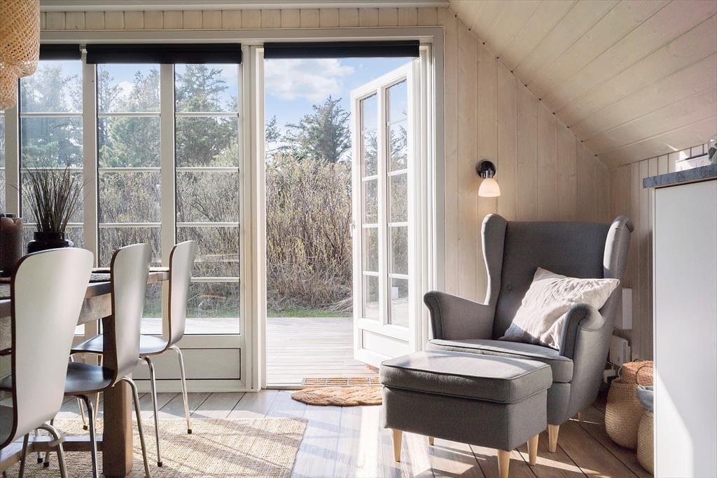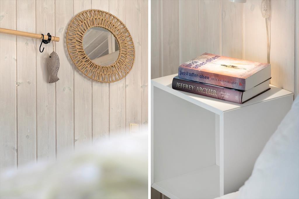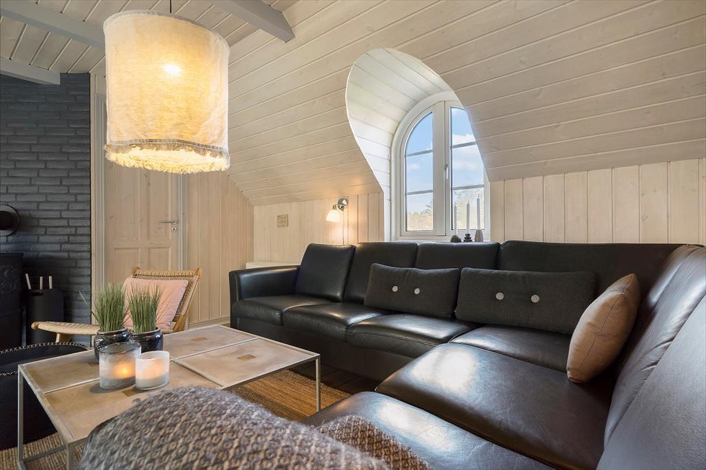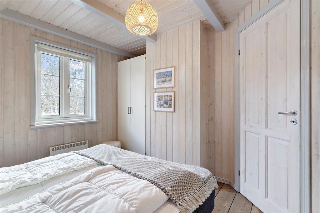 Fire soveværelser er ligeligt fordelt i to afdelinger i hver sin ende af huset, så er I to familier på ferie sammen, har I hver jeres soveafsnit. Alle kan samles i den store, åbne opholdsafdeling, hvor køkkenet og stuen glider i ét, og hvor varmepumpen og brændeovnen sørger for en behagelig temperatur. Vær sammen om at lave mad i det moderne køkken, og lad opvaskemaskinen lette køkkenarbejdet, mens I hygger omkring spisebordet eller I de bløde møbler. Wi-fi og fladskærms-tv sikrer underholdningen, og i depotrummet finder I bob, minibordfodbold og andre sjove spil. Foruden entréen byder feriehuset også på et separat toilet samt et wellnessbadeværelse, der har bruseniche, og hvor I kan nyde boblerne i spabadet eller den varme damp i saunaen.