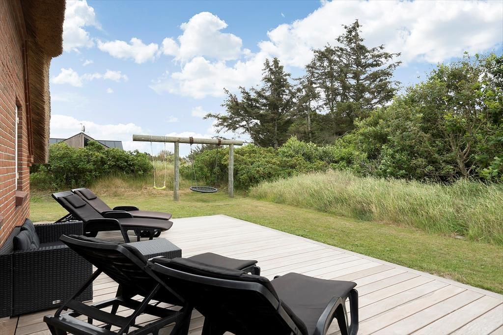 Den 2010 m2 store grund giver jer masser af plads til at bruge feriedagene i det fri. Mod øst findes en morgenterrasse, hvor I kan nyde dagens første sol med en kop dampende varm kaffe. Resten af dagen kan I trække om på den syd- og vestvendte træterrasse, hvor de mange kvadratmeter giver jer masser af plads til afslapning i solsengene og ved terrassebordet, mens lækkerier syder på grillen. Familiens yngste har sandkasse, gynger og legeredskaber, og græsplænen indbyder til fangeleg og boldspil.