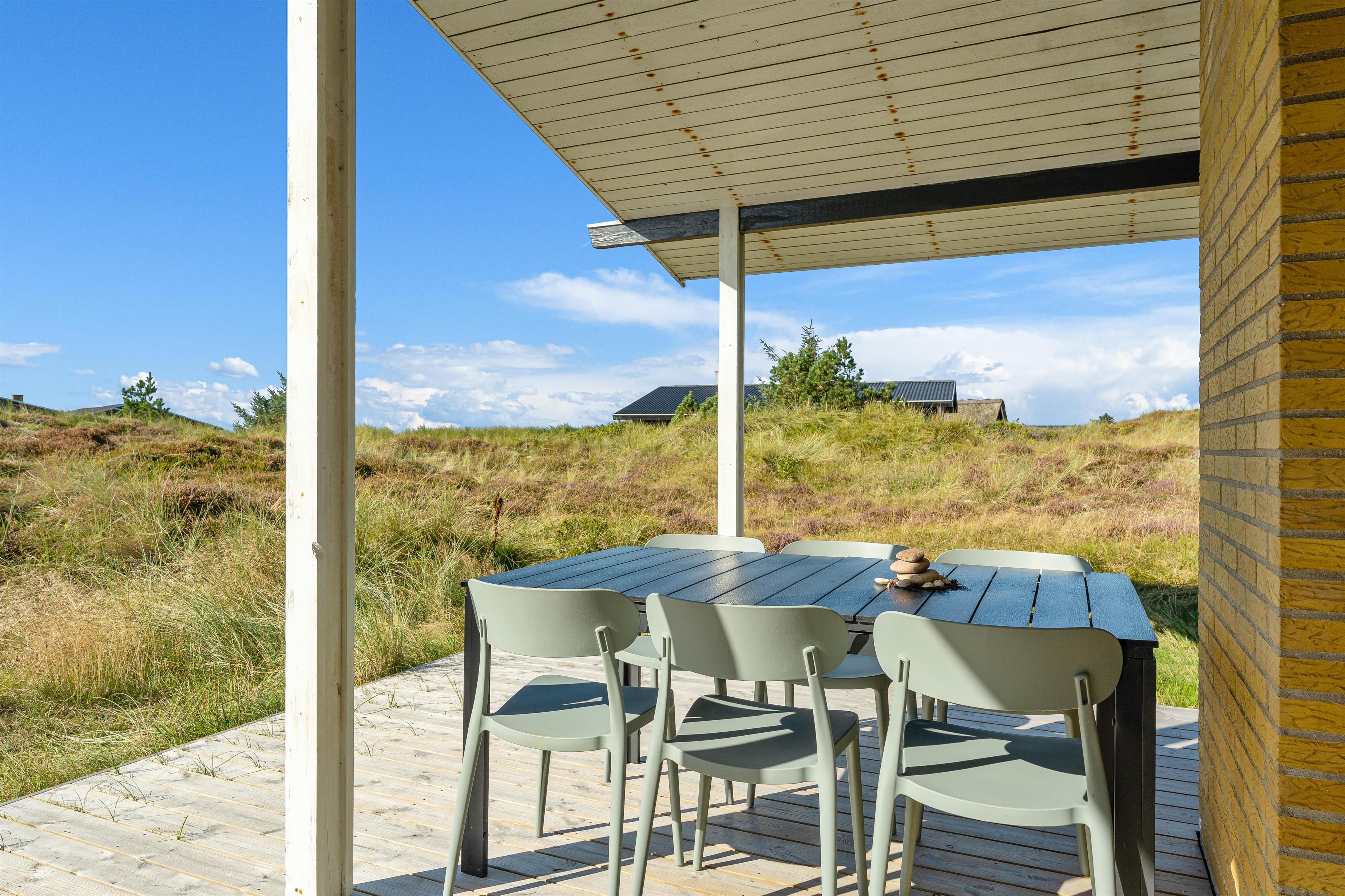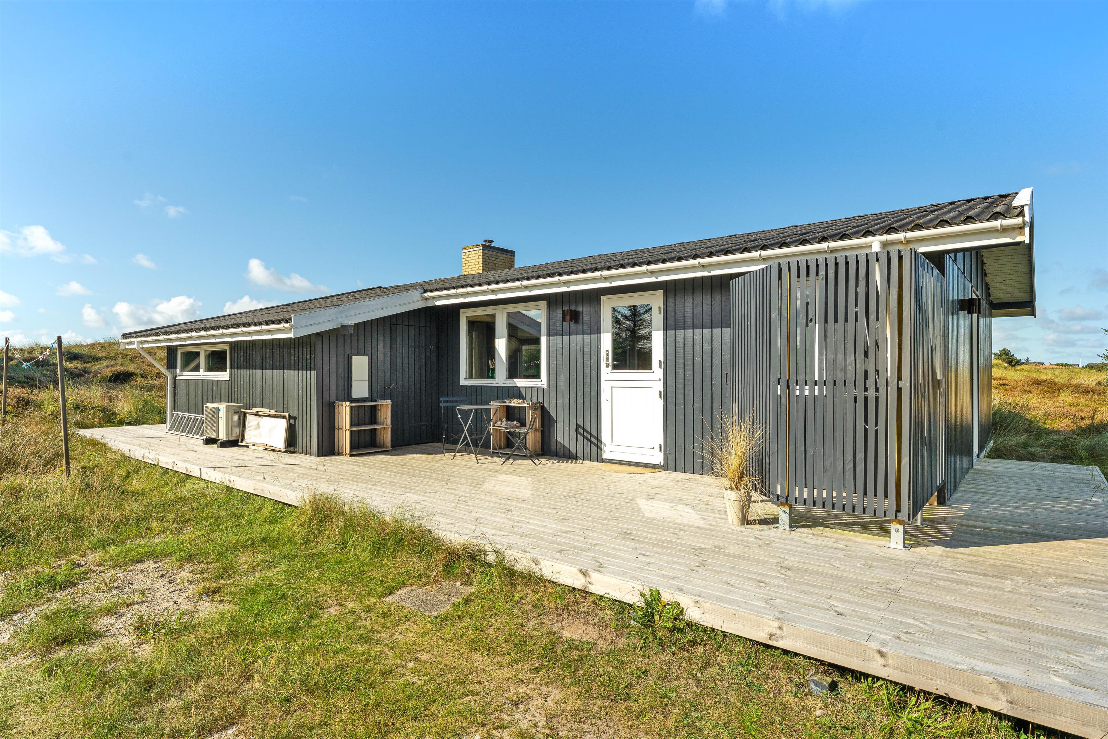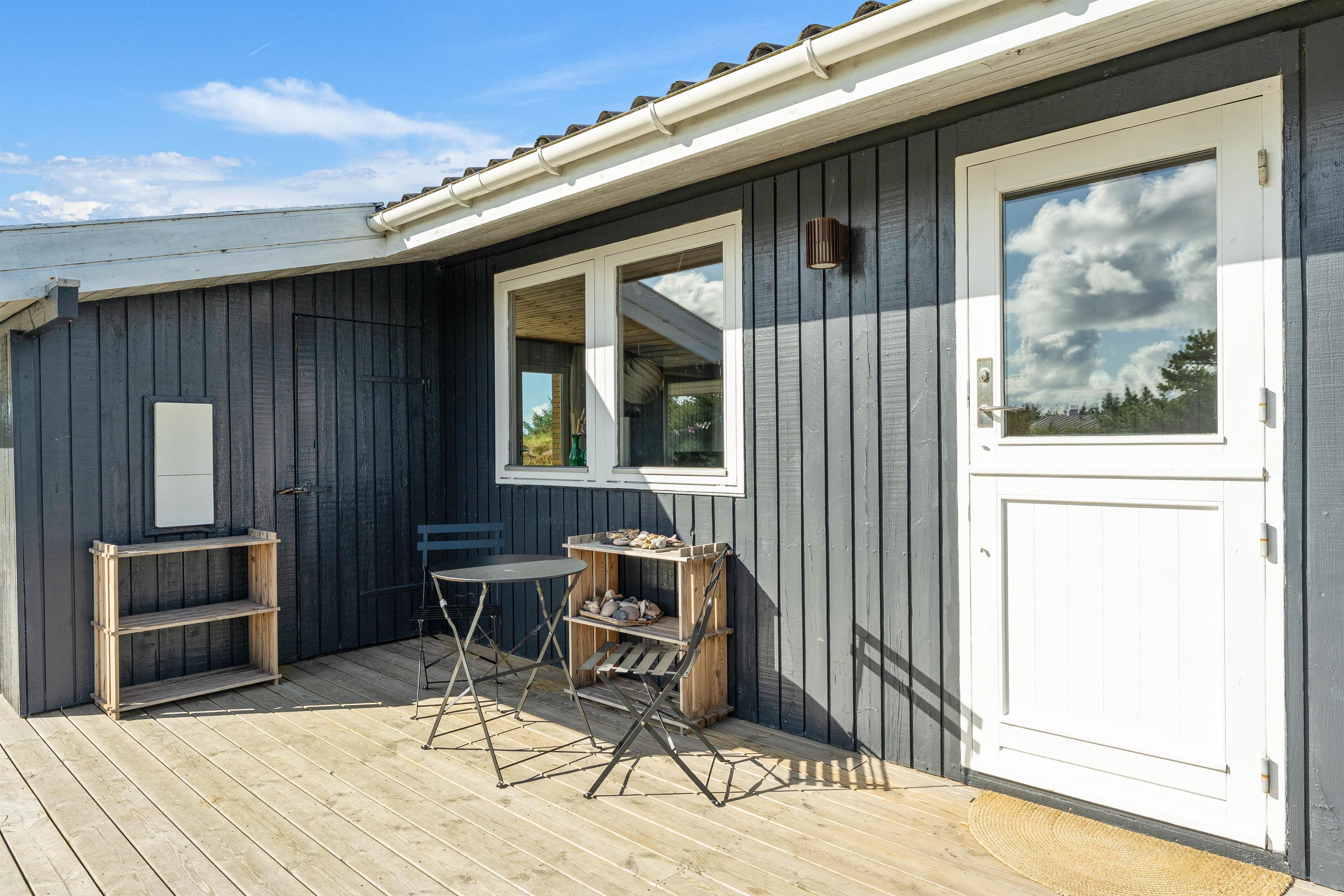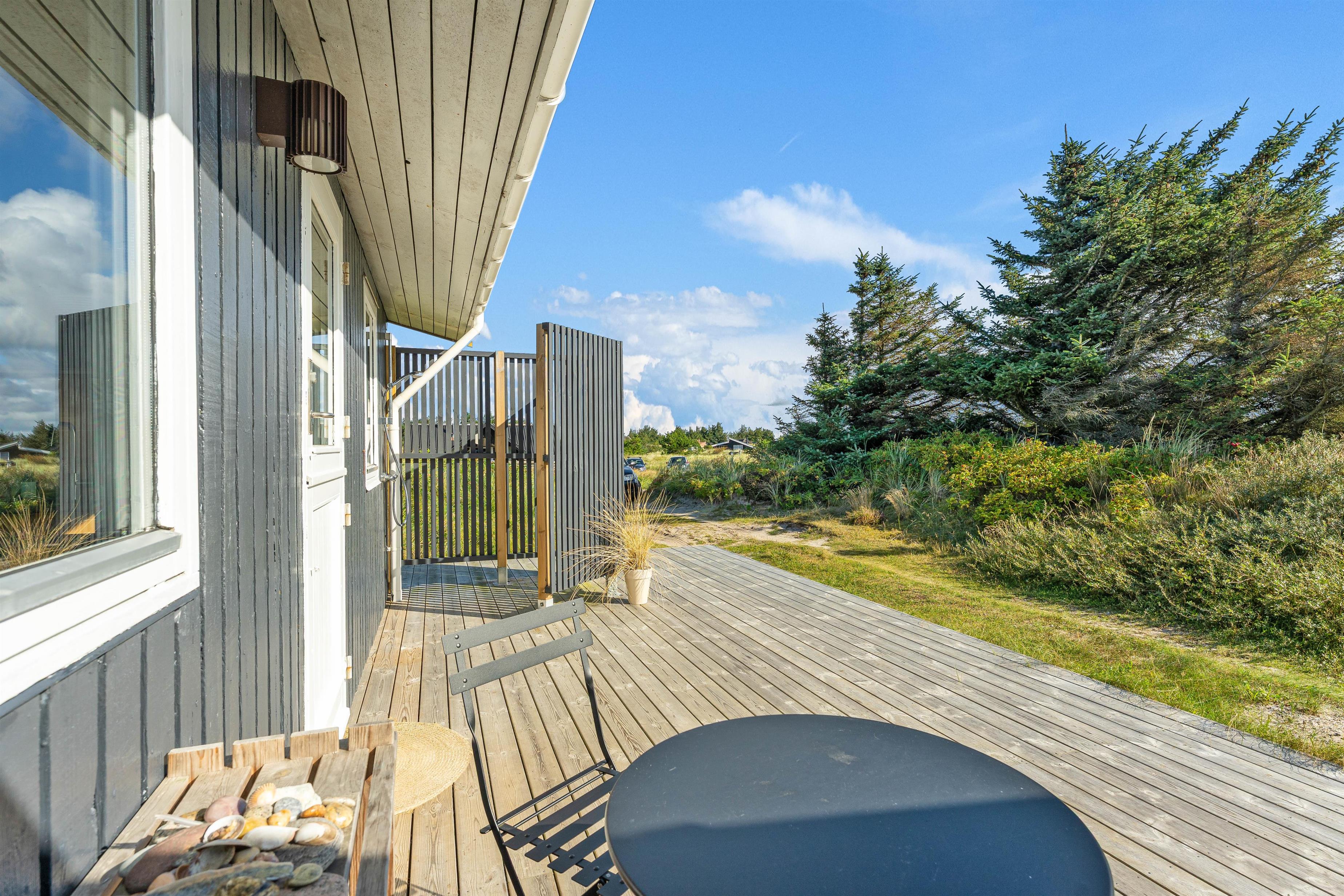 Udenfor finder I en hyggelig terrasse, som er delvist overdækket. Her er der plads til at nyde den skønne vesterhavsluft og natur, imens der bliver slappet af. Derudover er der plads til leg og spil på den skønne naturgrund. Efter en dejlig tur ved stranden kan I skylle sandet af tæerne under udebruseren ved sommerhuset. I skal dog være opmærksomme på, at udebruseren kun er tilgængelig fra april til november.