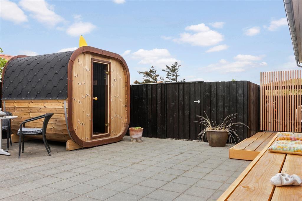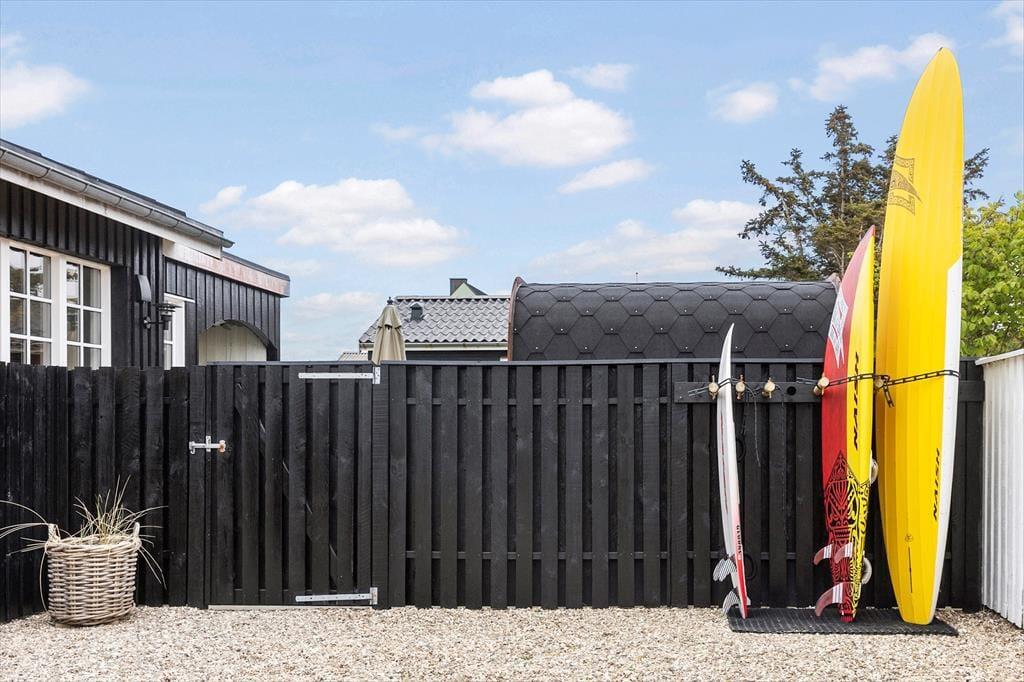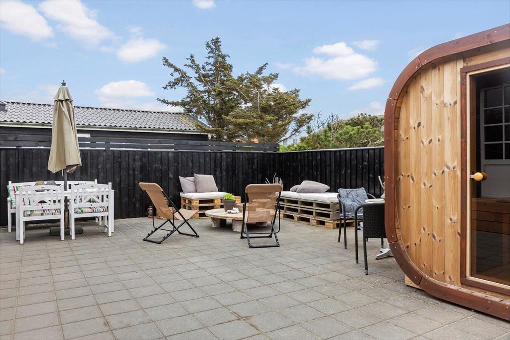 Når solen skinner, og dagen kalder på frisk luft, er den lukkede terrasse på Stågbak 4 det ideelle sted at tilbringe tiden. Den byder ikke kun på privatliv, men også på en udesauna og en skøn udebruser, som dele af faciliteterne. Forestil dig at starte dagen med en forfriskende morgendukkert i Vesterhavet og slutte den af med en varm saunatur, alt sammen under åben himmel. Det tilbagetrukne gårdmiljø giver dig mulighed for at nyde solen i fuldstændig ro og mag, mens du samtidig befinder dig midt i den pulserende surferby Klitmøller.