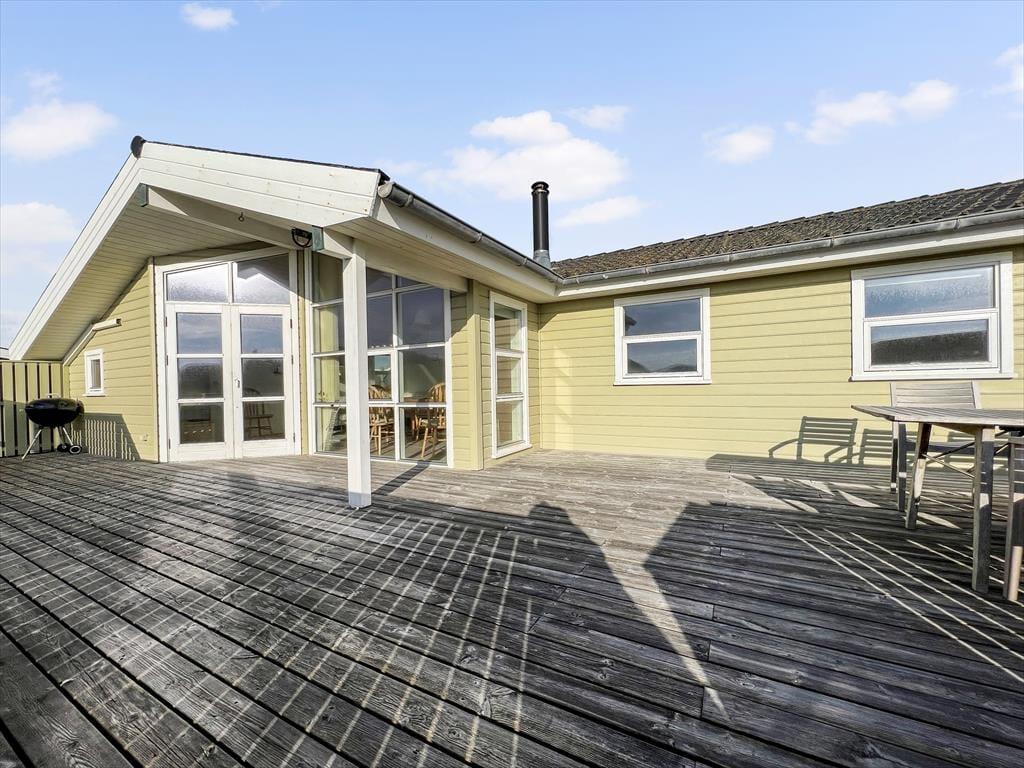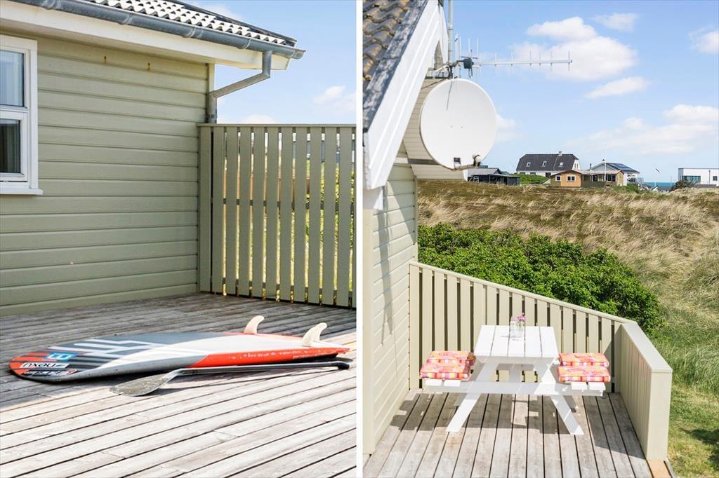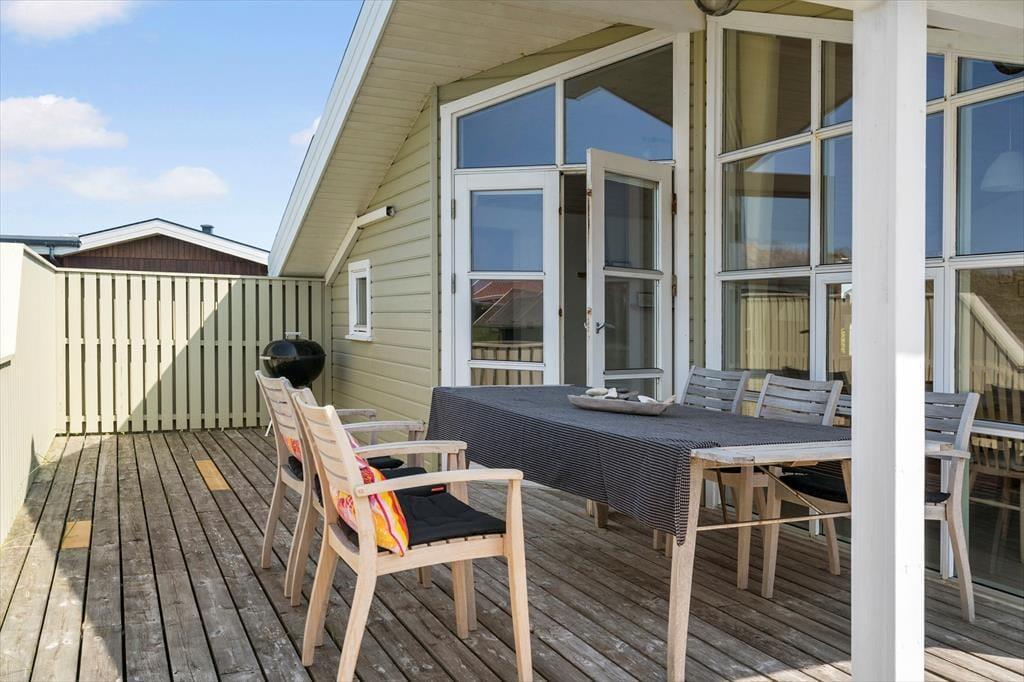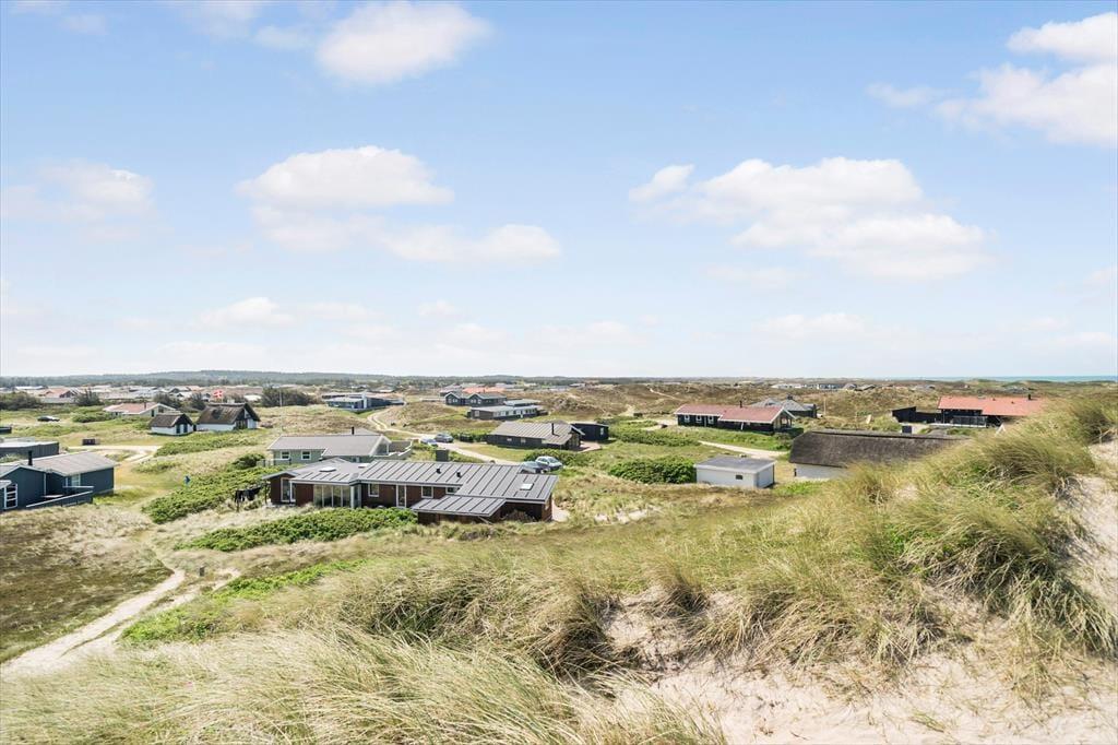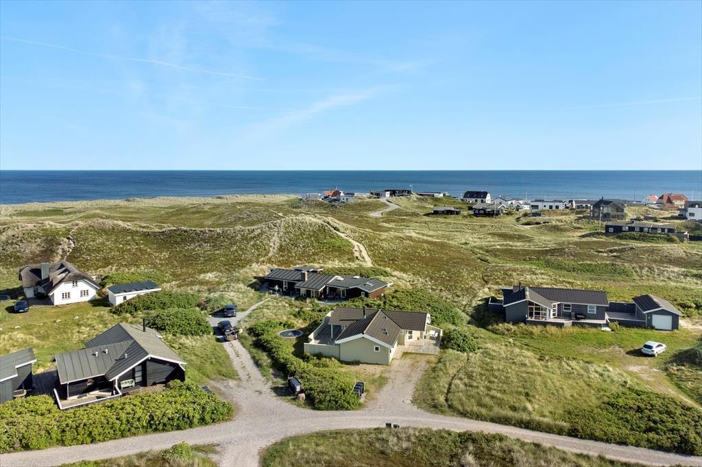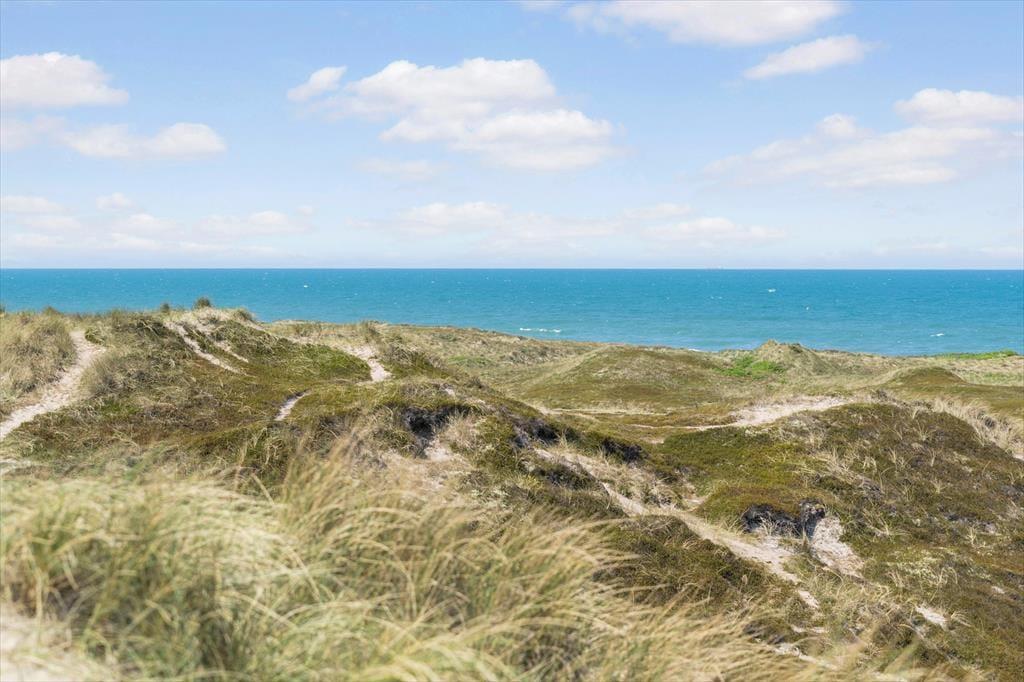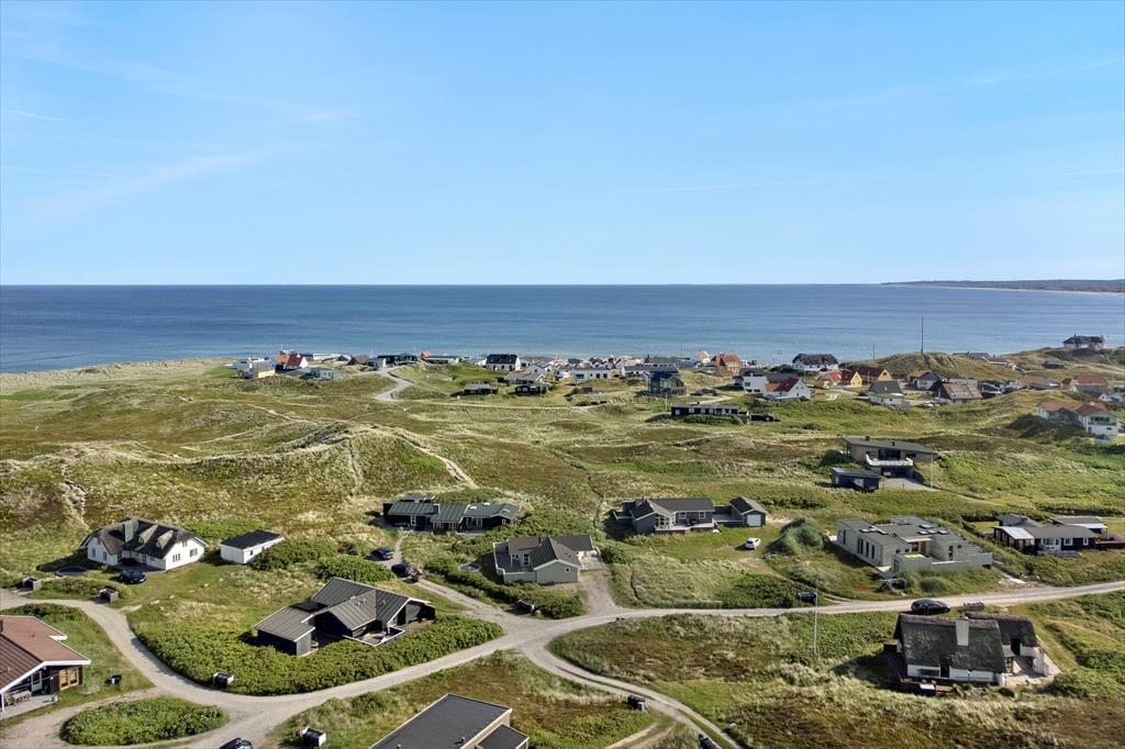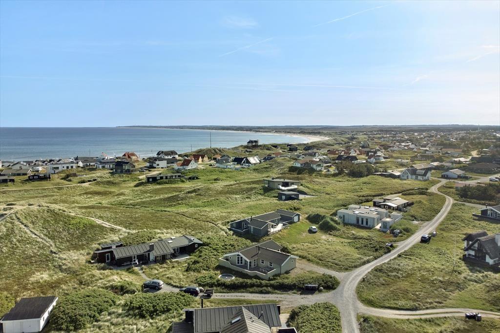 Udenfor kan du nyde de fredelige omgivelser fra den rummelige terrasse, der indbyder til morgenkaffe med udsigt til horisonten eller grillhygge under den åbne himmel. Det let kuperede landskab omkring huset skaber en naturskøn ramme, og fra terrassen kan du få et glimt af Vesterhavet – en påmindelse om, at du er tæt på naturens kræfter. Græsplænen omkring huset giver plads til leg og afslapning, og der er rig mulighed for at finde et roligt hjørne, hvor du kan lade tankerne flyve.
