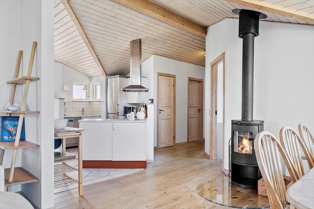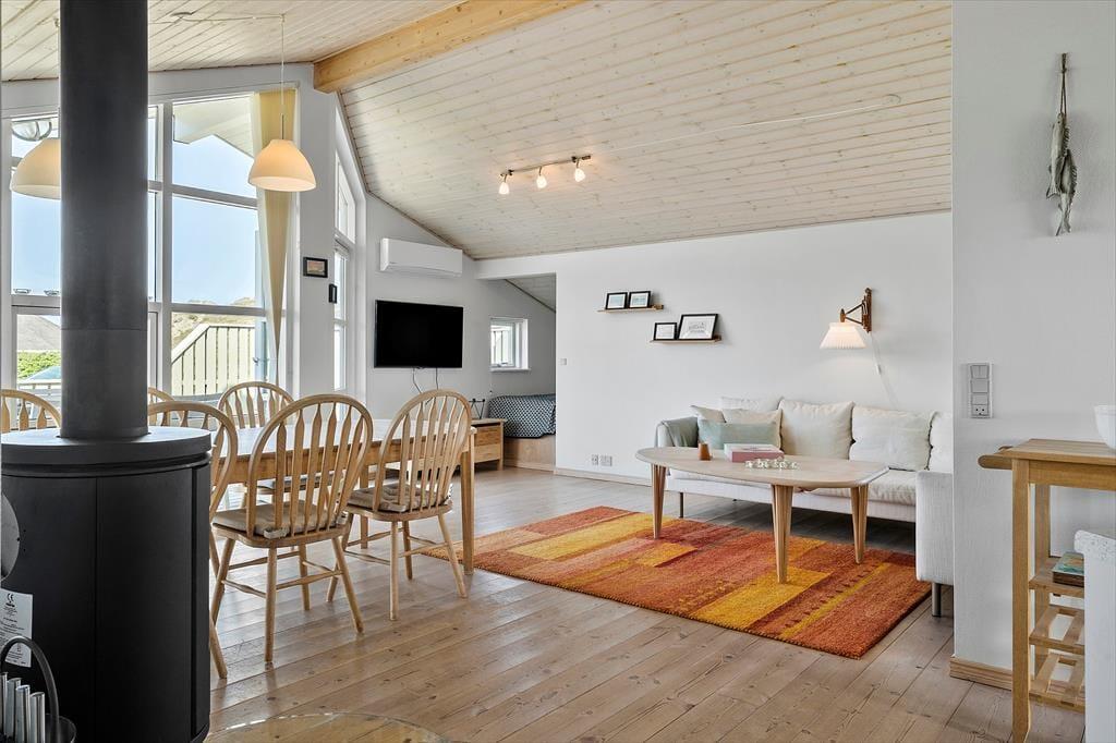 Inde i sommerhuset bliver du mødt af en hyggelig atmosfære, der straks får dig til at føle dig hjemme. Det åbne opholdsrum med brændeovn er ideelt til afslappede aftener, hvor flammernes dansende skær spreder varme og hygge. Køkkenet, som er praktisk integreret i stuen, gør det nemt at tilberede måltider og samtidig være en del af samtalerne. Efter en dag fyldt med oplevelser kan du forkæle dig selv i saunaen, hvor varmen får kroppen til at slappe af, mens tankerne falder til ro. Sommerhuset er skabt til at danne rammen om gode stunder, uanset om du rejser som par, med familien eller med venner.