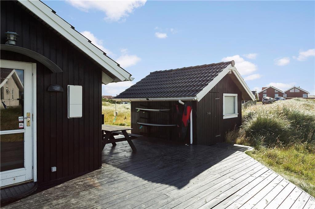 Sommerhuset har en stor sammenhængende terrasse, der nærmest indbyder til udeliv hele dagen. Her kan du nyde morgenkaffen i solens første stråler eller grille under den åbne himmel, mens familien hygger sig med leg og spil. Terrassen fungerer som det perfekte bindeled mellem husets indre og den omkringliggende natur. Med to husdyr tilladt er dette også et ideelt sted for dig, der ikke vil undvære familiens firbenede venner. Uanset om du søger skygge eller sol, er der altid et dejligt spot på terrassen, hvor du kan læne dig tilbage og nyde feriestemningen.