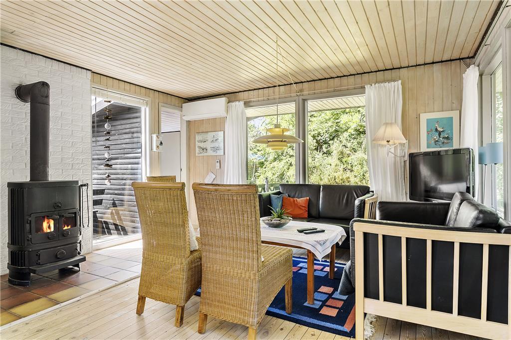 Træd indenfor i dette hyggelige sommerhus, der med sin klassiske indretning og varme atmosfære indbyder til afslapning. Den rummelige stue er hjertet i huset, hvor du kan slå dig ned foran brændeovnen og mærke roen brede sig, mens flammerne knitrer. Her er der plads til at være sammen som familie eller par, uanset om I spiller spil, ser en film eller bare nyder hinandens selskab. Huset er indrettet til at skabe rammerne om hyggelige feriedage, hvor livet leves i et roligt tempo.