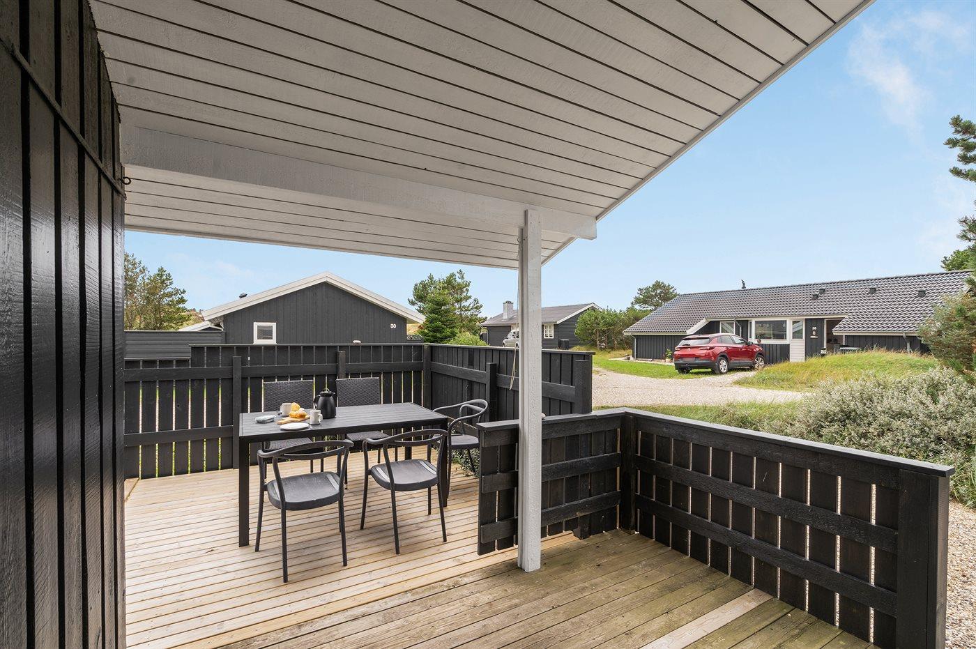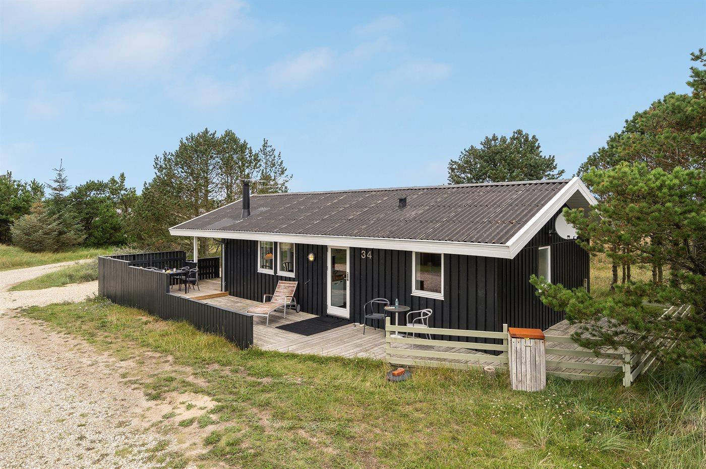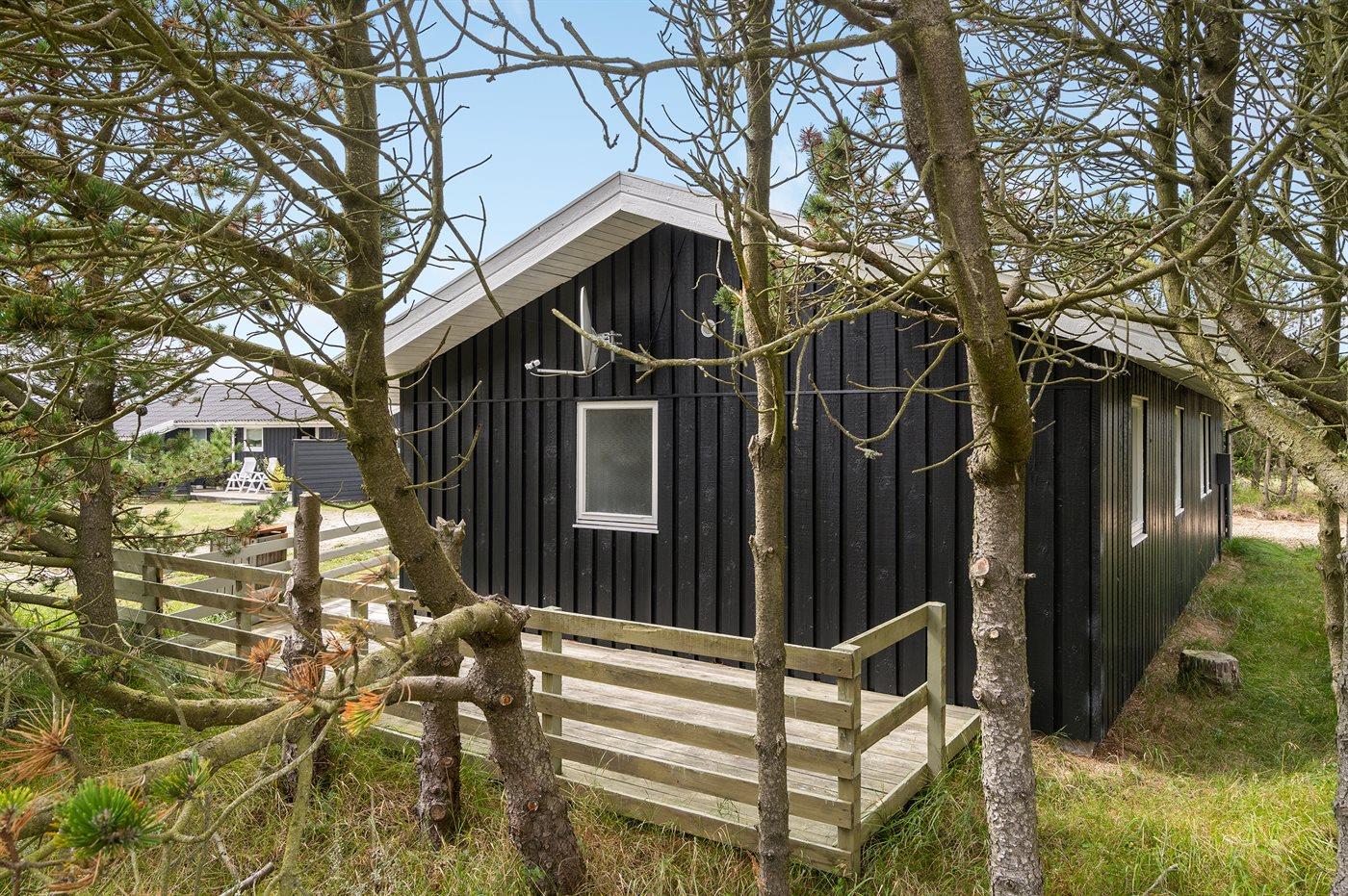 Hyggeligt og velholdt træhus med særdeles gode terrasser beliggende i et smukt klitområde for enden af en blind vej.