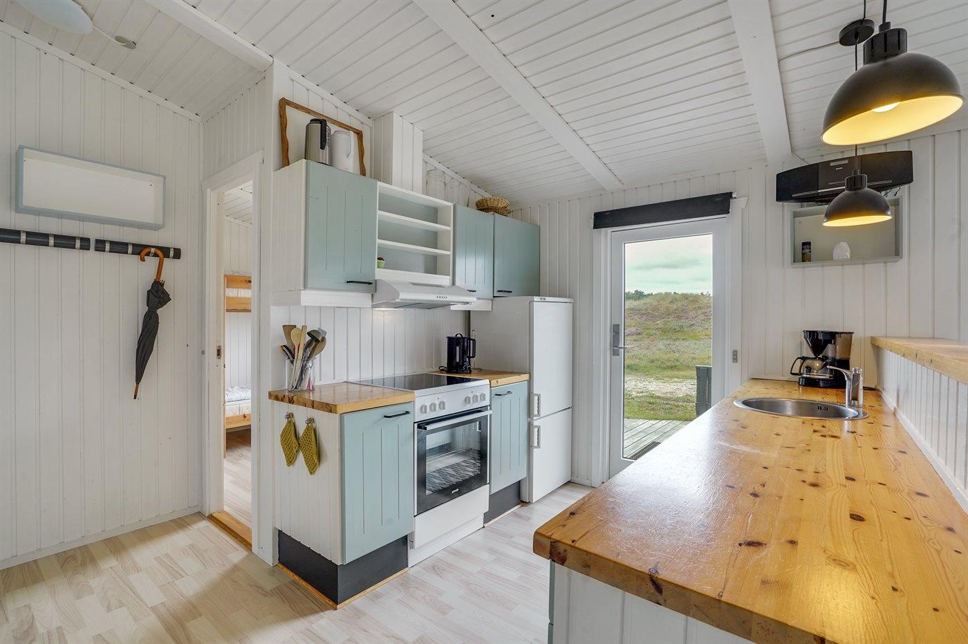 Køkkenet er udstyret med 1 køleskab. Der er 4 keramiske kogeplader, varmluftovn samt opvaskemaskine.