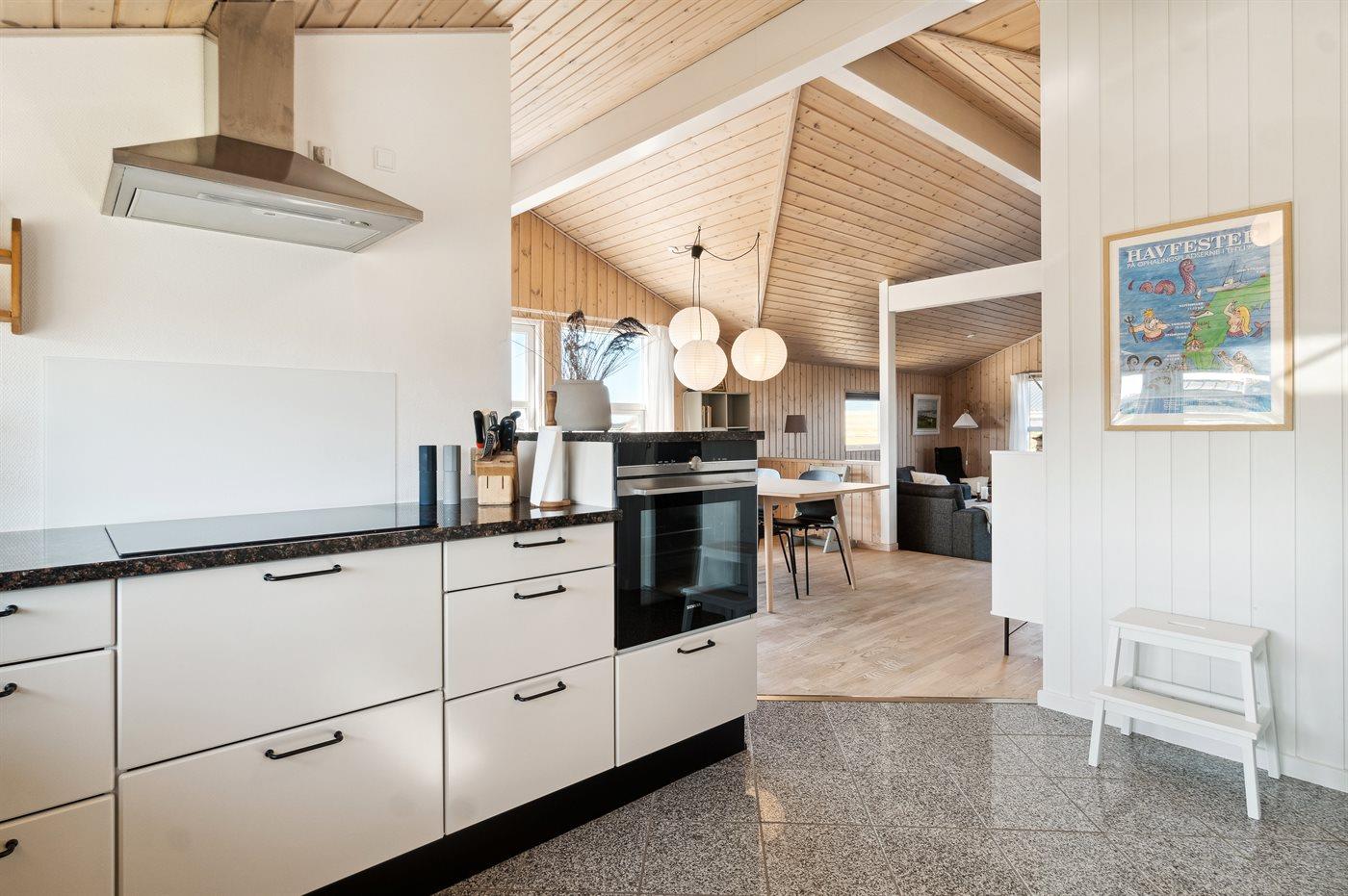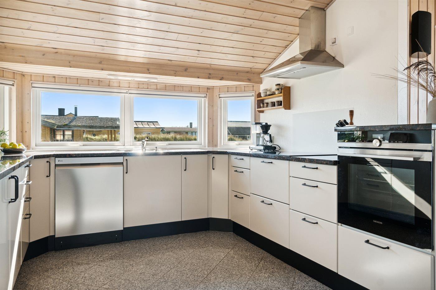 Køkkenet er udstyret med 1 køleskab. Der er 4 induktionskogeplader, varmluftovn, mikrobølgeovn samt opvaskemaskine Der er gulvvarme i køkkenet.