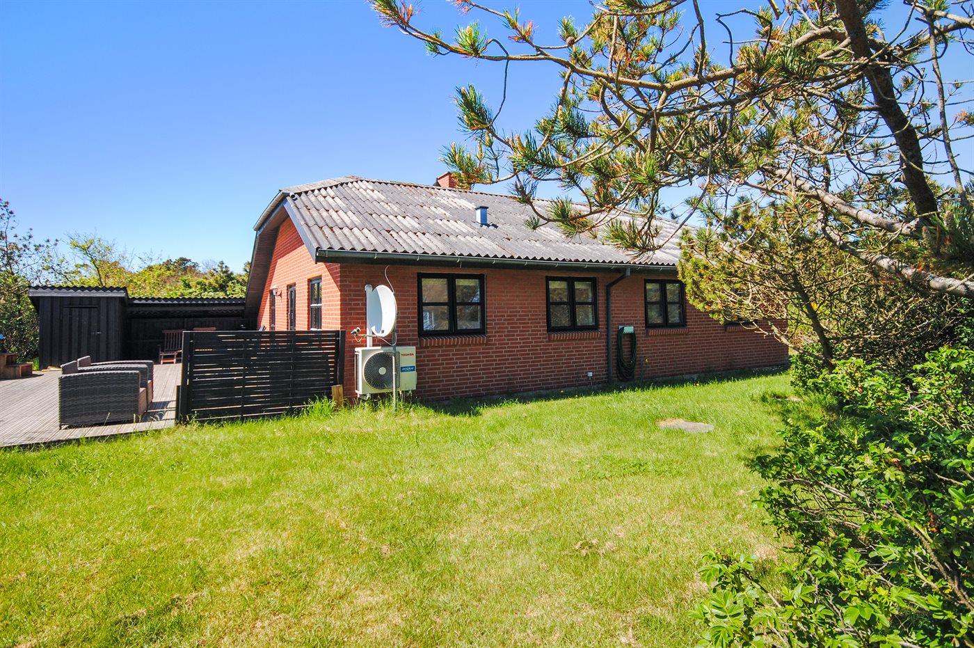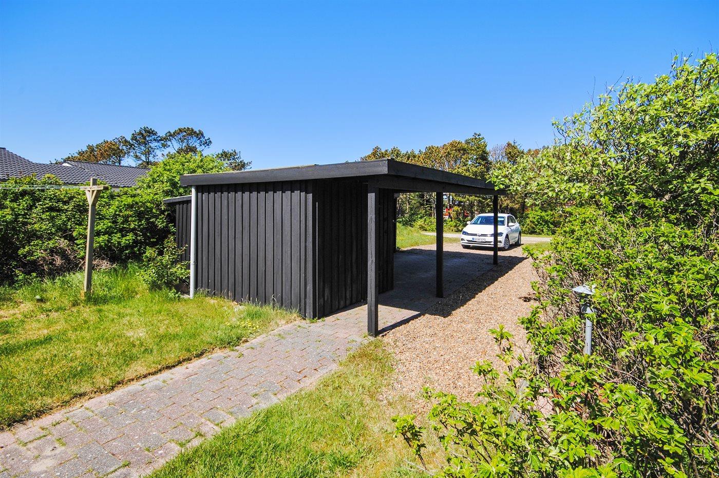 Ferieboligen er beliggende på en 1250 m² stor naturgrund. Der er 300 m til havet. Nærmeste forretning er beliggende i en afstand af 1000 m. Til ferieboligen hører 60 m² terrasseareal. Der er redskabsrum. Der er carport til rådighed. Der er installeret stik til opladning af elbil. Parkering ved ferieboligen.