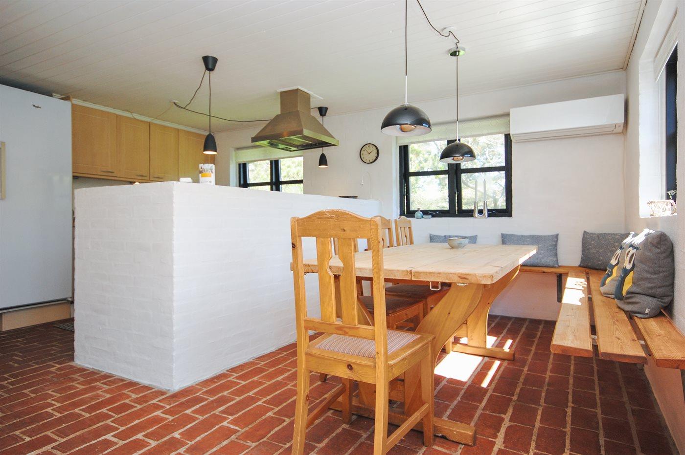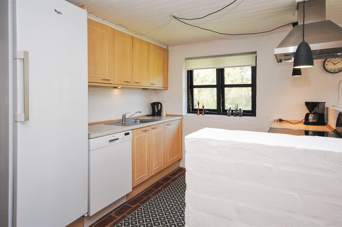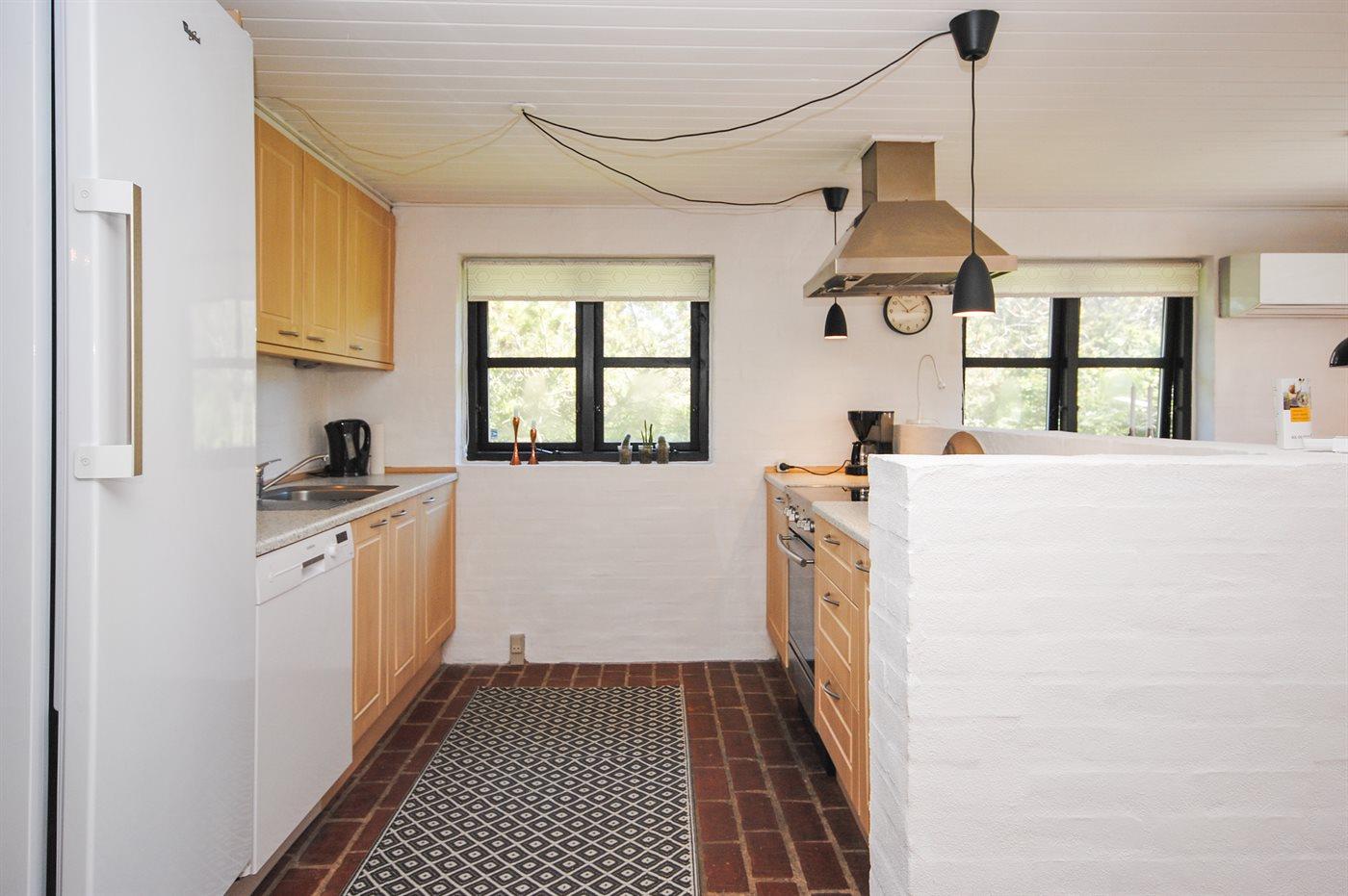 Køkkenet er udstyret med 1 køleskab. Der er 4 keramiske kogeplader, kombineret miniovn og mikrobølgeovn, varmluftovn samt opvaskemaskine.