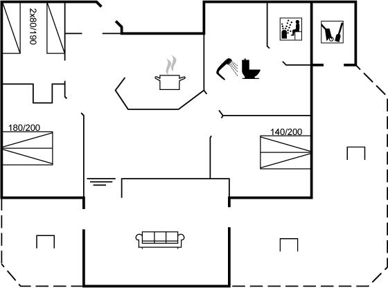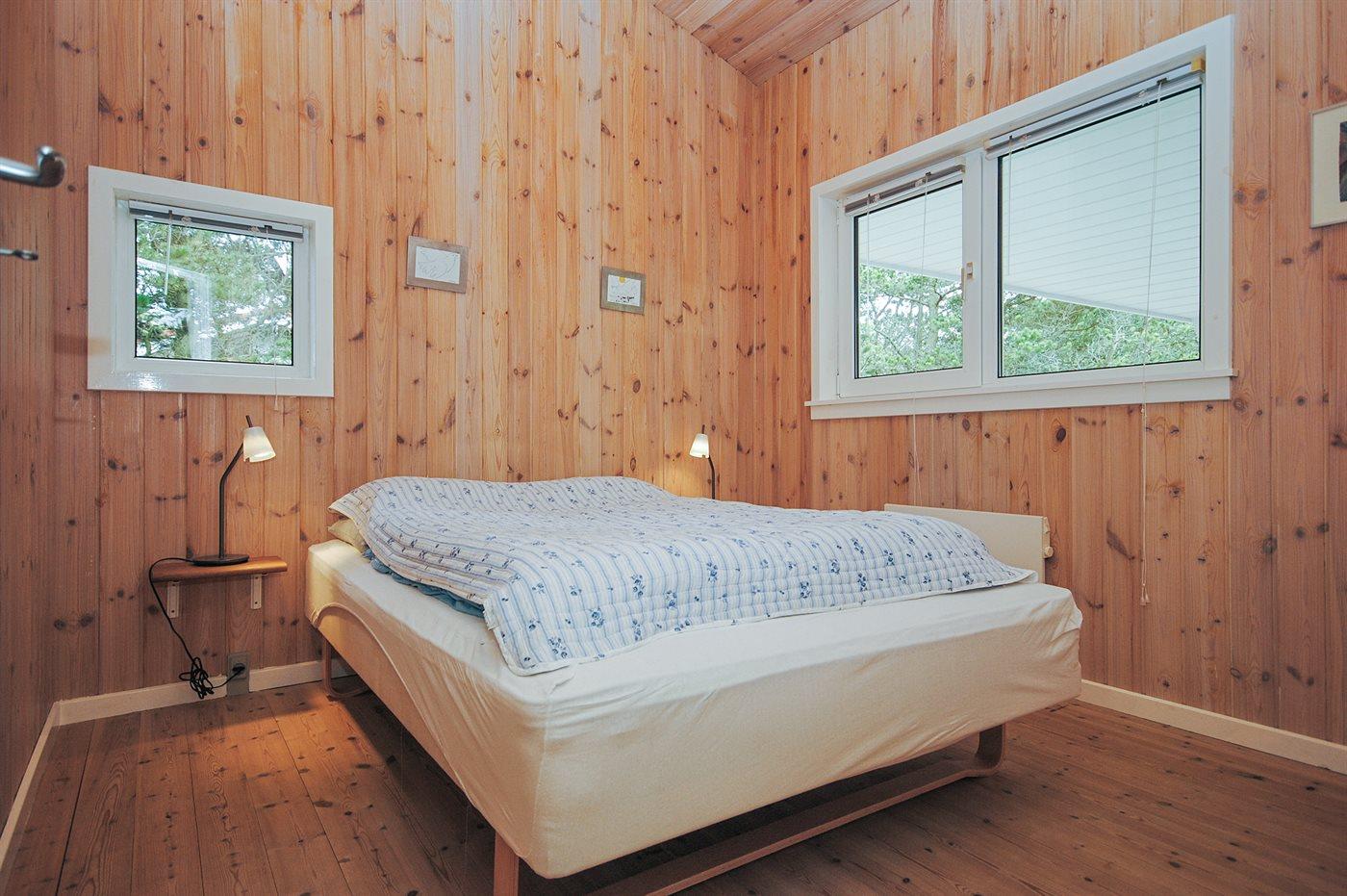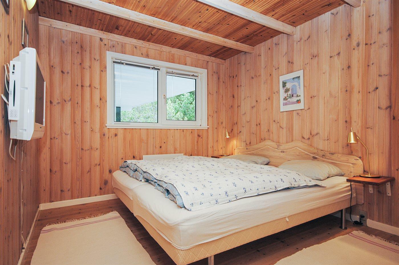Der er i alt 3 soveværelser. Sovepladserne fordeler sig på: 4 sovepladser i dobbeltsenge. 2 sovepladser i enkeltsenge. 2 sovepladser på madrasser. 2 af disse sovepladser befinder sig på husets hems. Derudover er der 1 stk. barneseng.