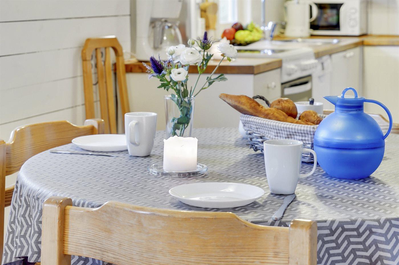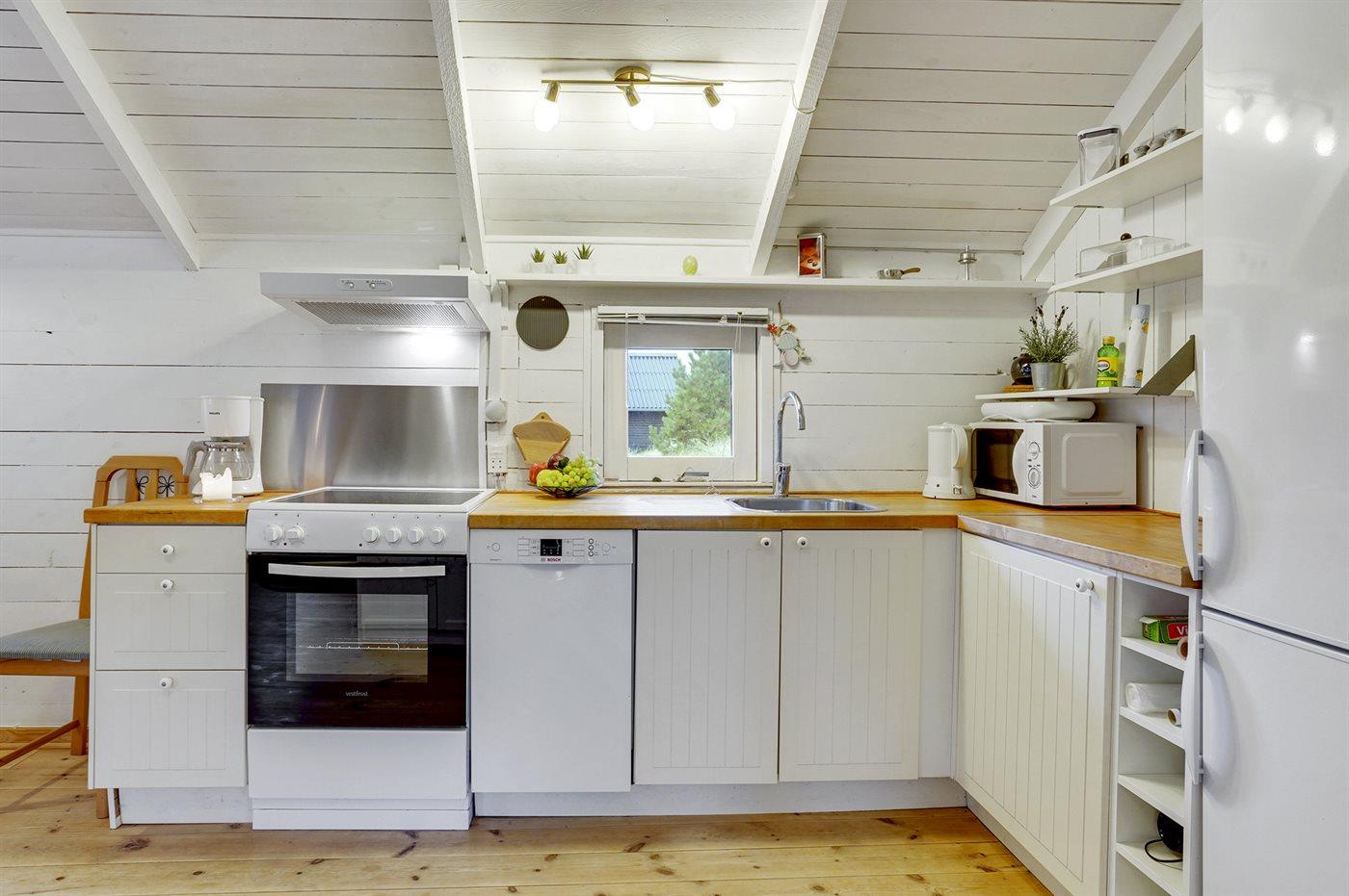 Køkkenet er udstyret med 1 køleskab. Der er 4 keramiske kogeplader, varmluftovn, mikrobølgeovn samt opvaskemaskine.