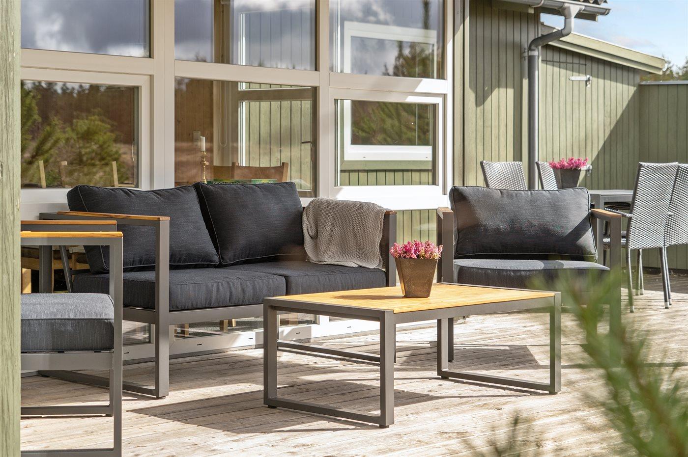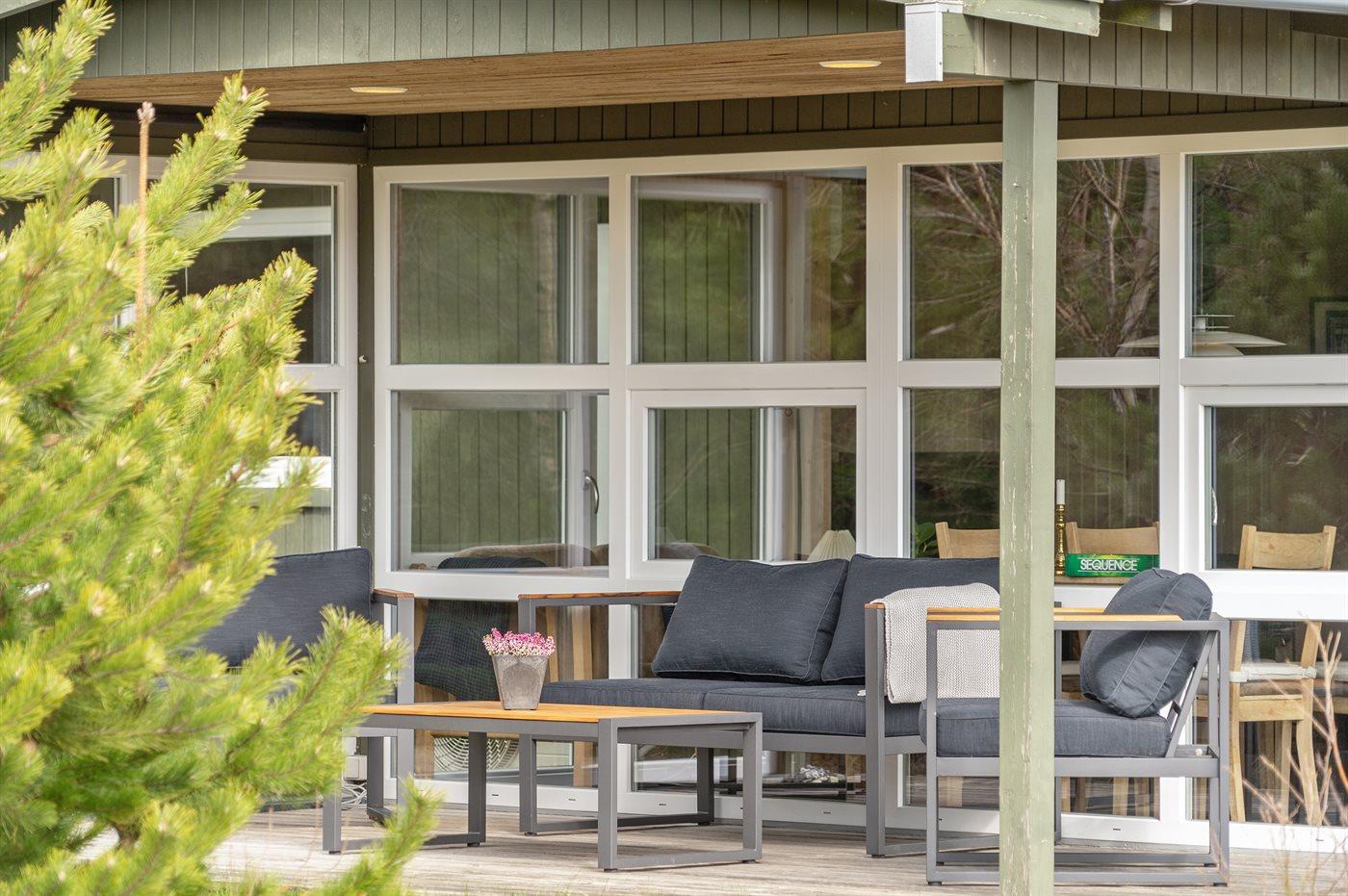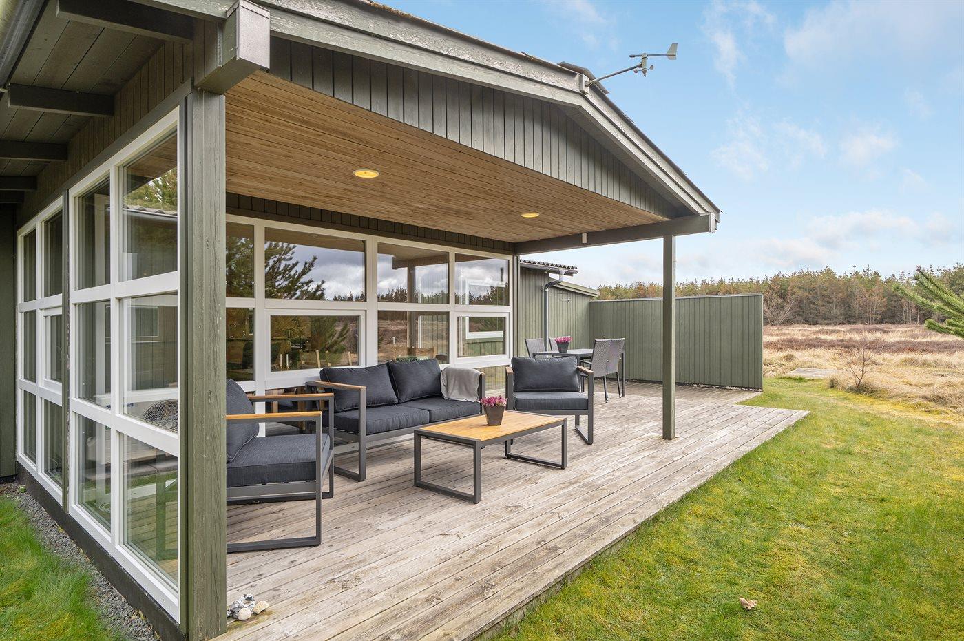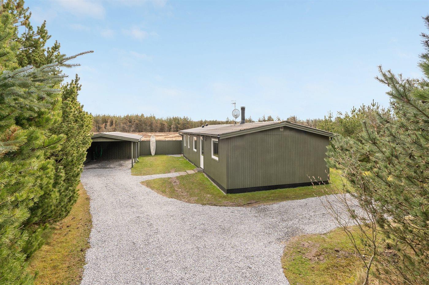 Ferieboligen er beliggende på en 2510 m² stor naturgrund. Der er 1100 m til havet. Nærmeste forretning er beliggende i en afstand af 800 m. Til ferieboligen hører 49 m² terrasseareal. Desuden er der 21 m² overdækket terrasse. Der er redskabsrum. Der findes Weber kuglegrill til kul. Parasol. Der er carport til rådighed. Parkering ved ferieboligen.