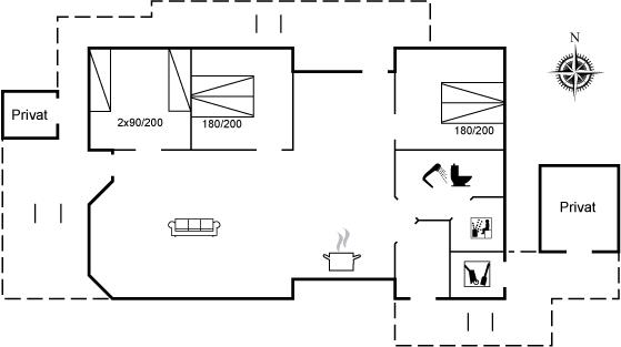 Der er i alt 3 soveværelser. Sovepladserne fordeler sig på: 4 sovepladser i dobbeltsenge. 2 sovepladser i enkeltsenge.