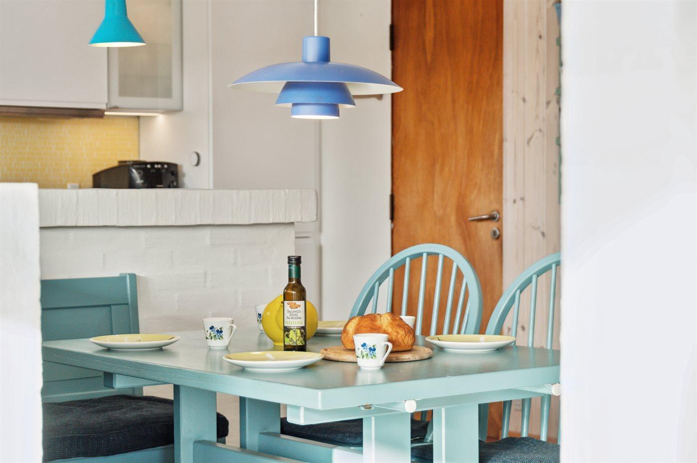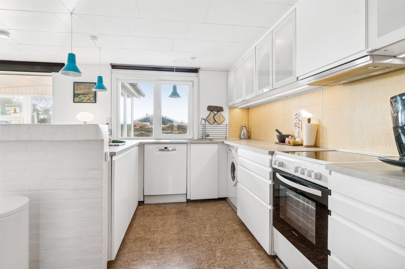 Køkkenet er udstyret med 1 køleskab. Der er 4 keramiske kogeplader, varmluftovn, mikrobølgeovn samt opvaskemaskine.