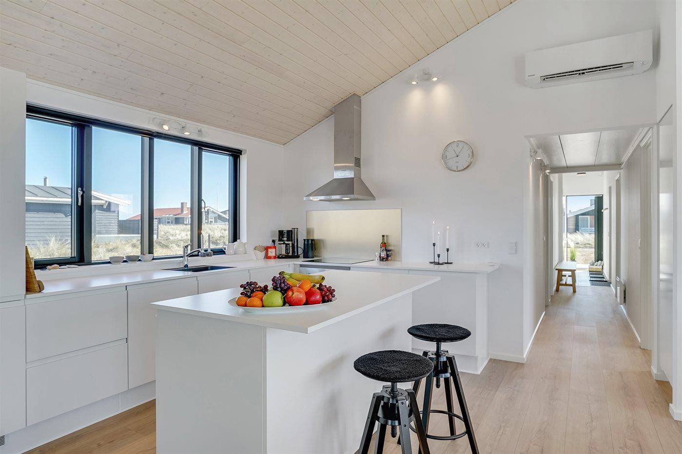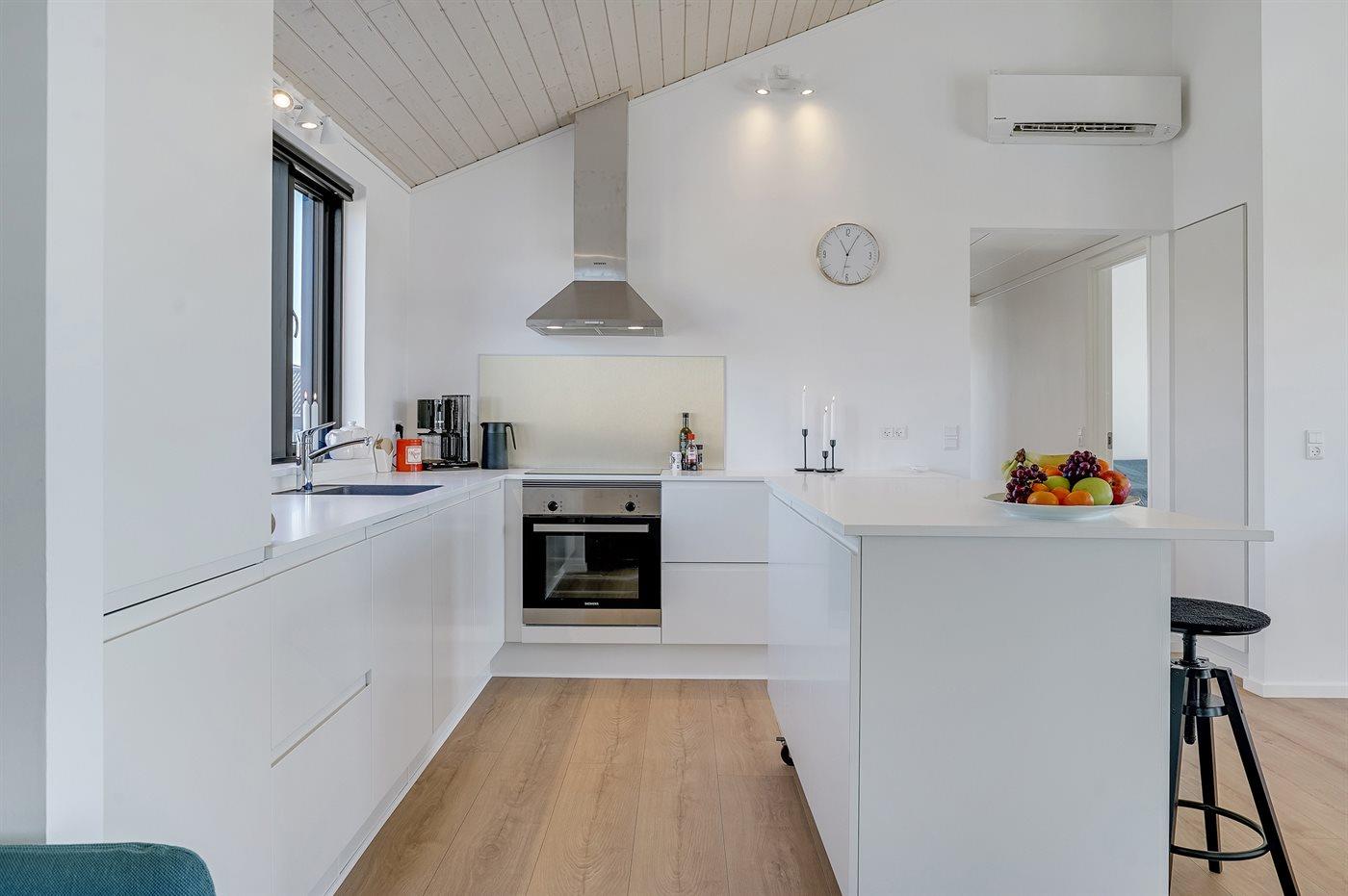 Køkkenet er udstyret med 1 køleskab. Der er 4 induktionskogeplader, varmluftovn, mikrobølgeovn samt opvaskemaskine.