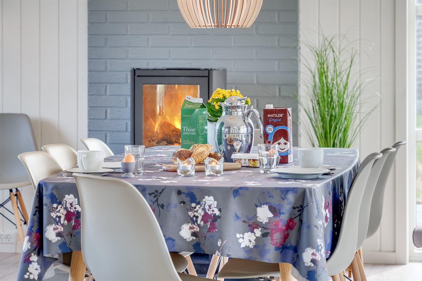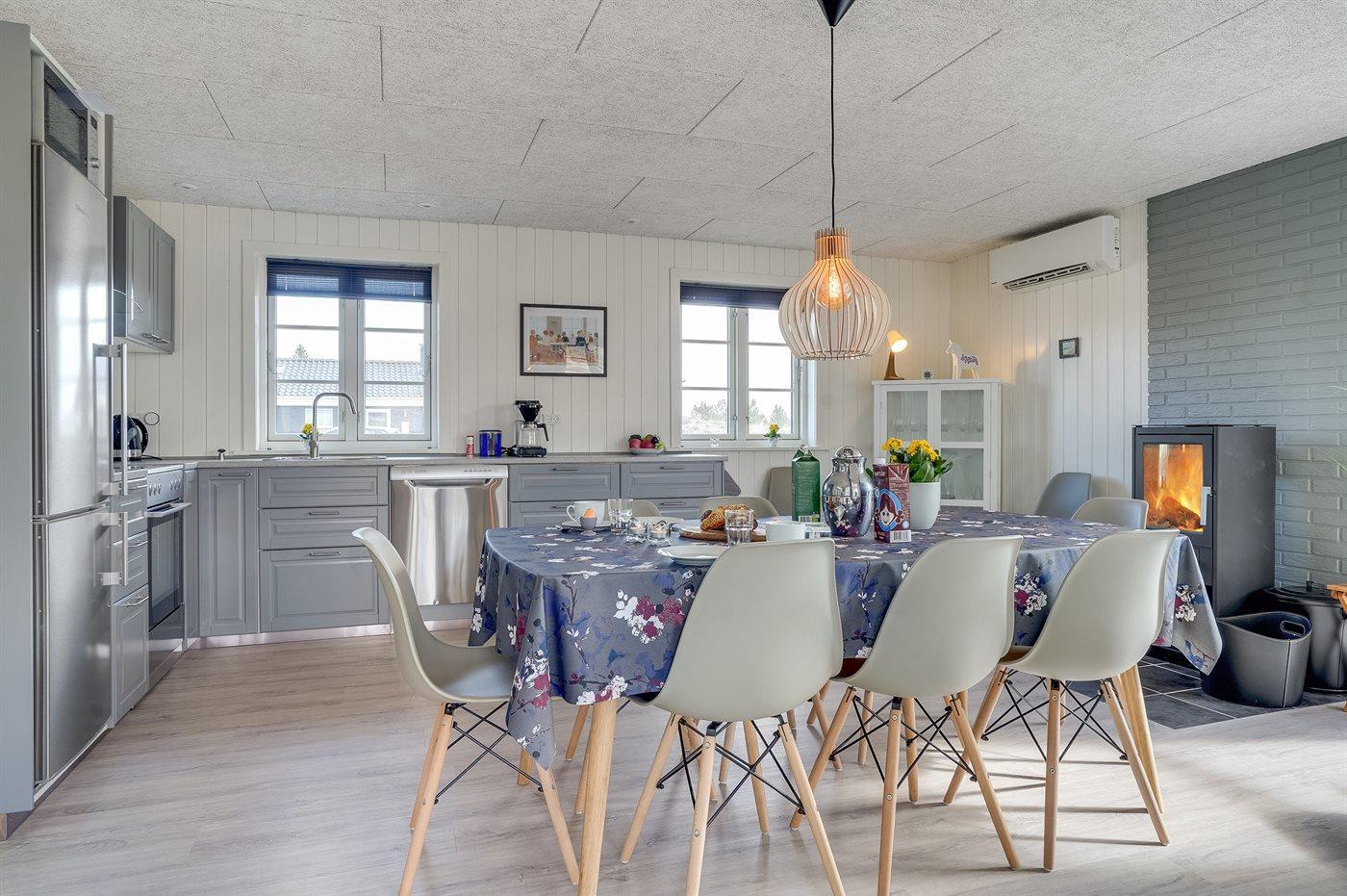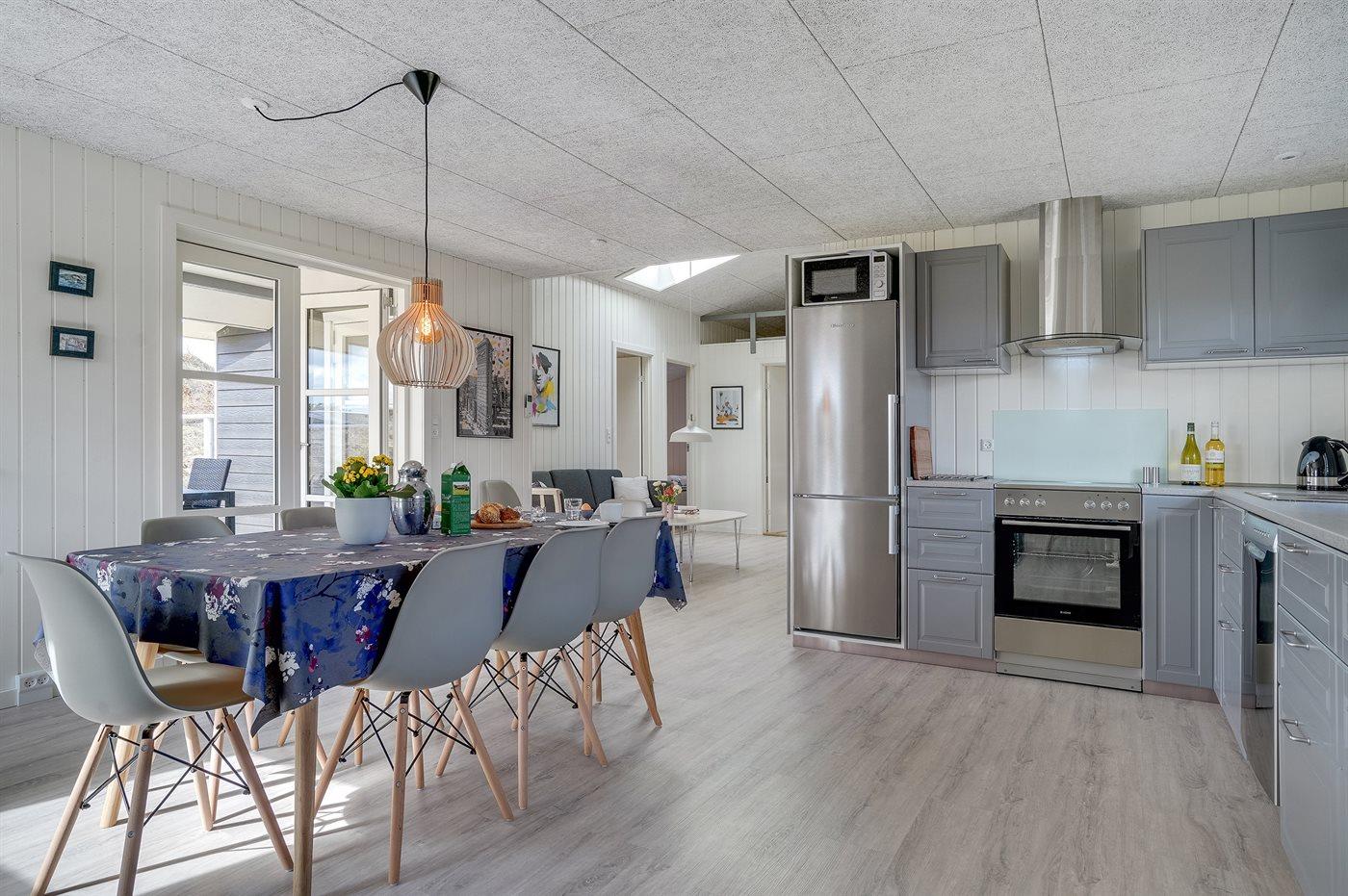Køkkenet er udstyret med 1 køleskab. Der er 4 keramiske kogeplader, varmluftovn samt opvaskemaskine.