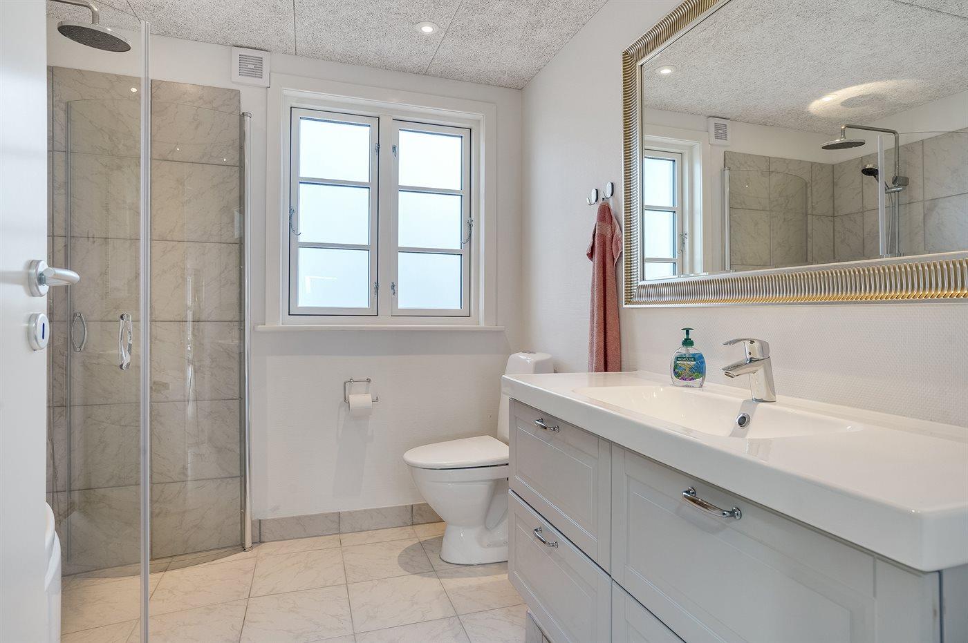 Der er 2 badeværelser med bruseniche og 2 toiletter. Der er gulvvarme på 2 badeværelser.