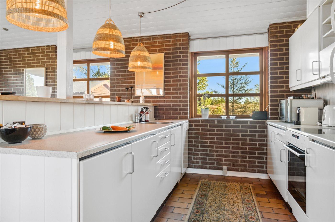 Køkkenet er udstyret med 1 køleskab. Der er 4 keramiske kogeplader, varmluftovn, mikrobølgeovn samt opvaskemaskine.