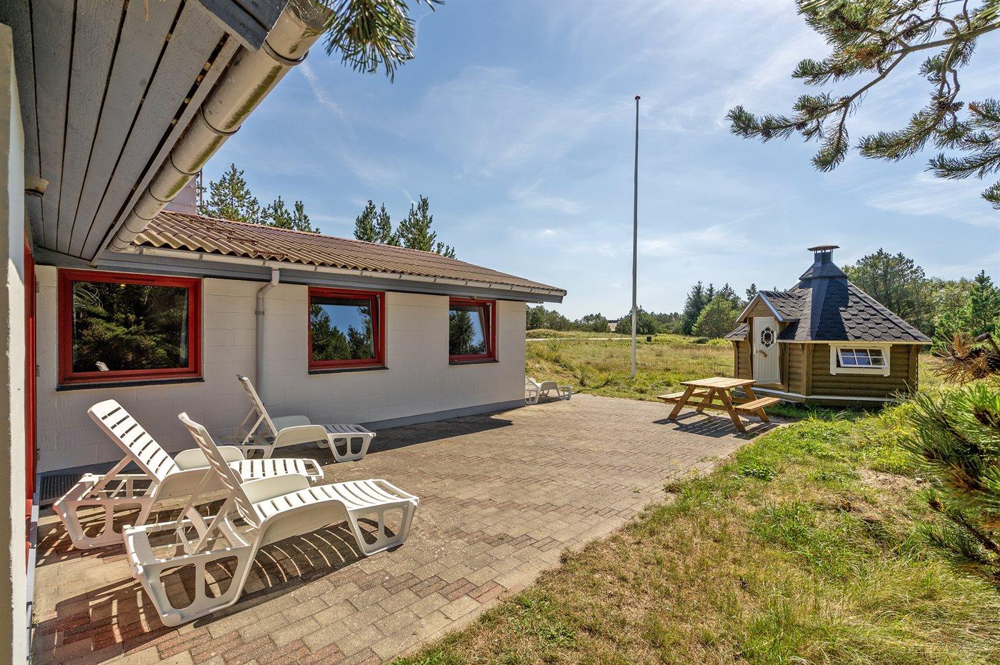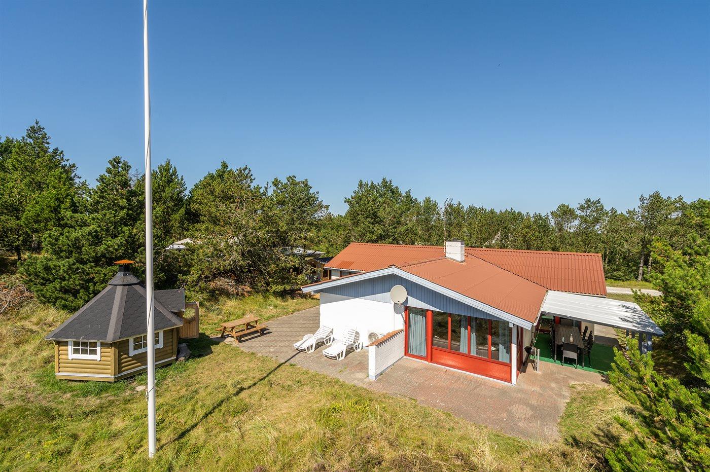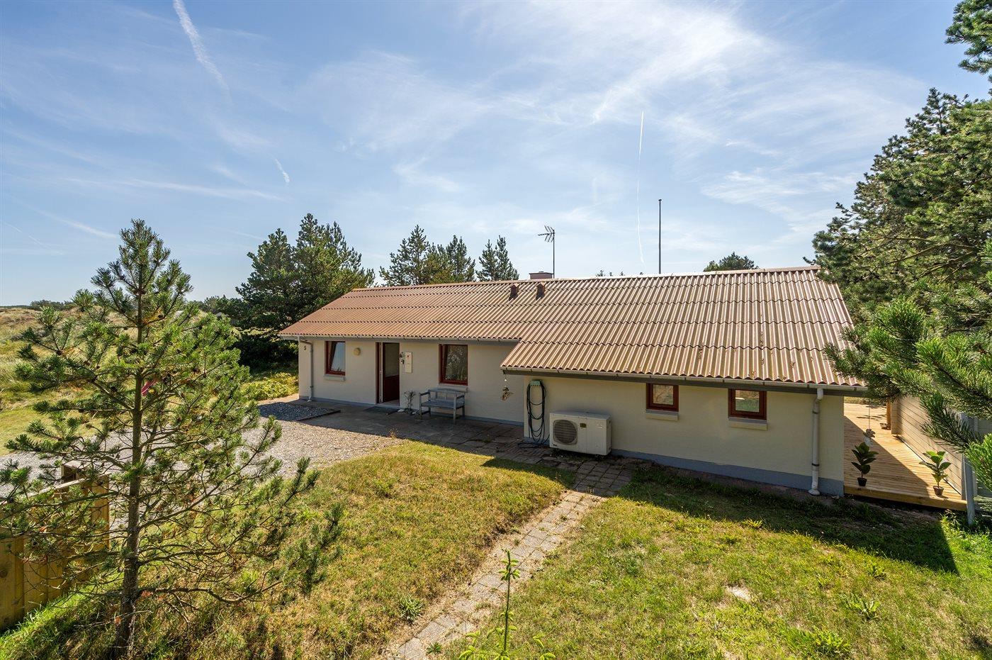 Ferieboligen er beliggende på en 1300 m² stor naturgrund. Der er 900 m til havet. Nærmeste forretning er beliggende i en afstand af 900 m. Til ferieboligen hører åbent og overdækket terrasseareal. Sandkasse. Bålsted. Grill til rådighed. Parkering ved ferieboligen.