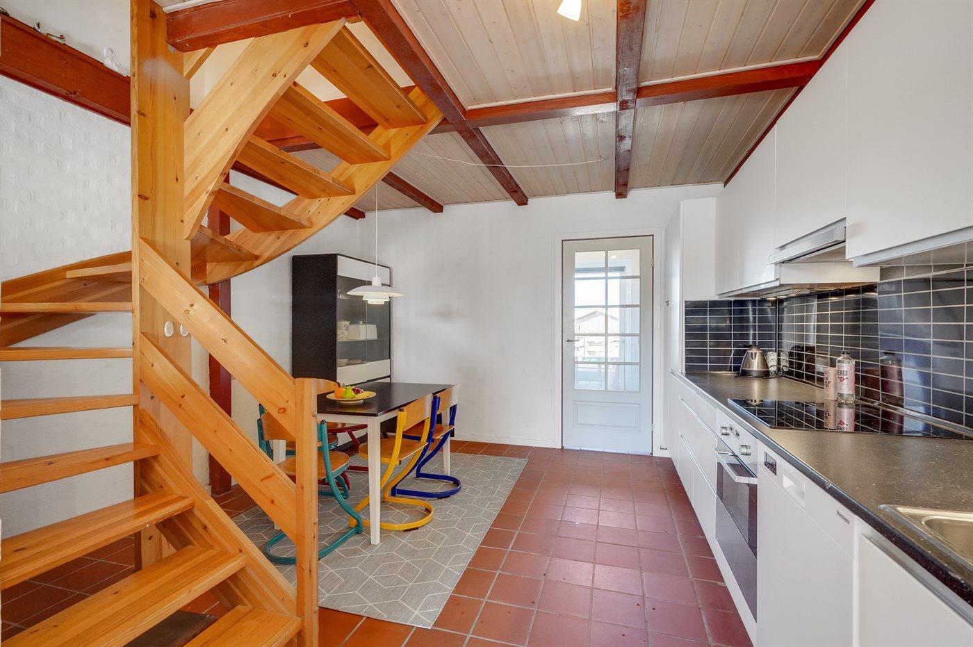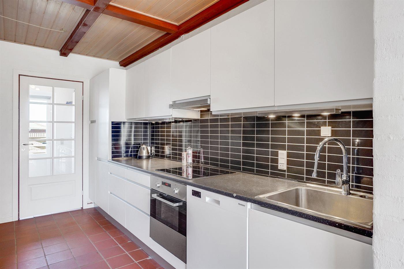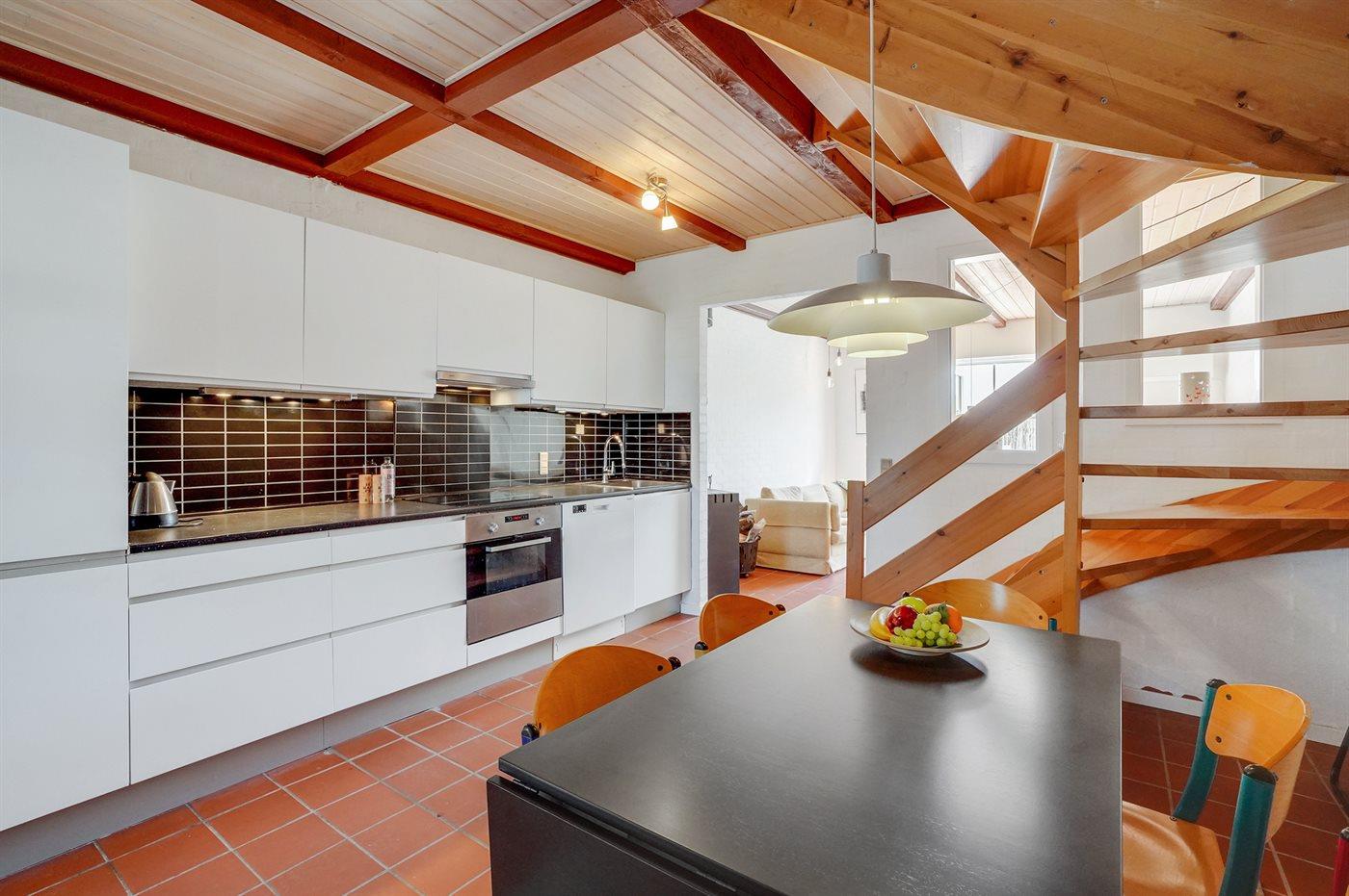 Køkkenet er udstyret med 1 køleskab. Der er 4 induktionskogeplader, varmluftovn, mikrobølgeovn samt opvaskemaskine.