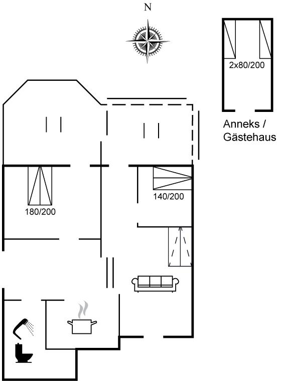 Der er i alt 3 soveværelser. Sovepladserne fordeler sig på: 4 sovepladser i dobbeltsenge. 2 sovepladser i enkeltsenge. 2 sovepladser i sovesofa (dobbelt). 2 af disse sovepladser befinder sig i et anneks og 2 i køkken-alrummet. Derudover er der 1 stk. barneseng.