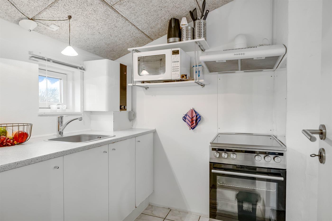 Køkkenet er udstyret med 1 køleskab. Der er 4 elkogeplader, varmluftovn.