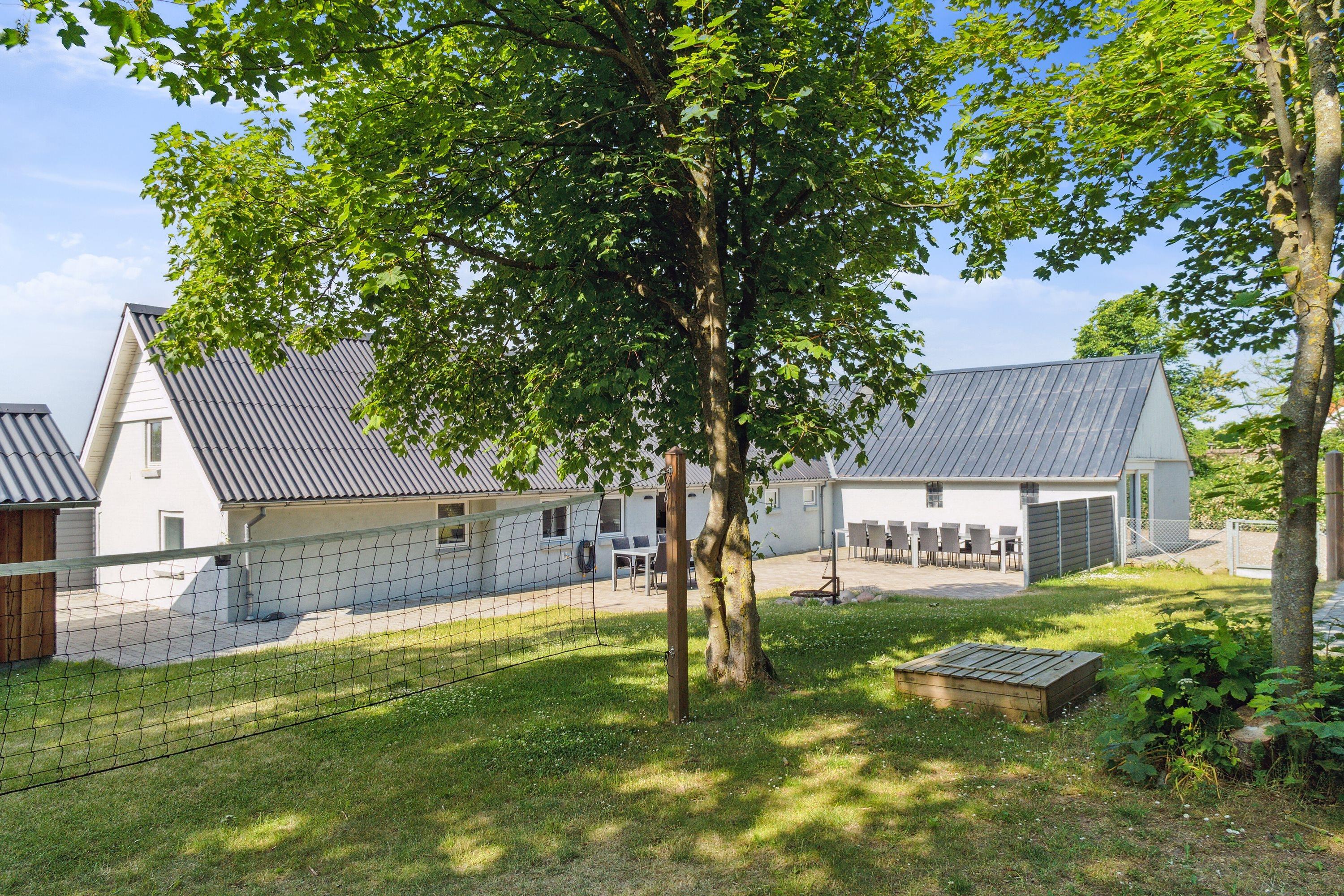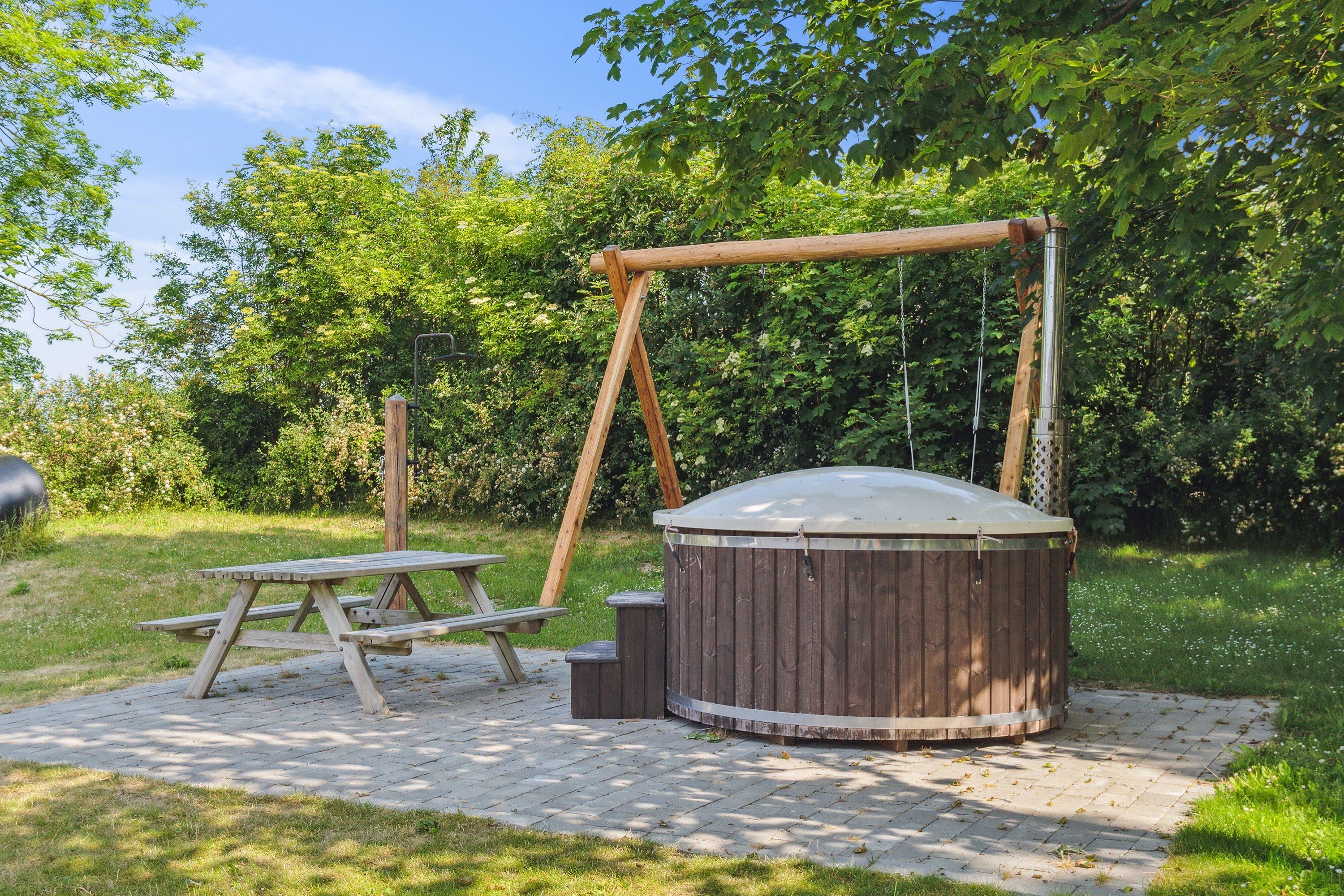Når solen skinner, kan du nyde de udendørs faciliteter, der inkluderer en stor terrasse, grillområde, gynger, sandkasse og et bålsted, perfekt til hyggelige aftener under stjernerne. Derudover er der et vildmarksbad, der kan rumme op til 5 personer, så du kan slappe af og nyde den friske luft. For de mere aktive, er der også en darttavle, et stort net til boldspil og en rutsjebane til børnene.
