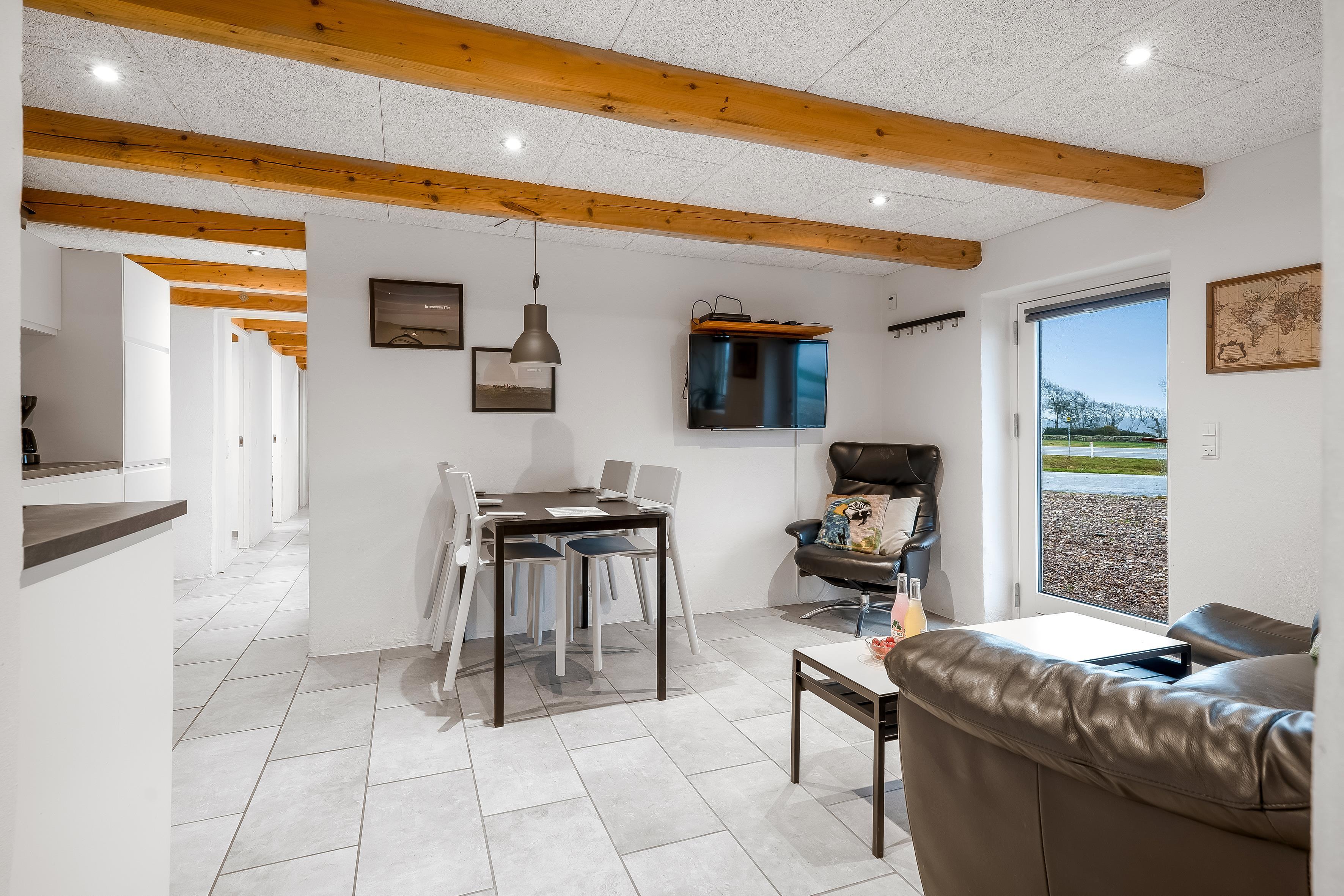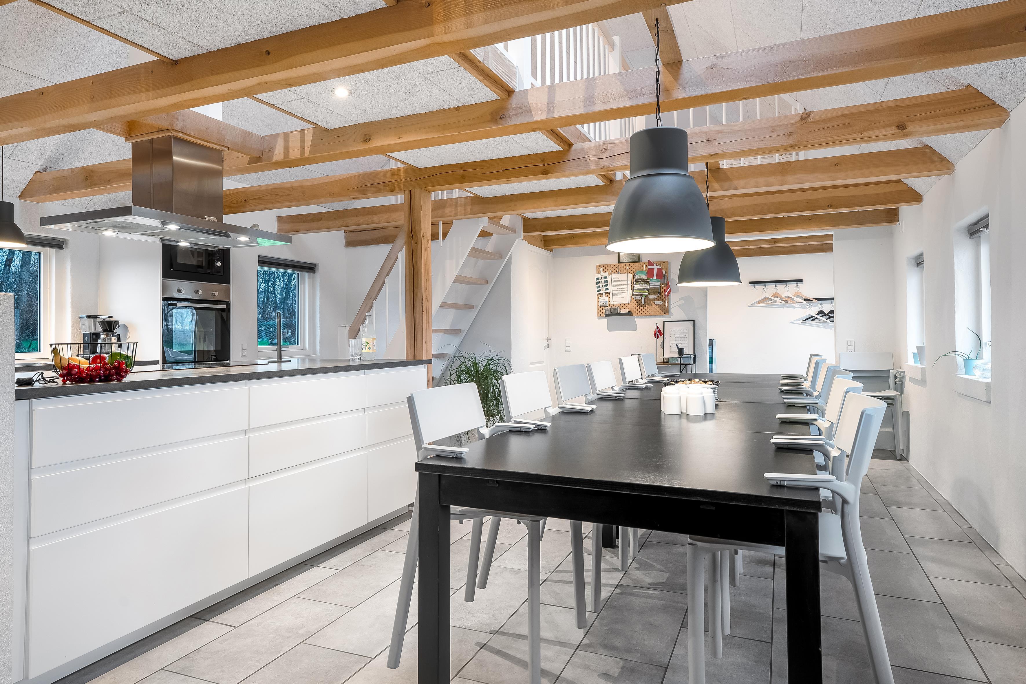 Stuen er indbydende og rummelig. Husets to fjernsyn byder på masser af underholdning, hvor både tysk og dansk TV er tilgængeligt i ferieboligen. Trådløst internet og Chromecast gør det nemt at streame dine yndlingsfilm og serier. Køkkenet er veludstyret med moderne apparater, herunder mikrobølgeovn, ovn, keramisk komfur, opvaskemaskine, køleskab og fryser, så du kan tilberede lækre måltider til hele gruppen.
