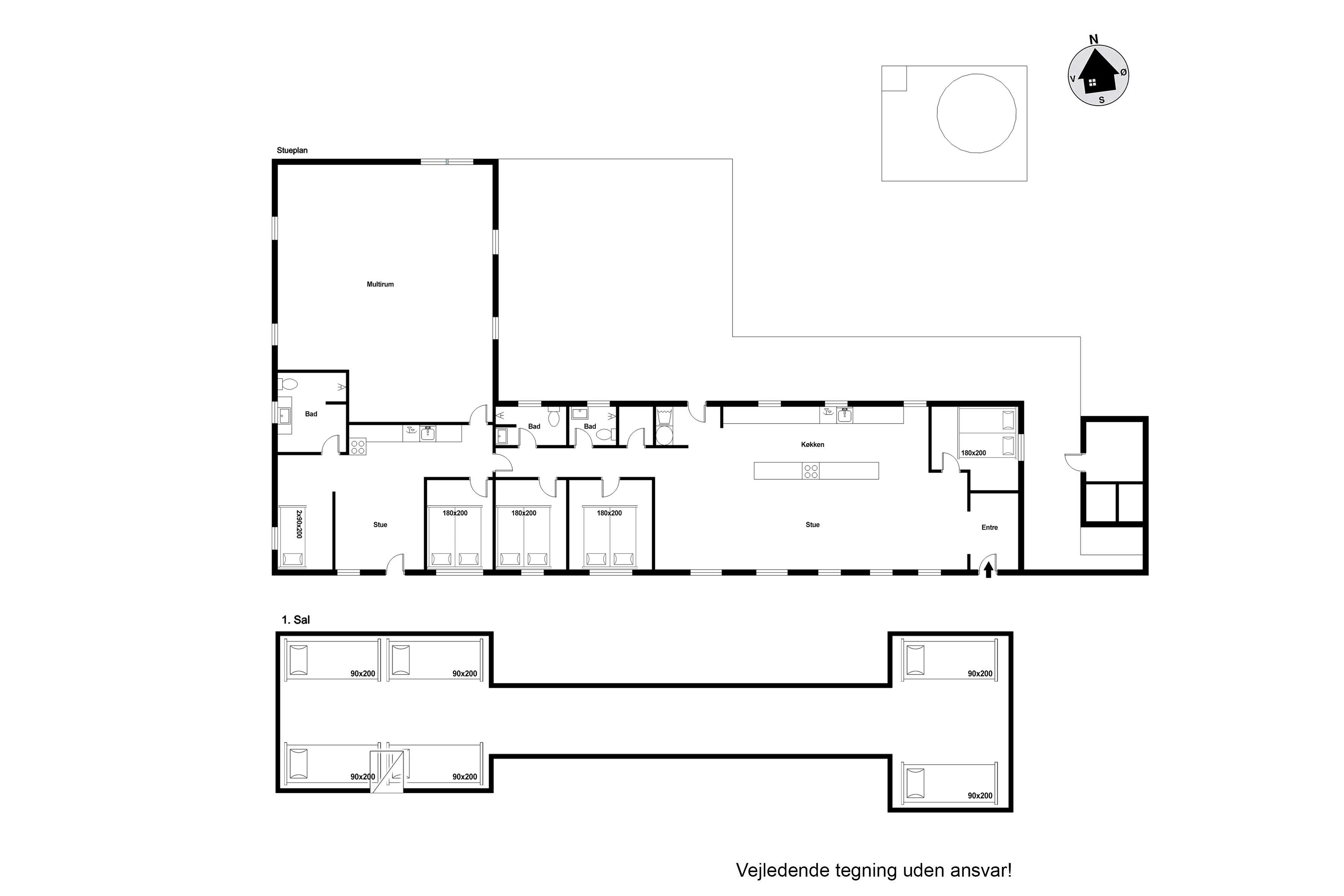 Ejendommens indretning er både funktionel og komfortabel. Der er i alt 4 soveværelser, herunder tre med dobbeltsenge, et med køjesenge og i forbindelse med stuen er der en køjeseng. Dertil kommer der ekstra sovepladser på husets store hems, hvor op til 6 personer kan sove. Med 3 badeværelser er der rigelig plads til alle, også når morgenrutinerne skal klares. Badeværelserne er udstyret med gulvvarme, så du kan starte dagen komfortabelt, selv på kolde vintermorgener.