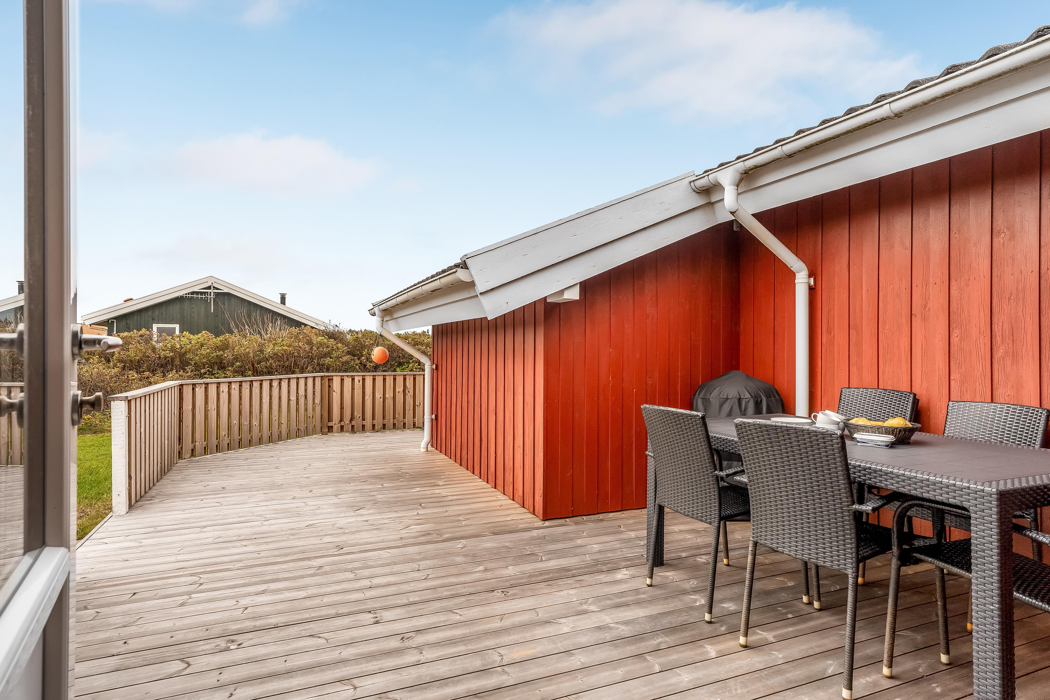 Udenfor kan du nyde den overdækkede terrasse, hvor du kan spise al fresco eller simpelthen slappe af med en god bog. Den ikke overdækkede del af terrassen er ideel til solbadning og grillfester, da der er en grill til rådighed. Terrassen er desuden lukket af med hegn, perfekt til at lade husdyret boltre sig eller for børnene at lege sikkert.