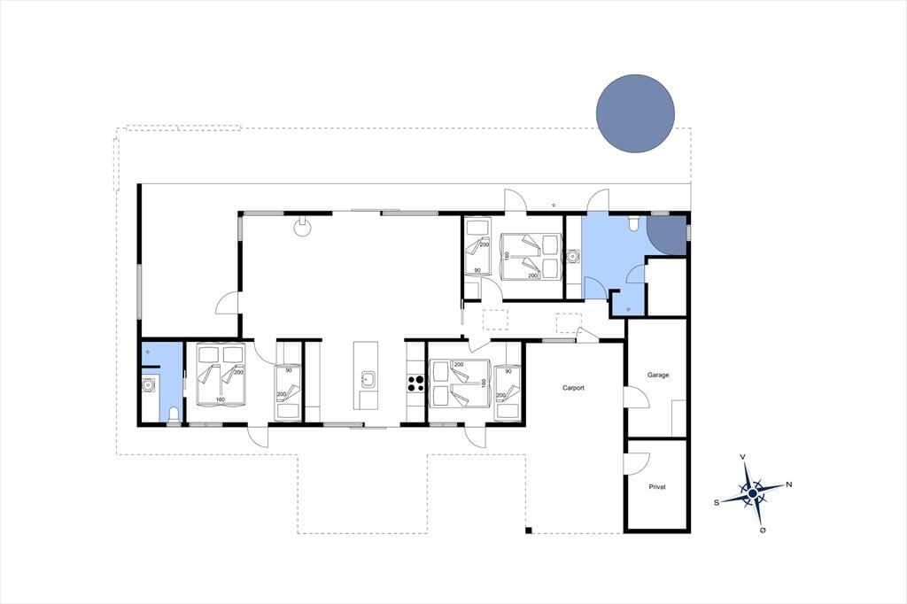 Udendørsbruseren er del af husets flotte og delvist overdækkede terrassemiljø, der vender ud mod fjorden. Foran huset er der carport og et grusbelagt parkeringsareal, mens baghavens græsplæne strækker sig helt ned til stranden. Grunden er stor, så der er masser af plads til leg og boldspil, og med gynger, sandkasse og petanquebane er der aktivitetsmuligheder for hele familien.