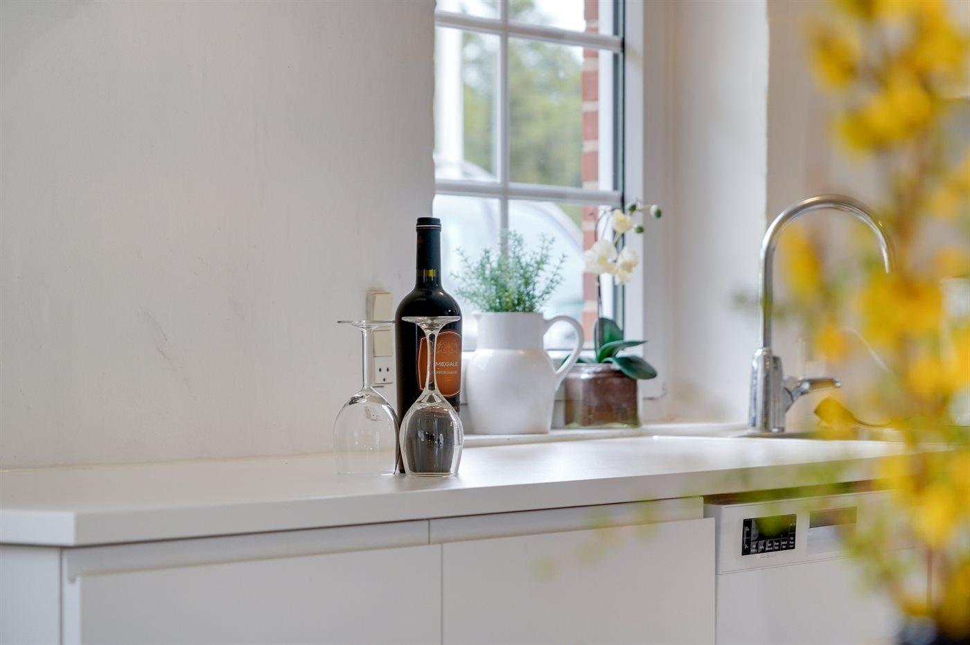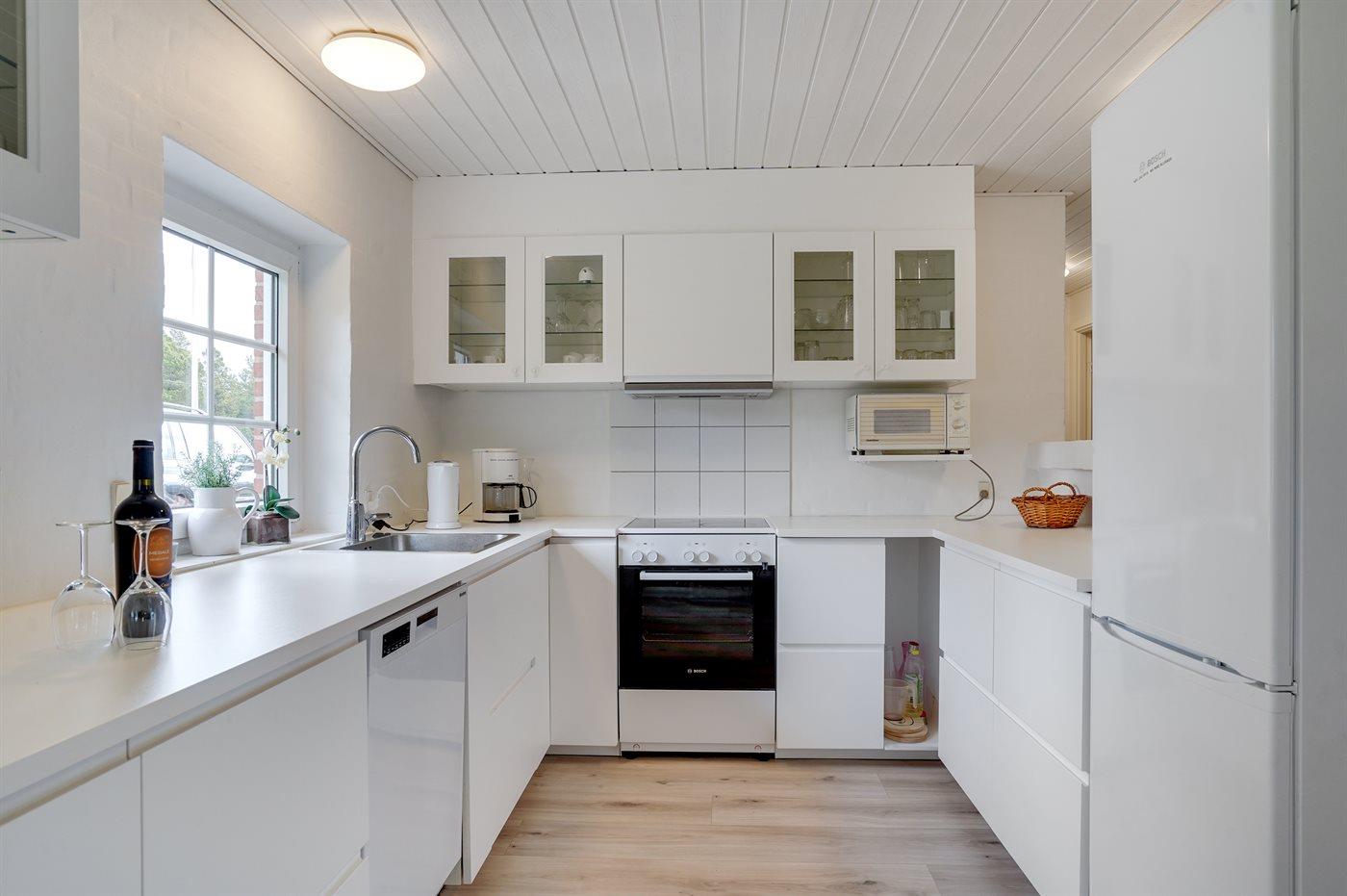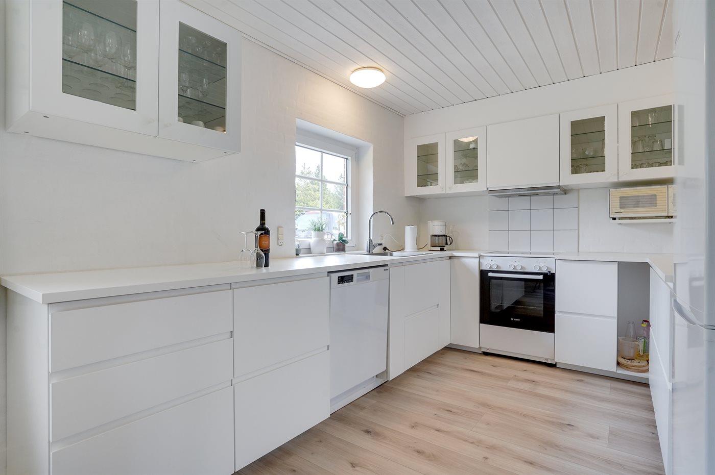 Køkkenet er udstyret med 1 køleskab. Der er 4 elkogeplader, bageovn, mikrobølgeovn samt opvaskemaskine.
