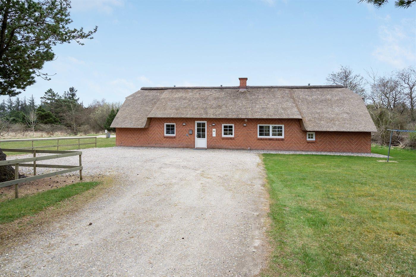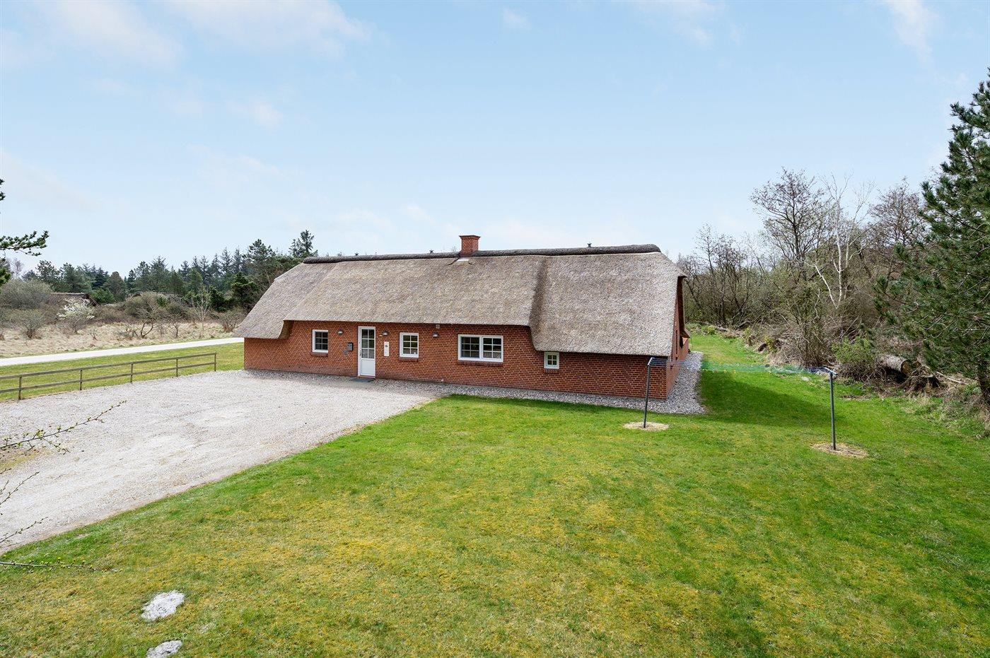 Dette skønne sommerhus med stråtag ligger på en flot naturgrund, som er delvist omkranset af træer.