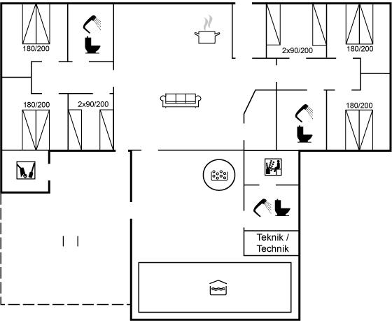 Der er i alt 6 soveværelser. Sovepladserne fordeler sig på: 8 sovepladser i dobbeltsenge. 4 sovepladser i enkeltsenge. Derudover er der 1 stk. barneseng.