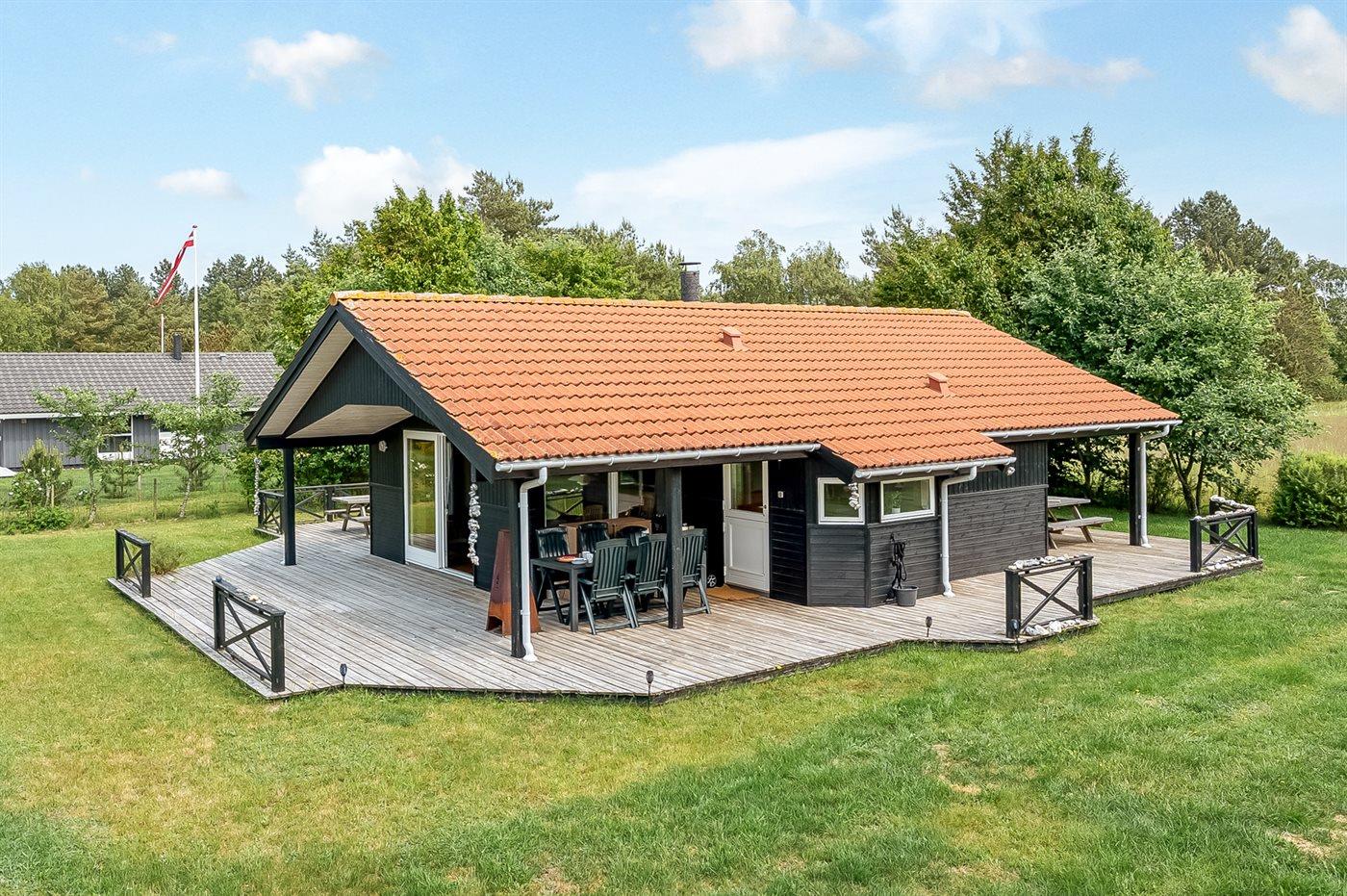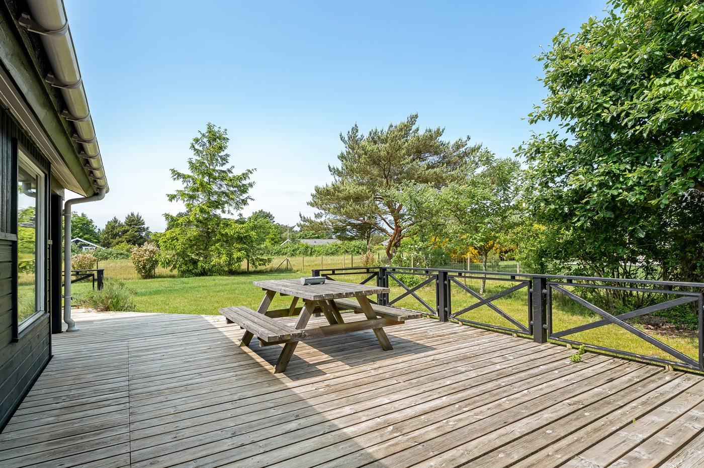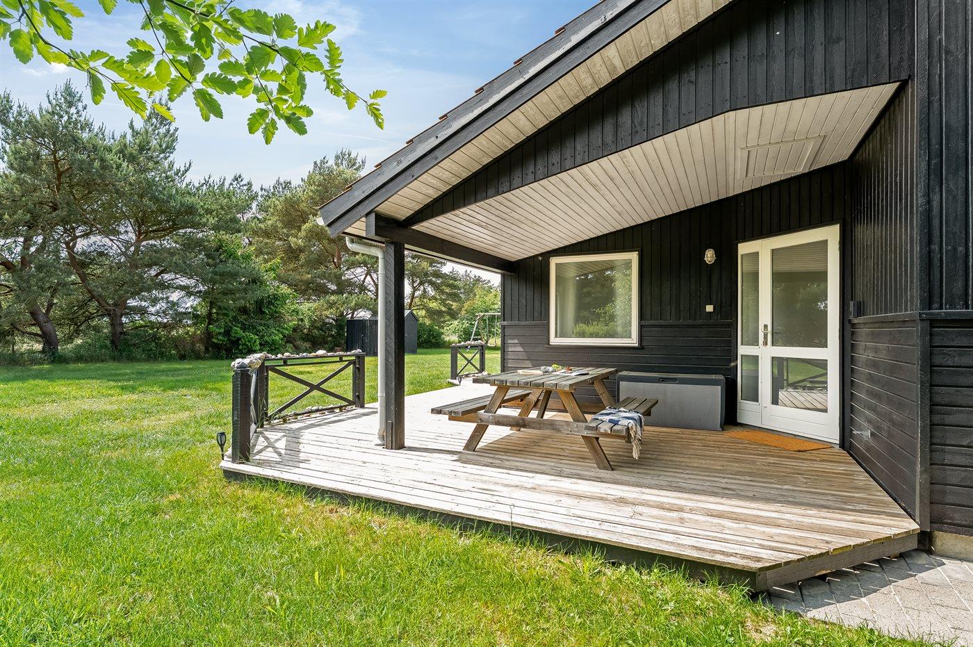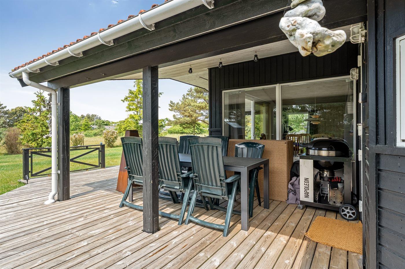 Dejligt sommerhus i træ, bygget i 2004, beliggende kun 150 m fra havet på en indhegnet naturgrund med beplantning. Til huset hører stor åben terrasse og 2 overdækkede terrasser med diverse havemøbler. Indvendig er der dels trævægge, dels malede vægge samt trælofter. Trægulve, dog klinker i badeværelse og gang. Dejligt badeværelse med gulvvarme, bruseniche og vaskemaskine. Det åbne køkken har gulvvarme og er udstyret med bl.a. opvaskemaskine, mikrobølgeovn og komfur med keramiske kogeplader. Skøn opholdsstue med brændeovn, DVD-afspiller, TV og stereoanlæg med CD-afspiller. Sovepladserne er fordelt på 1 værelse med dobbeltseng og 1 med 2 køjesenge. Desuden anneks med 2 enkeltsenge og lille tekøkken. Til de små feriegæster er der høj barnestol til rådighed.