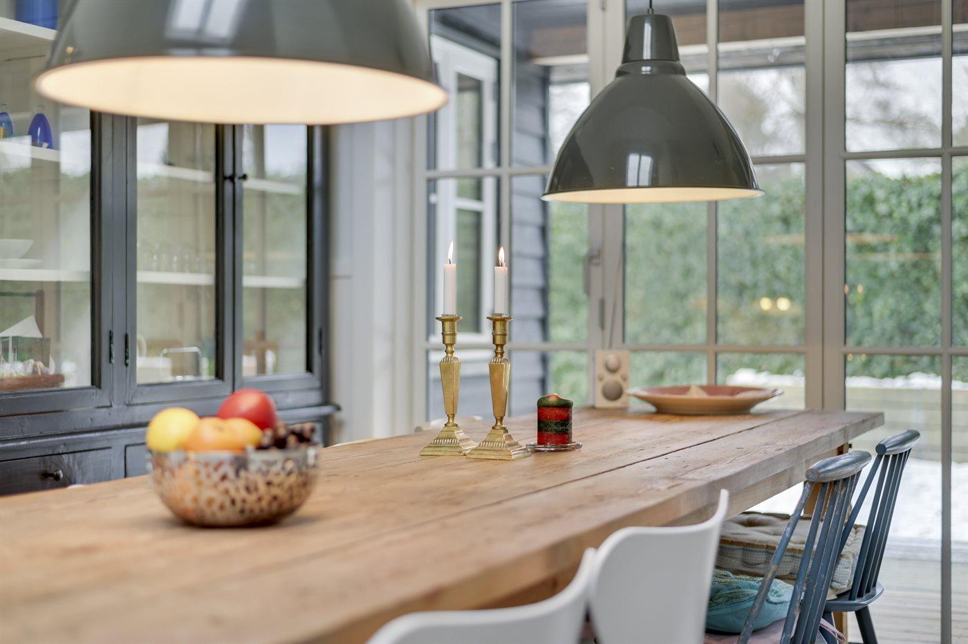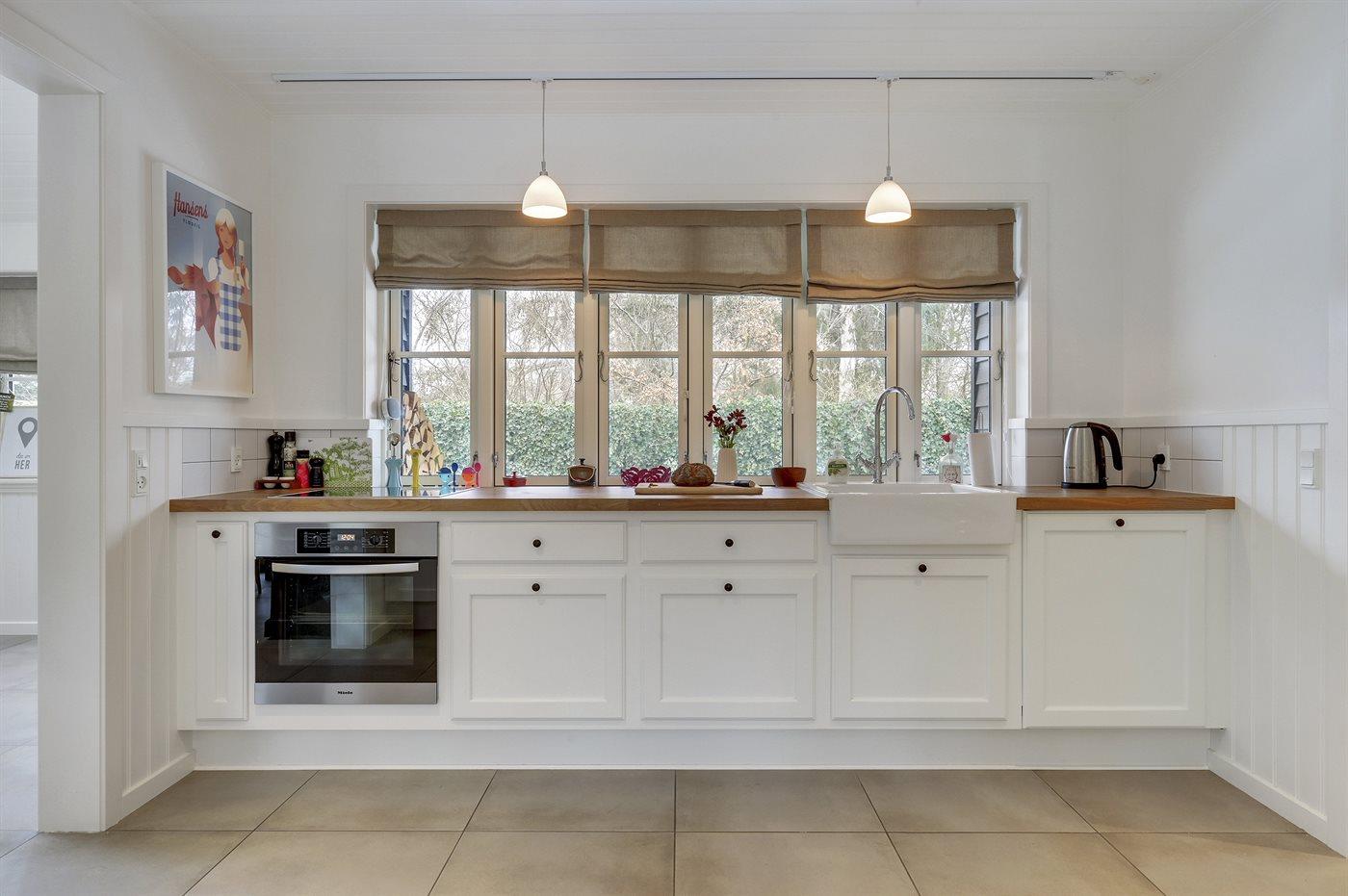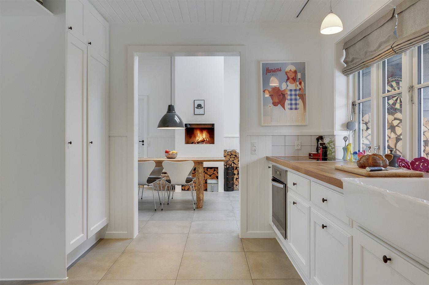 Køkkenet er udstyret med 1 køleskab. Der er 4 keramiske kogeplader, varmluftovn samt opvaskemaskine Der er gulvvarme i køkkenet.