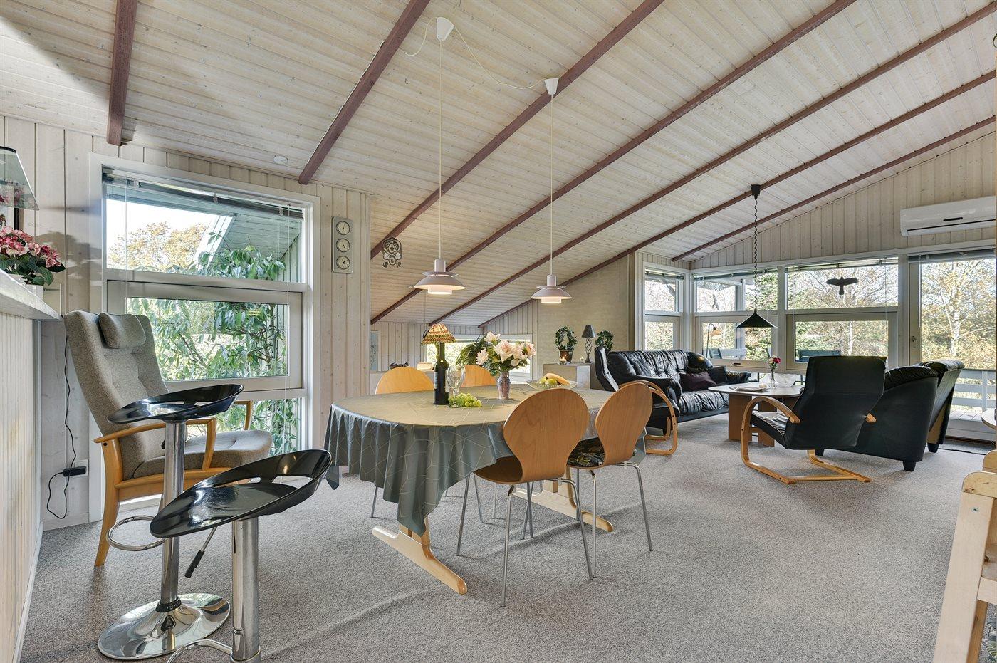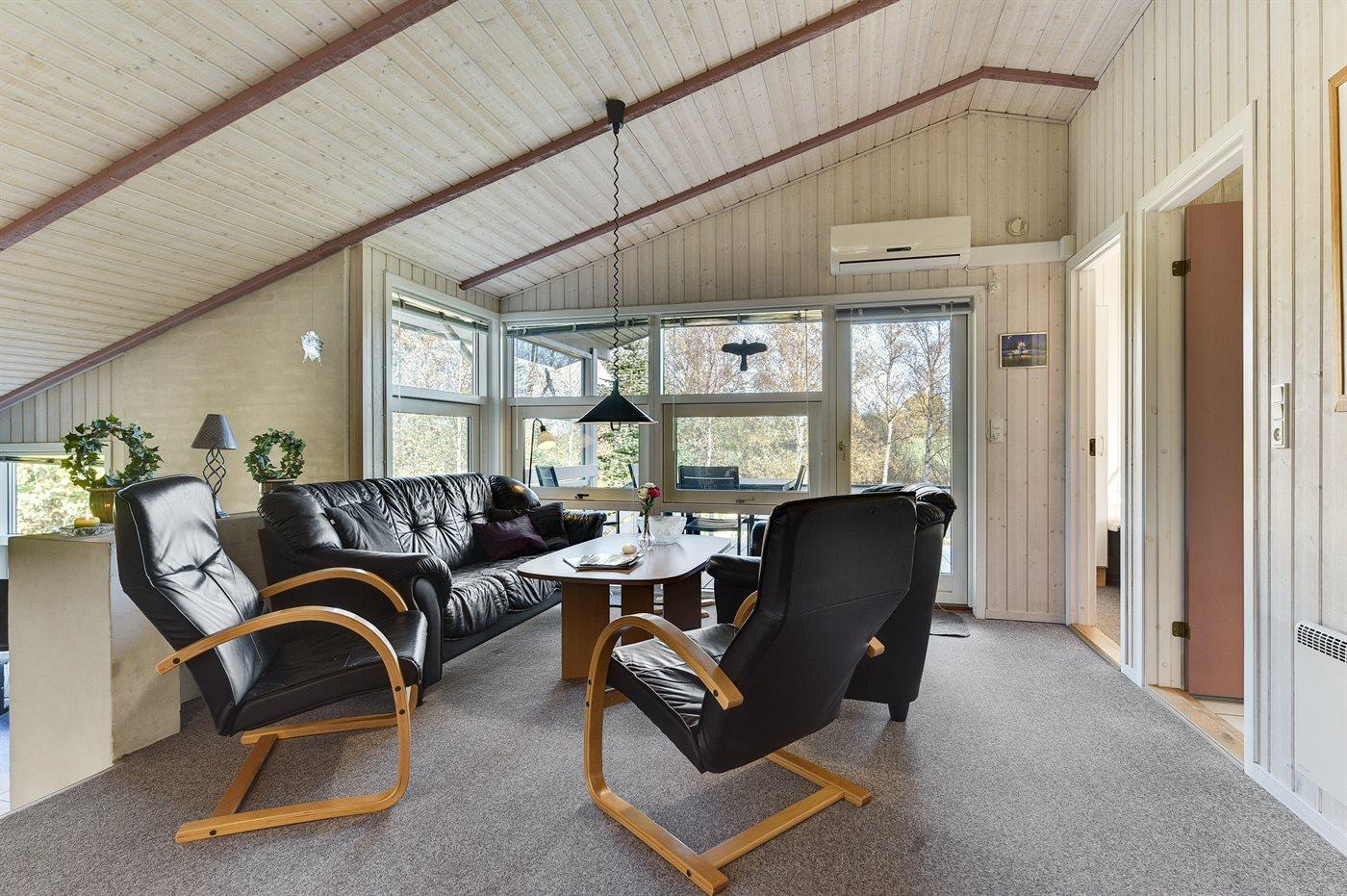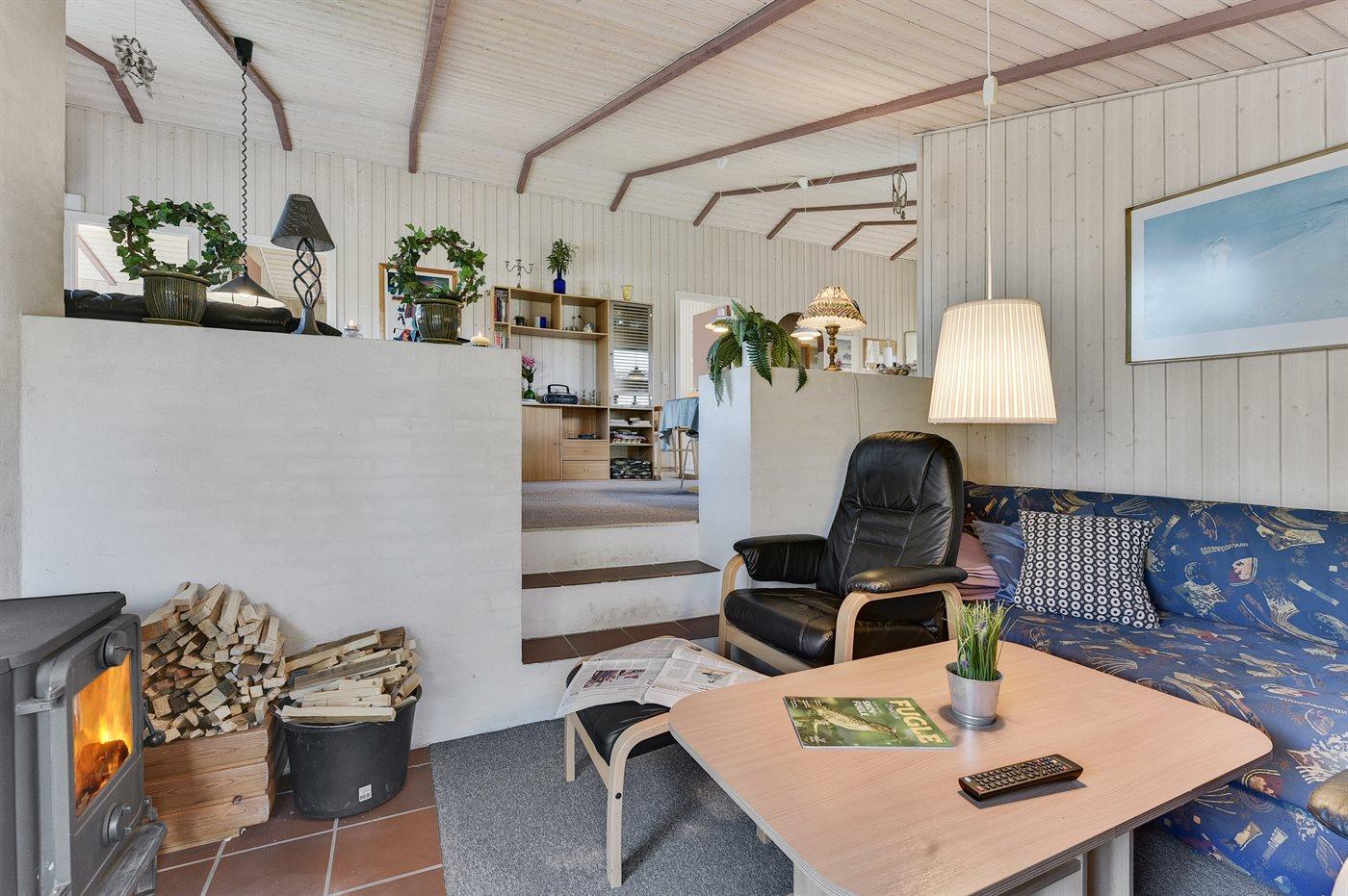 Feriehuset kan opvarmes via brændeovnen eller el-radiatorer samt varmepumpen som også kan bruges som klimaanlæg.